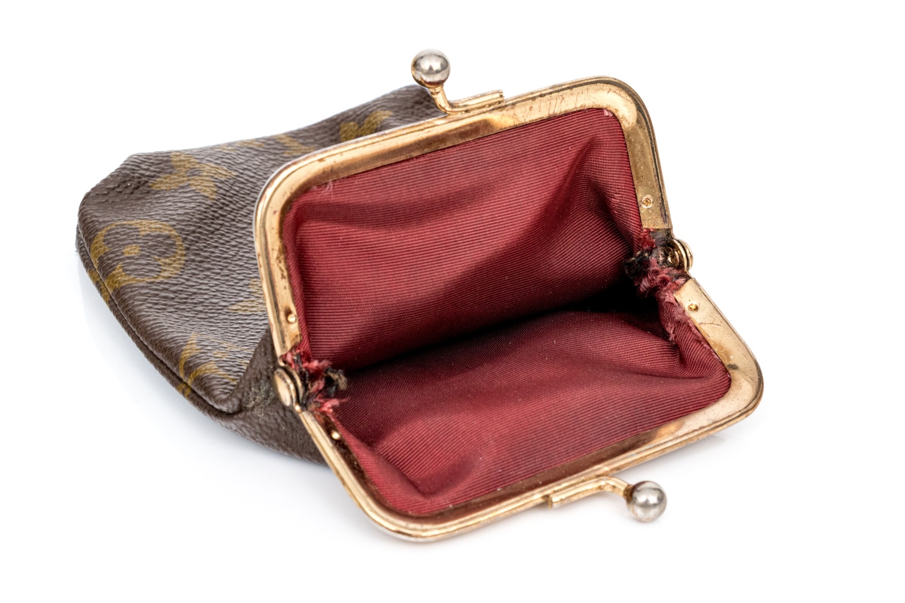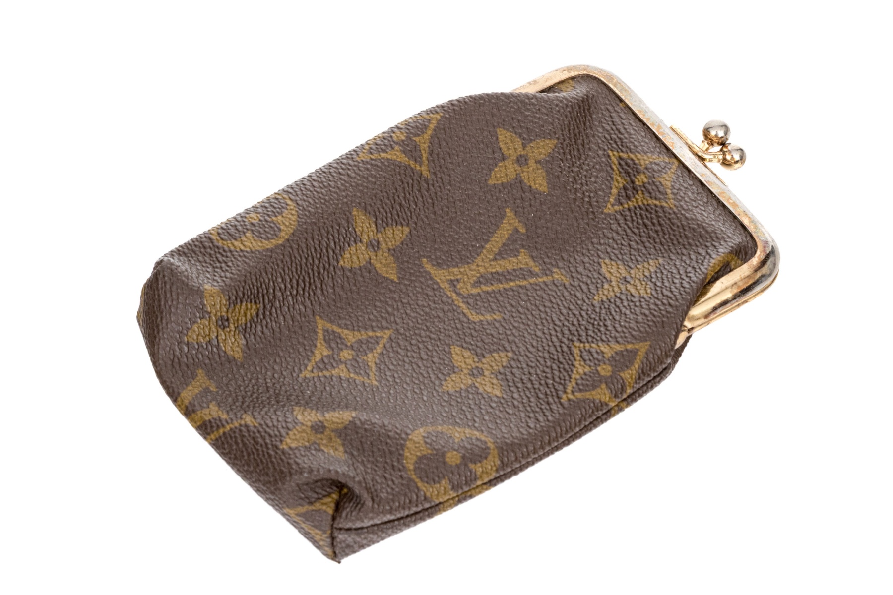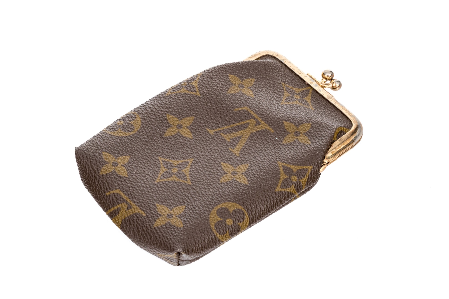 Louis Vuitton vintage unsigned coated canvas logo change purse, with classic Louis Vuitton logo patterning on a vintage kisslock frame