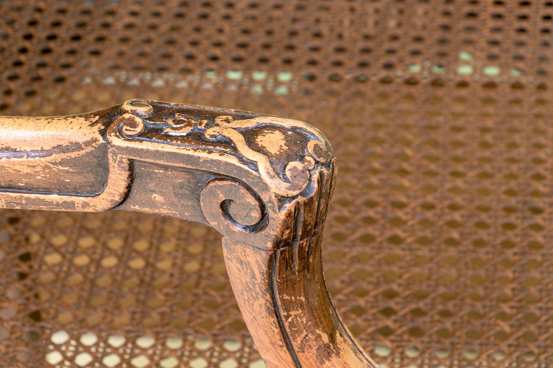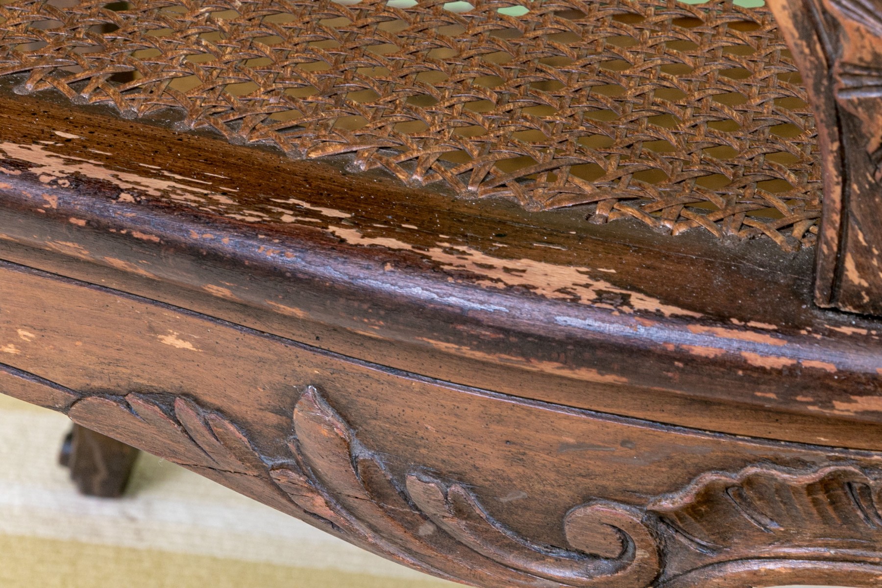 Raised on cabriole legs with carved decorative embellishment in relief to the seat rail, arms and seat back frame.