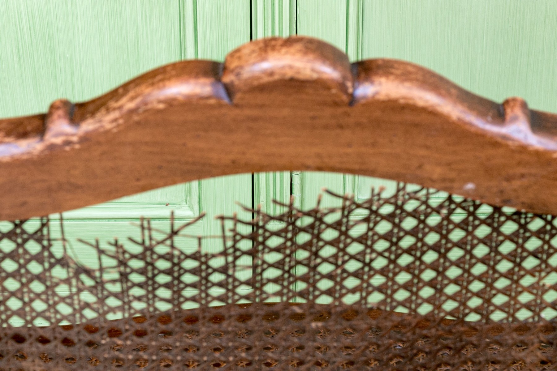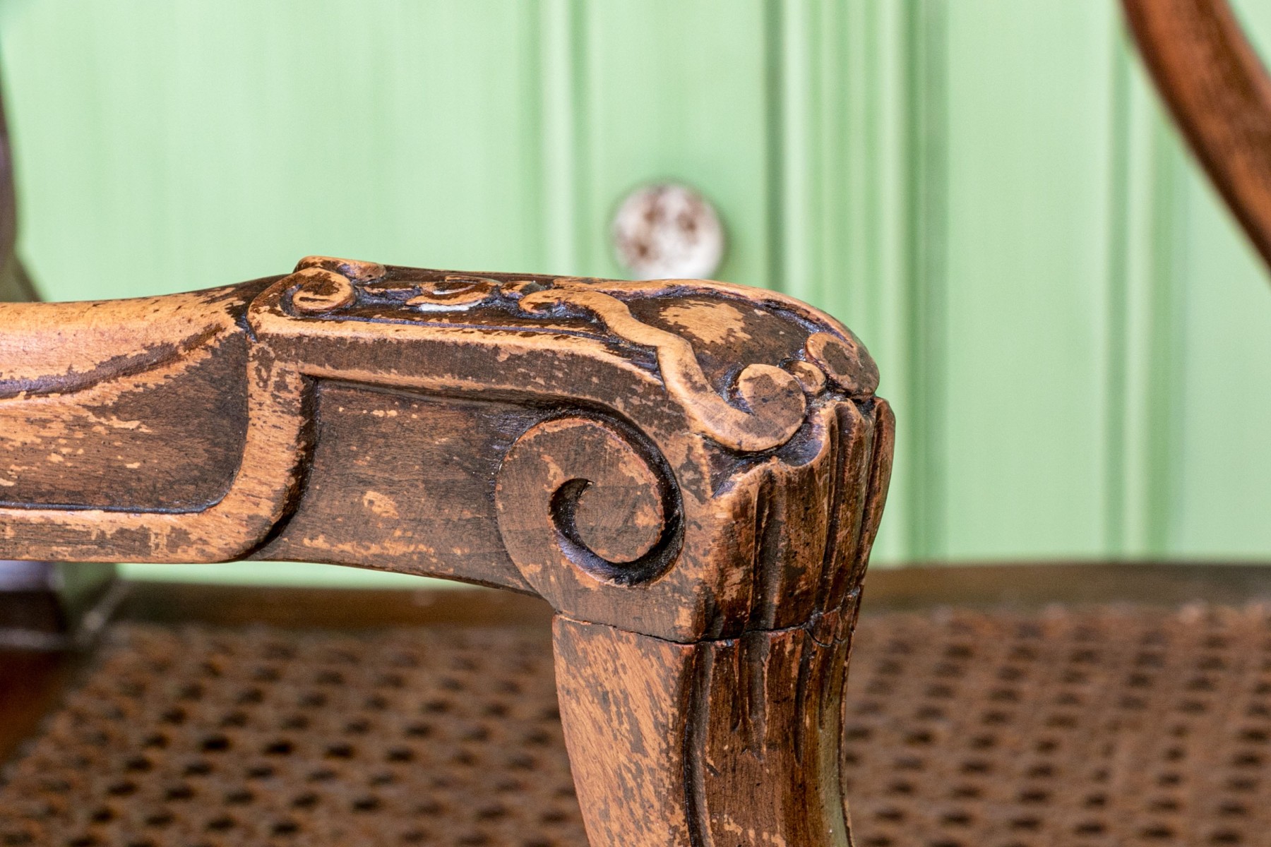 For repair, there is heavy breakage to caning on backs of chair. Nicks and scratches throughout each frame