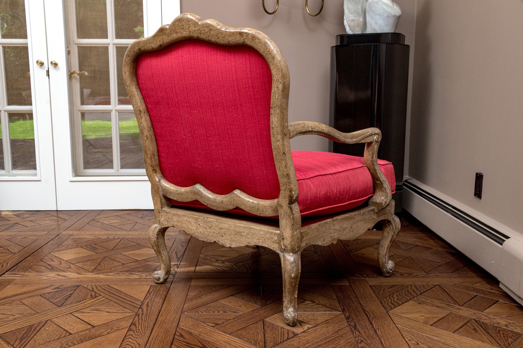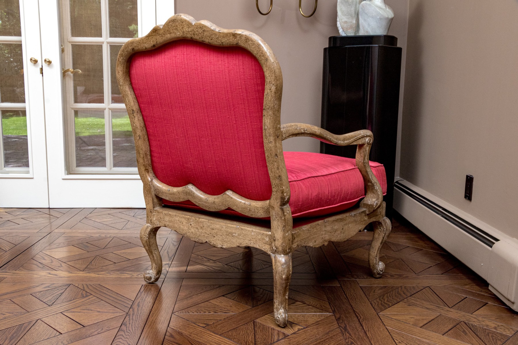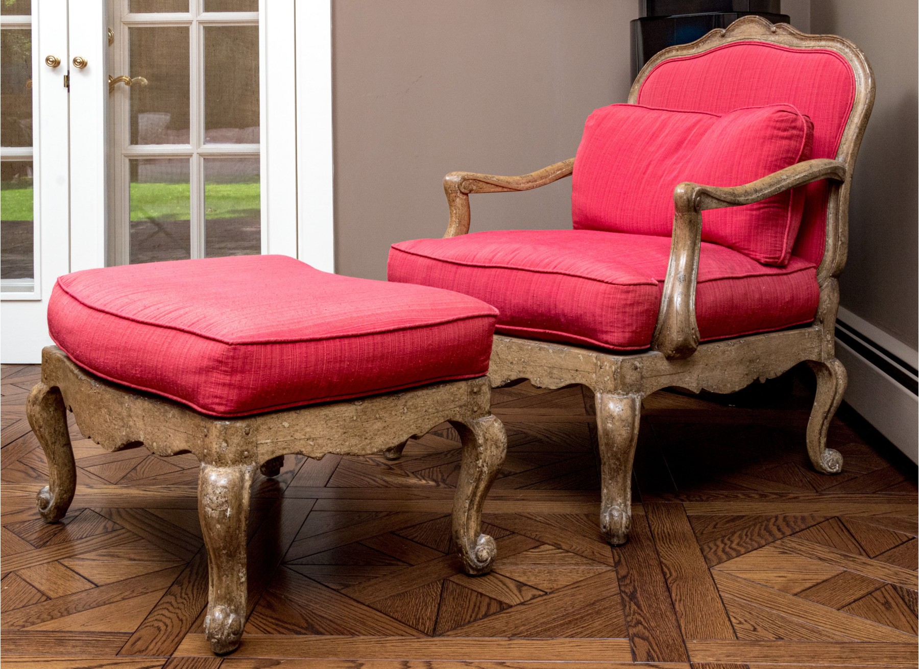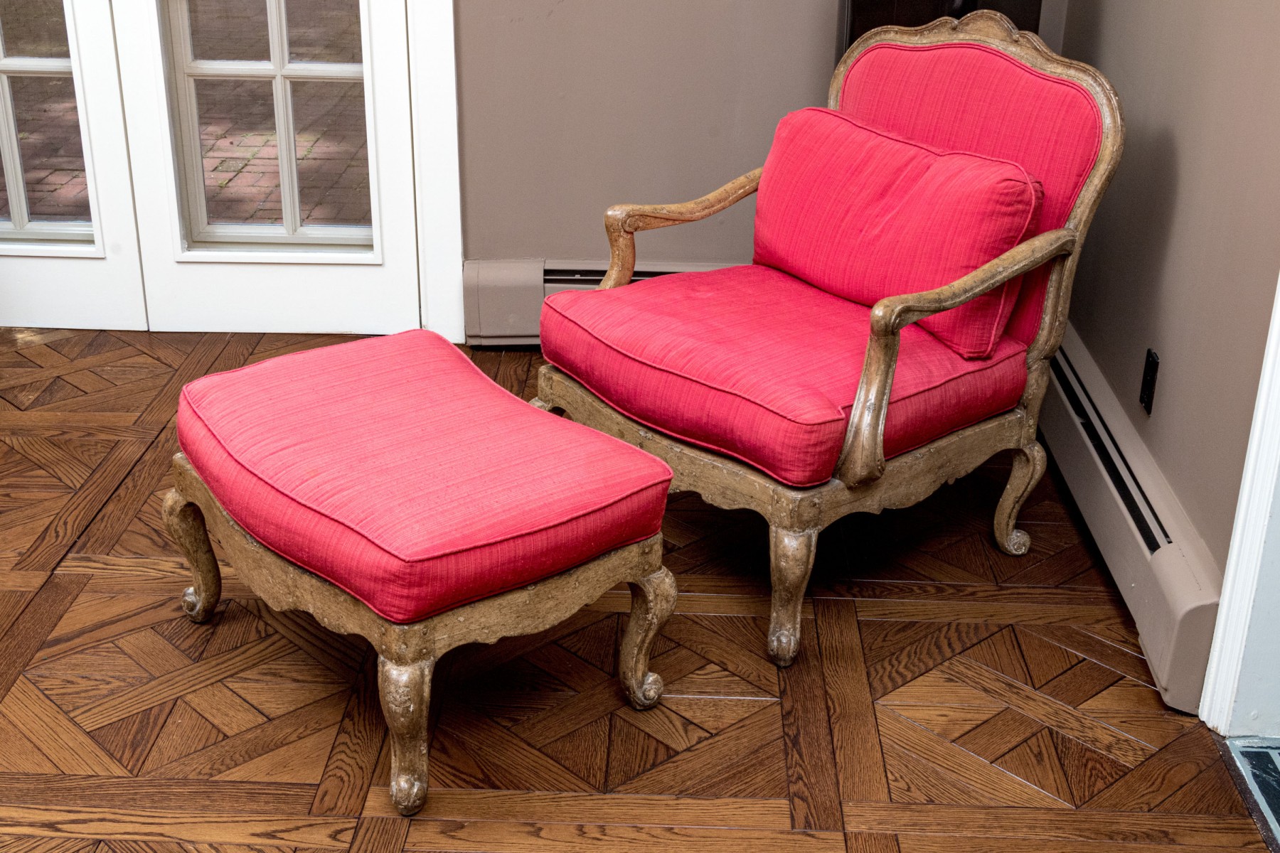 A handsome Louis XV style upholstered chair paired with a matching ottoman, both crafted from intricately carved wood. The chair exudes classic elegance, while the ottoman (31 x 21 x 17"H) offers comfort and versatility. Accompanied by a bolster (24 x 13"H), this custom-upholstered set captures the essence of refined French design, perfect for adding a touch of luxury to any living space.