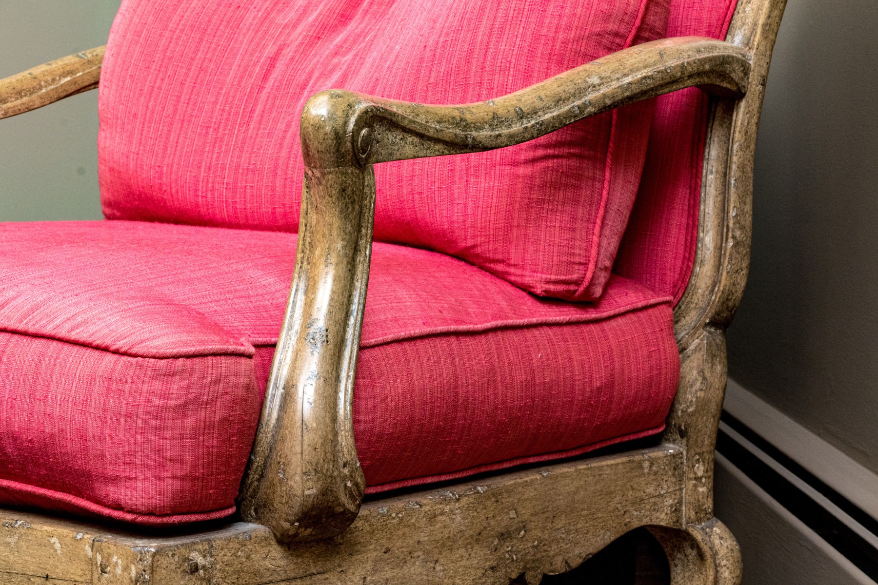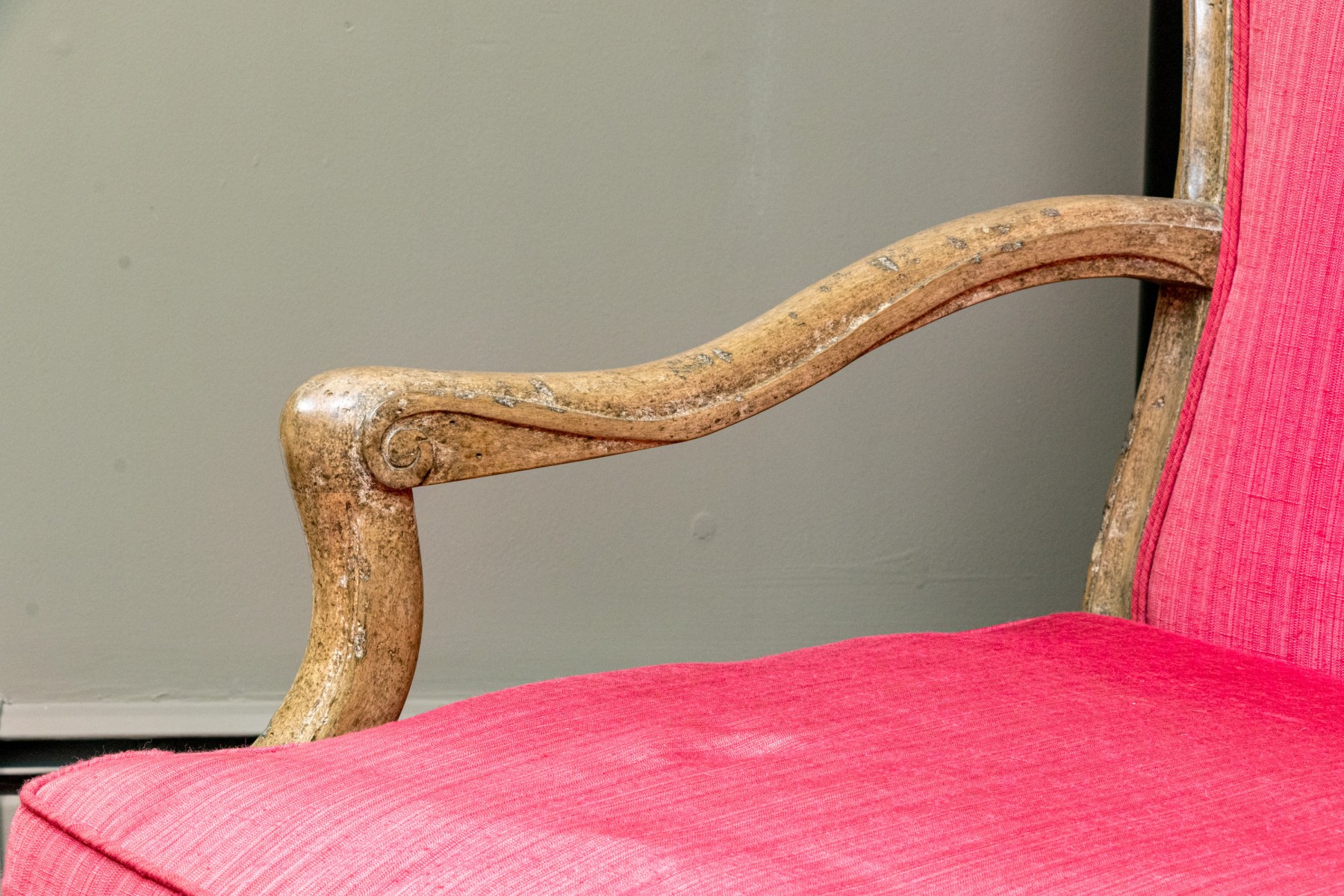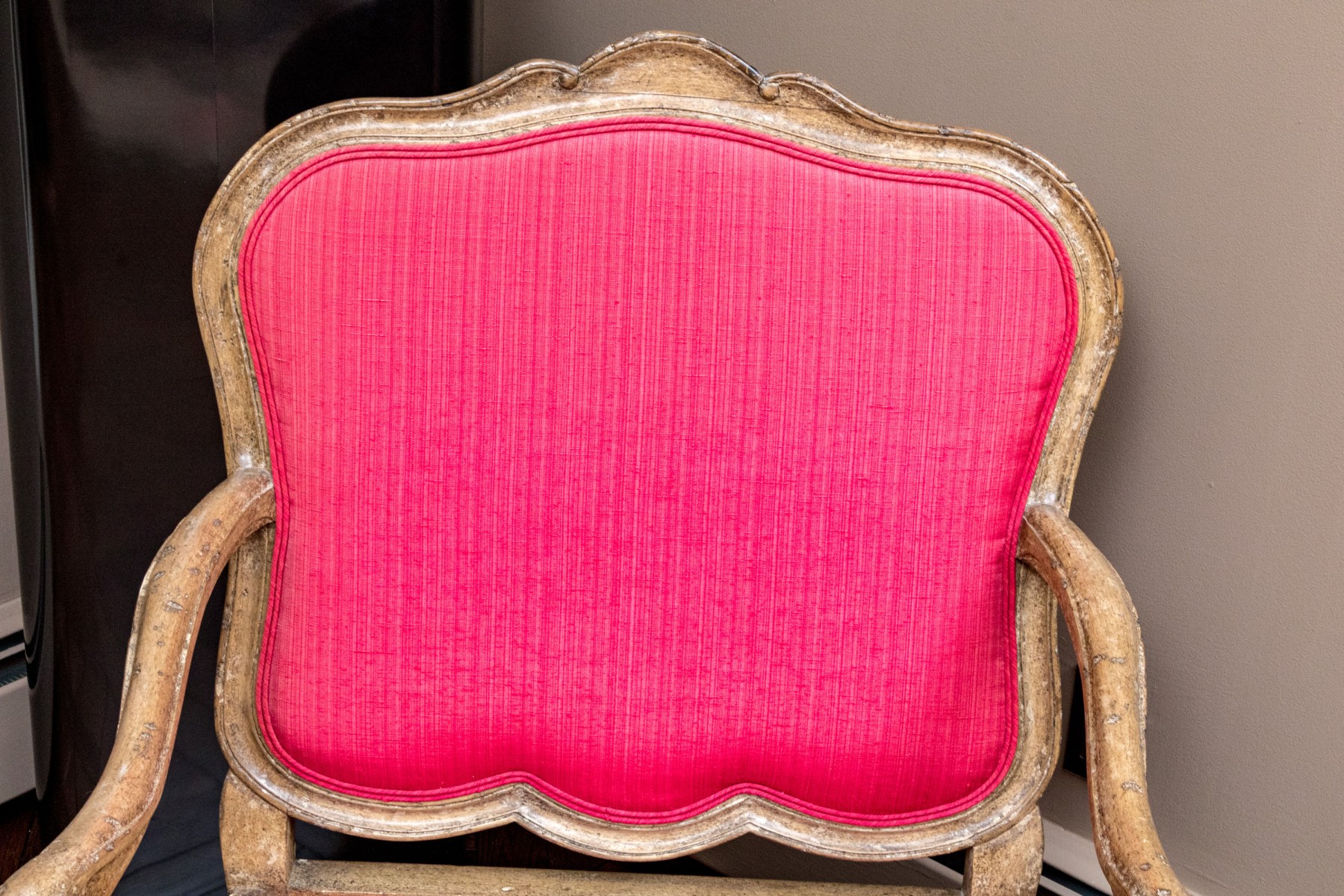 A handsome Louis XV style upholstered chair paired with a matching ottoman, both crafted from intricately carved wood. The chair exudes classic elegance, while the ottoman (31 x 21 x 17"H) offers comfort and versatility. Accompanied by a bolster (24 x 13"H), this custom-upholstered set captures the essence of refined French design, perfect for adding a touch of luxury to any living space.