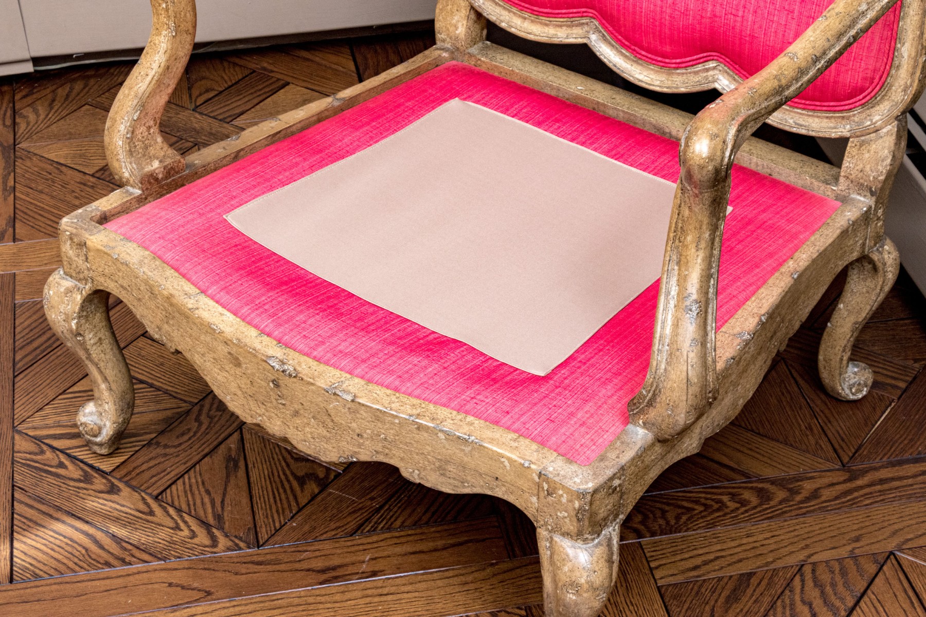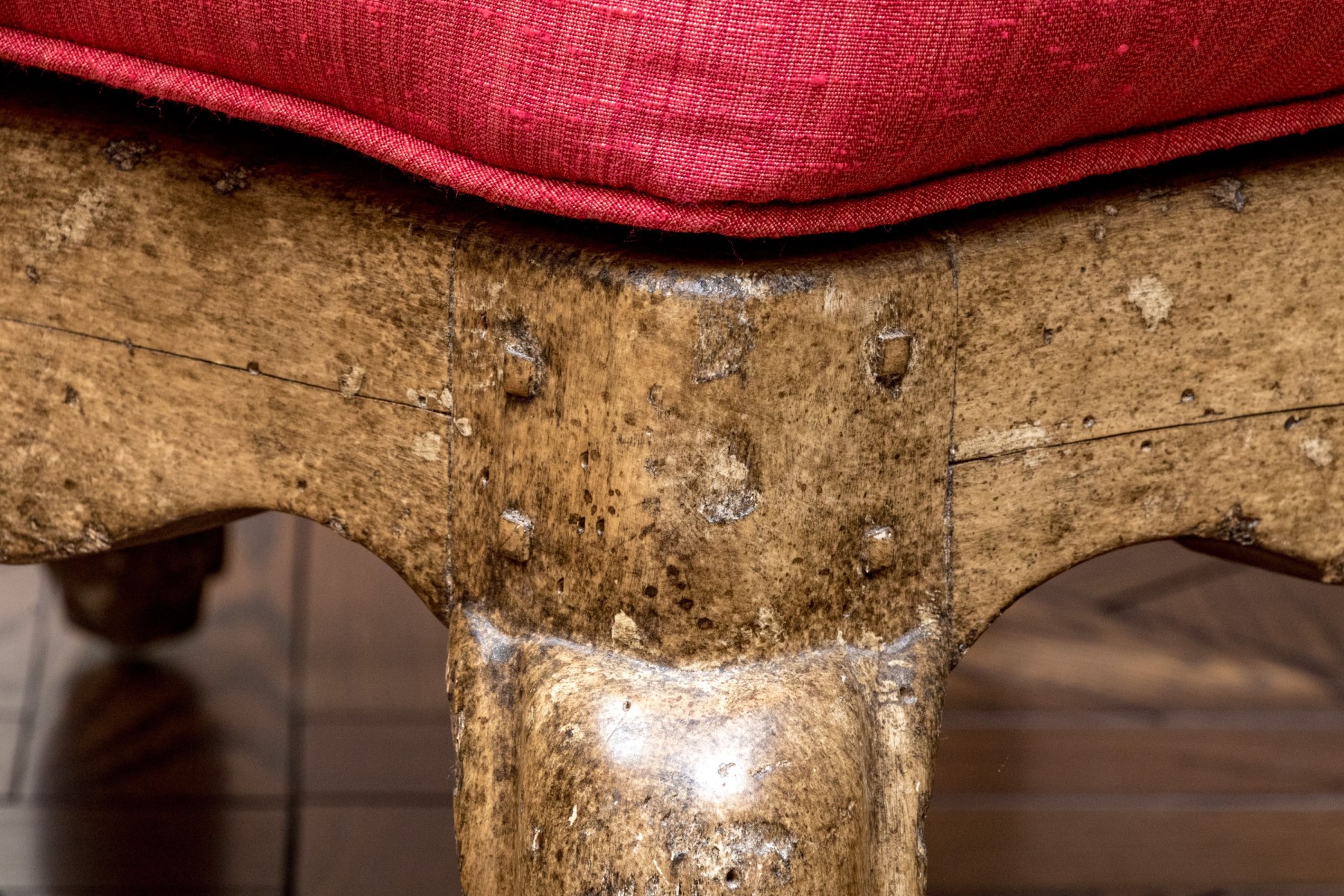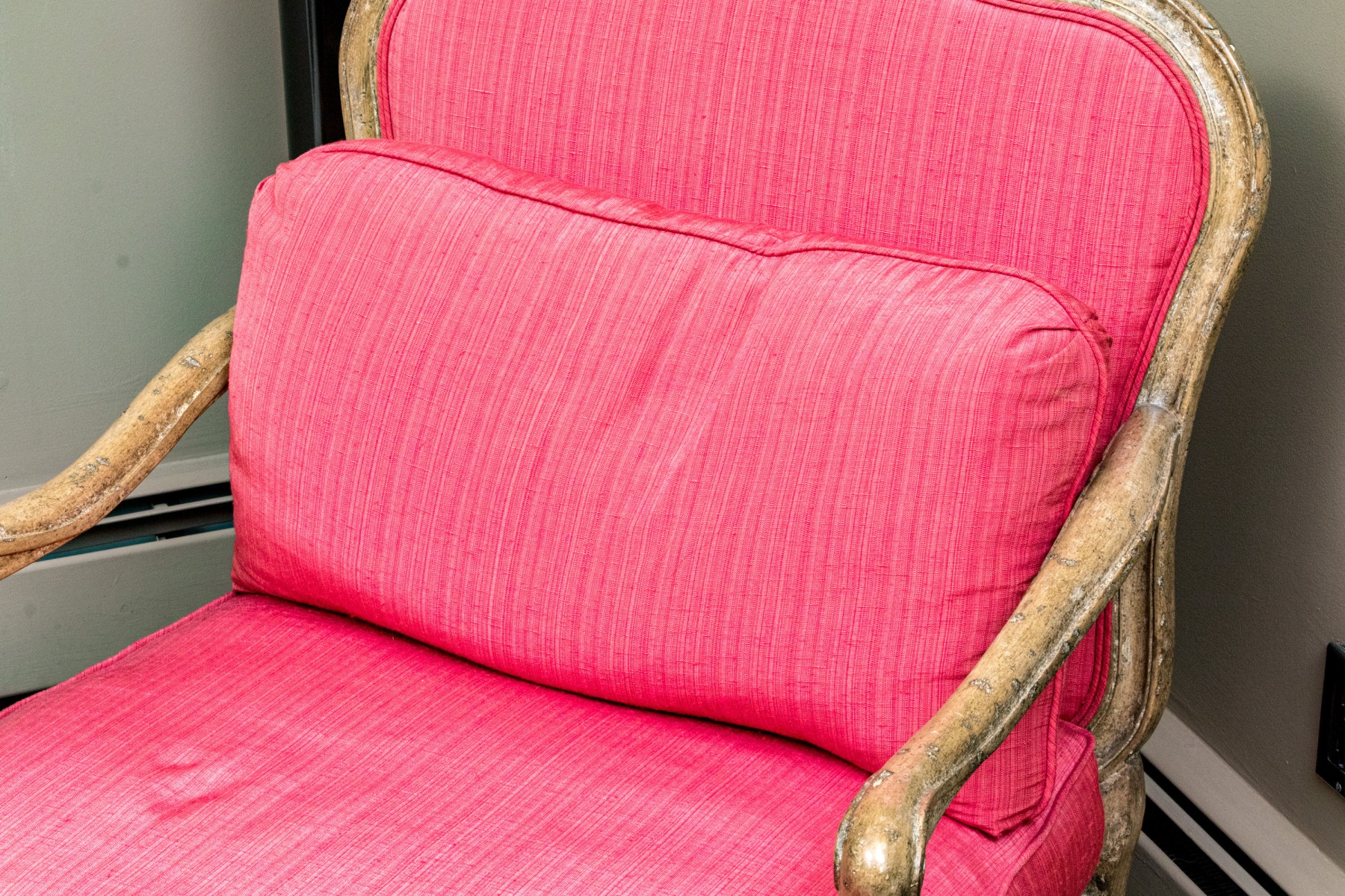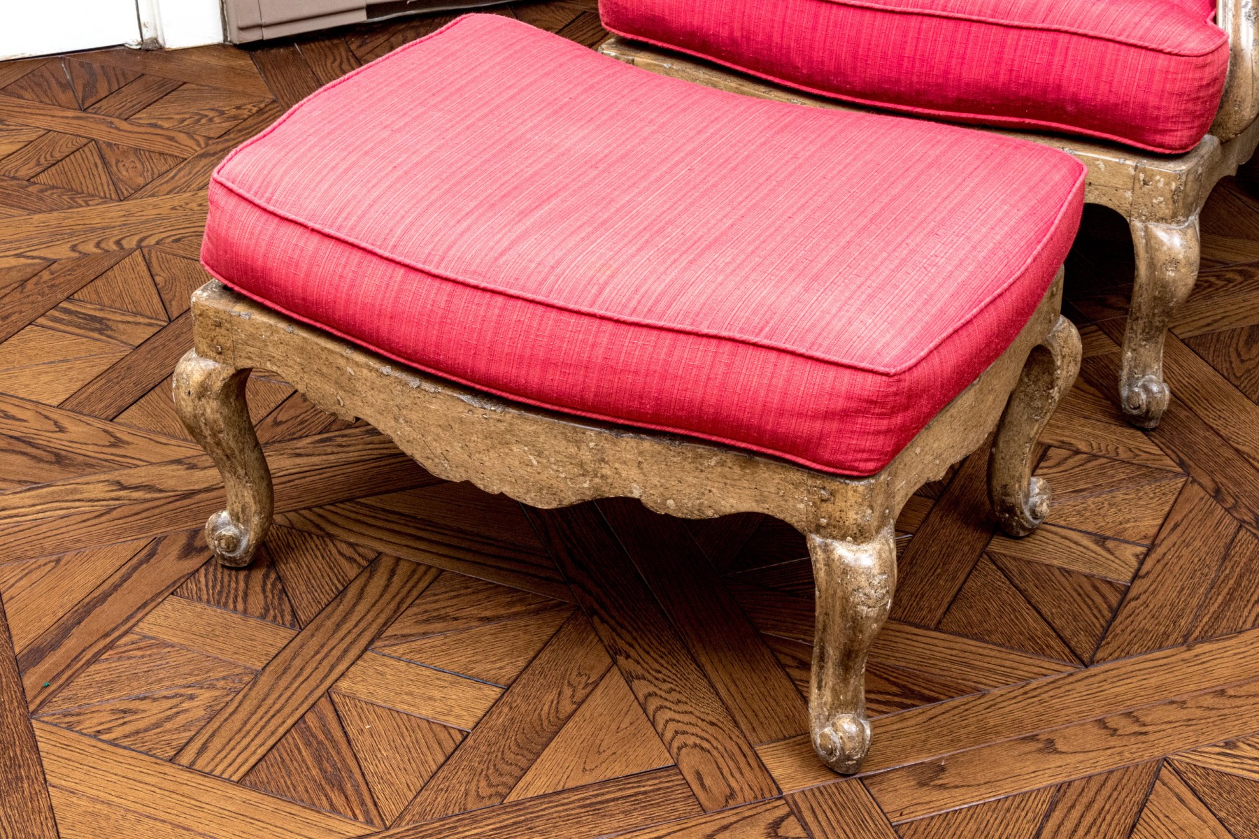 A handsome Louis XV style upholstered chair paired with a matching ottoman, both crafted from intricately carved wood. The chair exudes classic elegance, while the ottoman (31 x 21 x 17"H) offers comfort and versatility. Accompanied by a bolster (24 x 13"H), this custom-upholstered set captures the essence of refined French design, perfect for adding a touch of luxury to any living space.