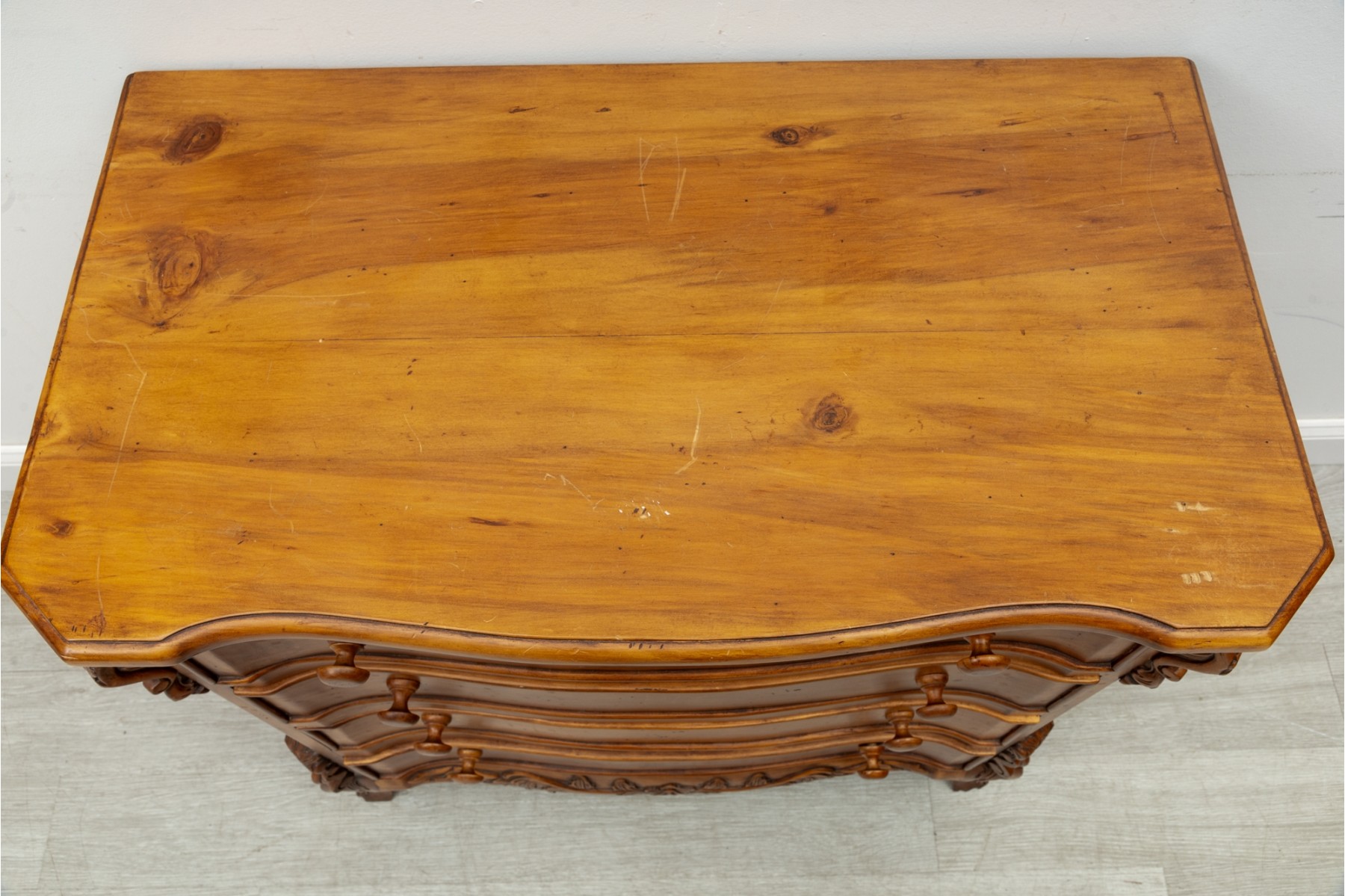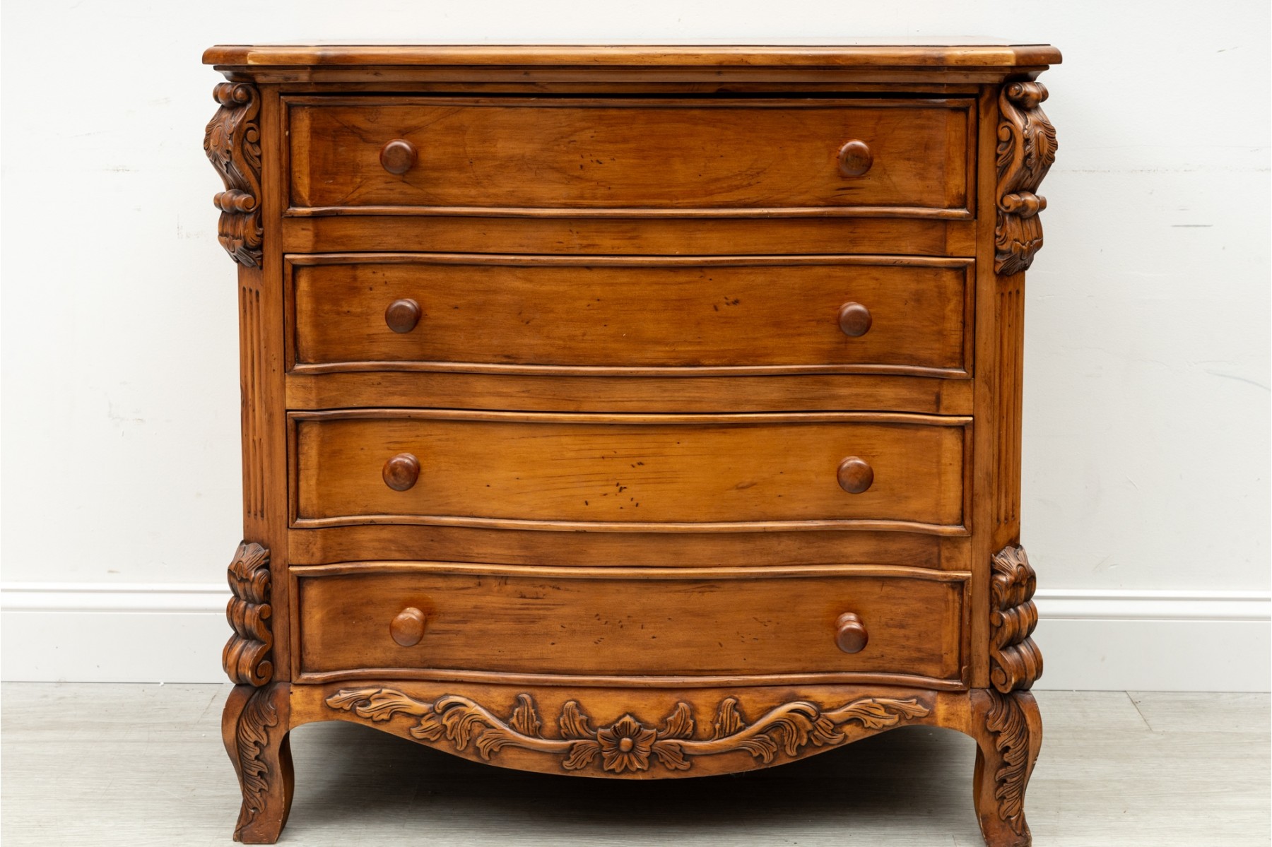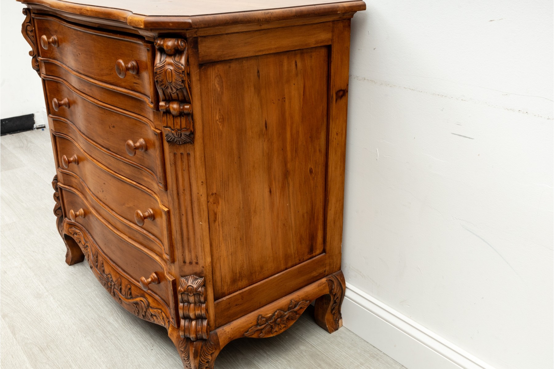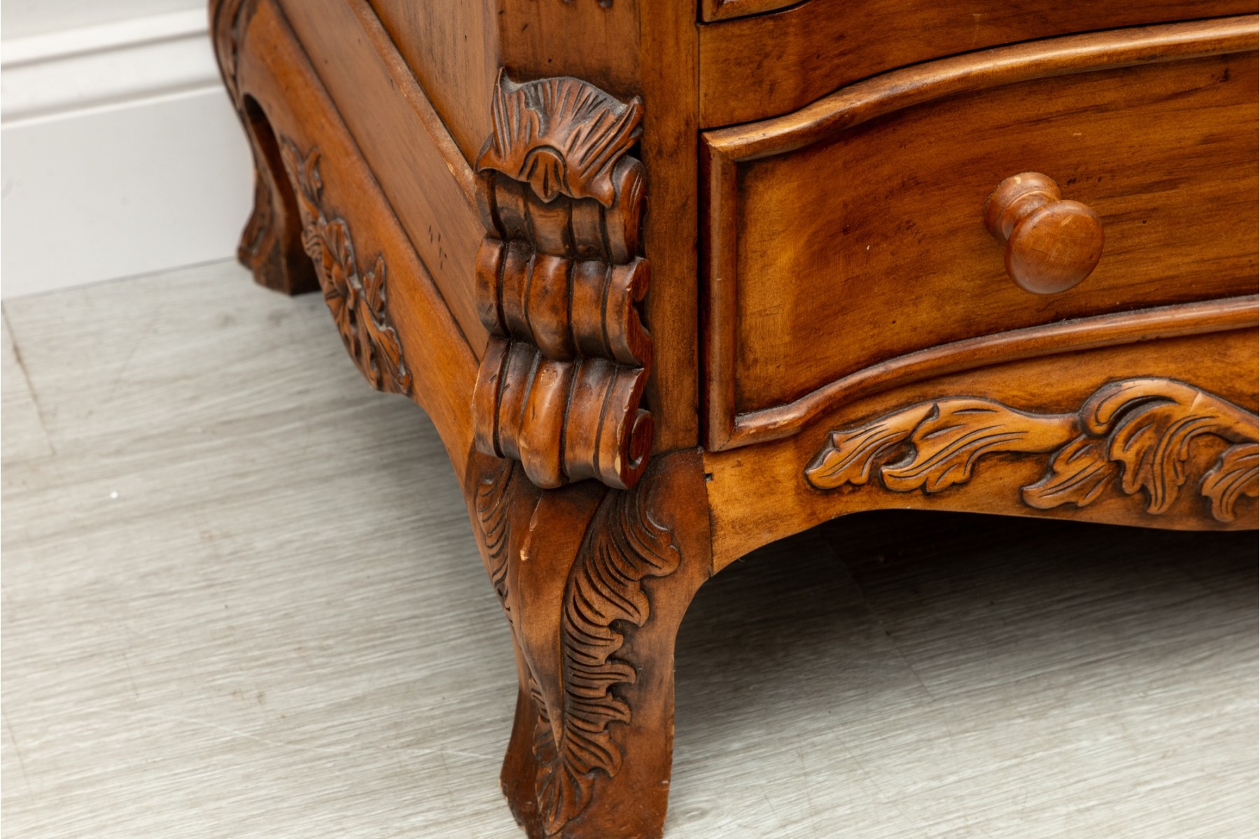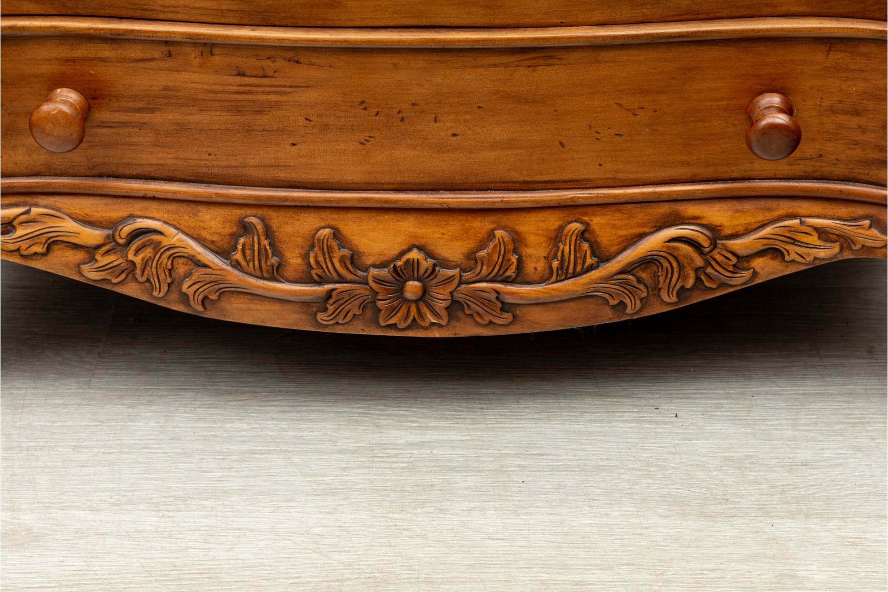 A Louis XV-style chest of drawers featuring a carved floral apron that gracefully extends into the trim. This elegant piece showcases curved lines, short cabriole legs, and intricate detailing to compliment shallow drawers with primitive dovetailing.