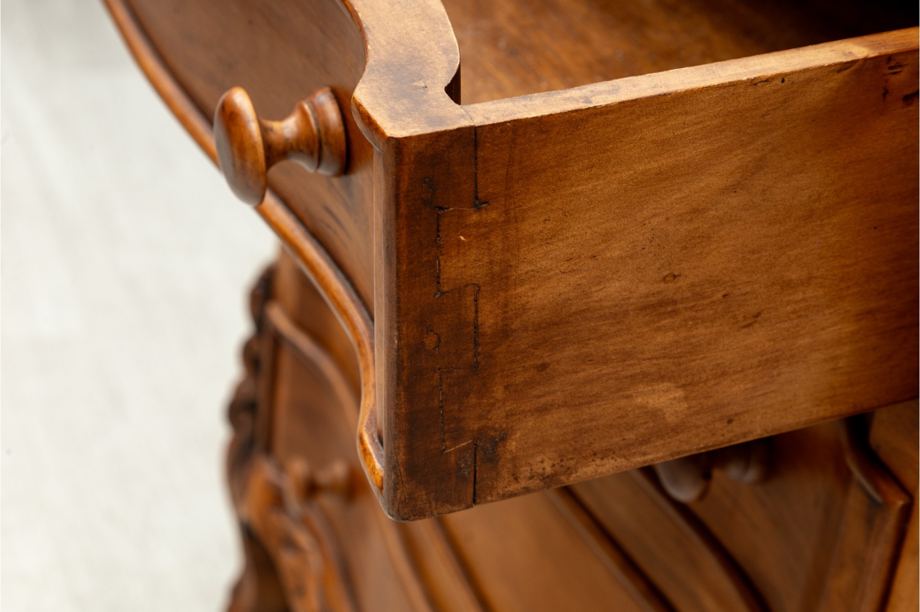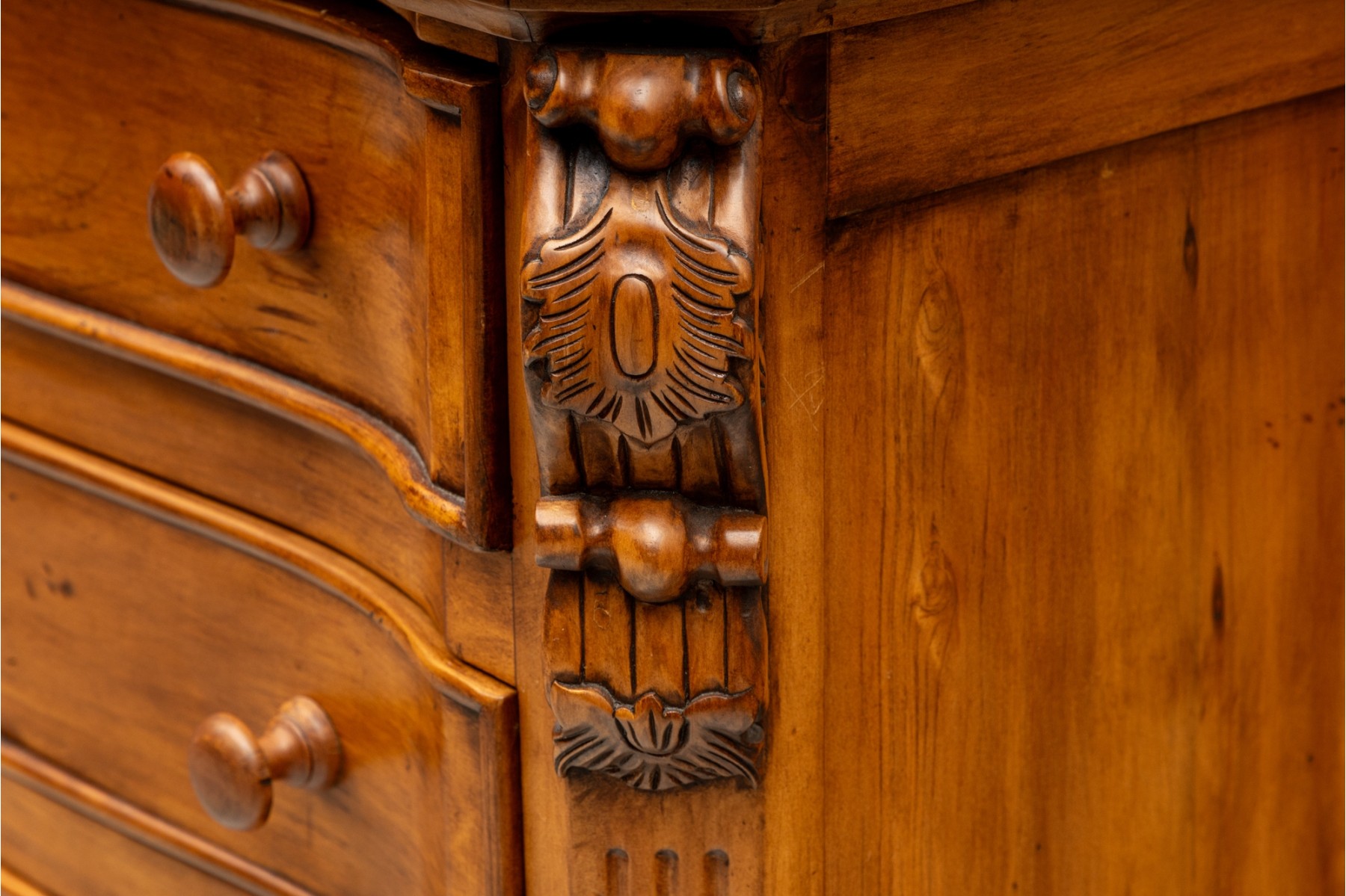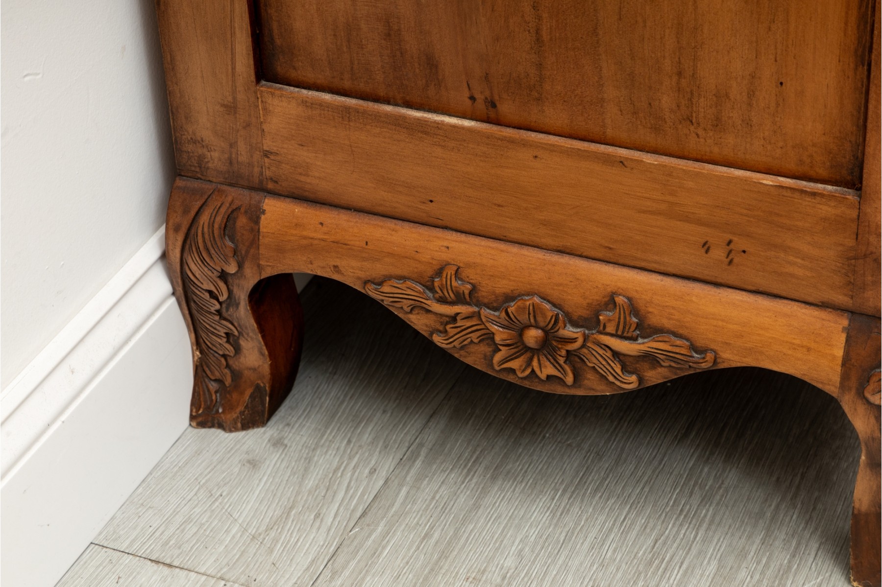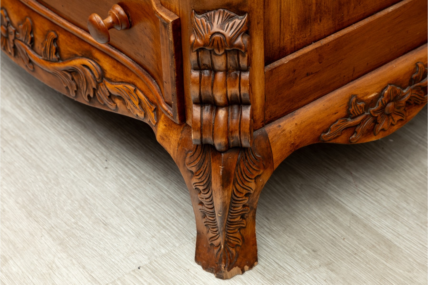 A Louis XV-style chest of drawers featuring a carved floral apron that gracefully extends into the trim. This elegant piece showcases curved lines, short cabriole legs, and intricate detailing to compliment shallow drawers with primitive dovetailing.