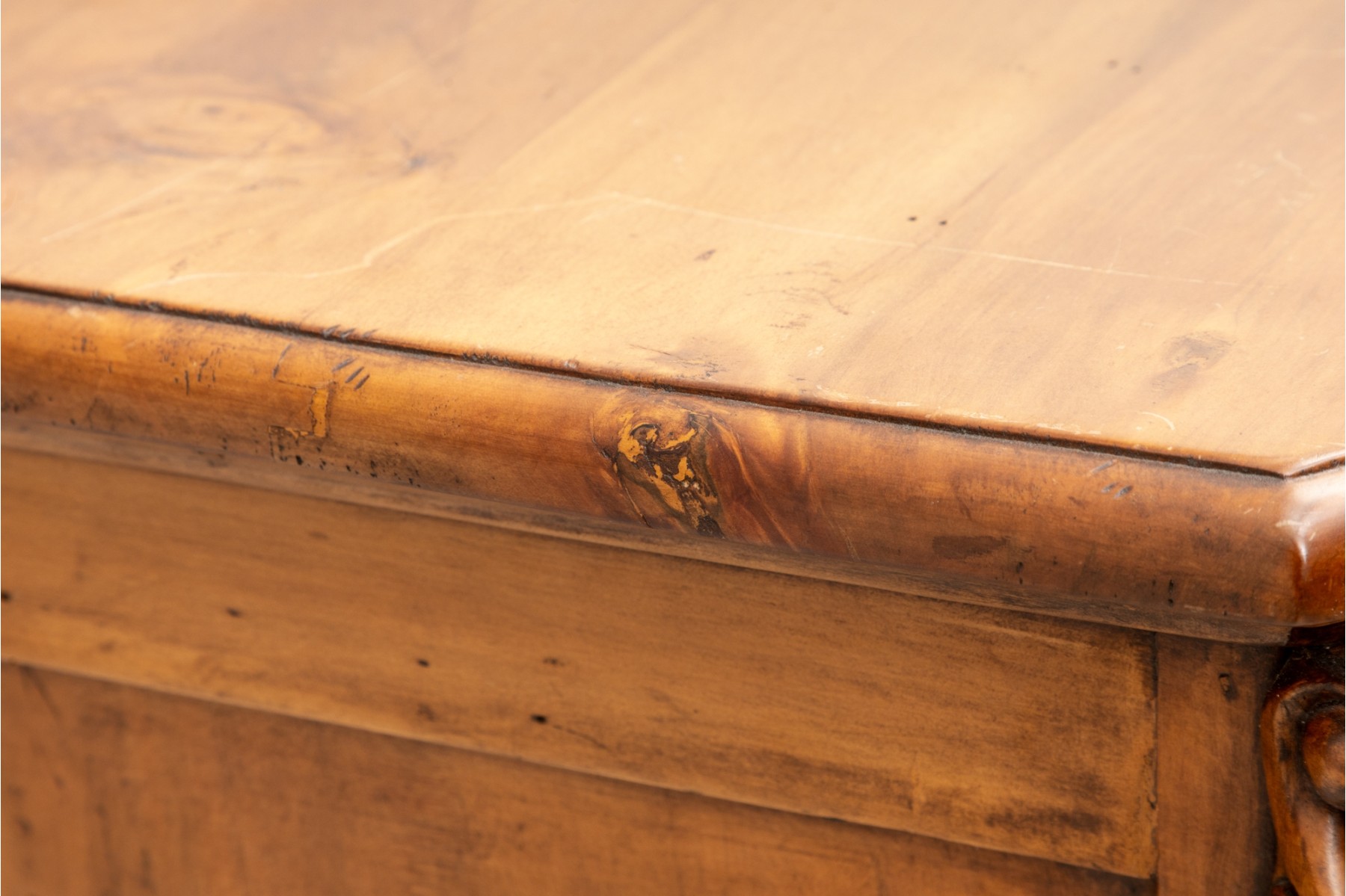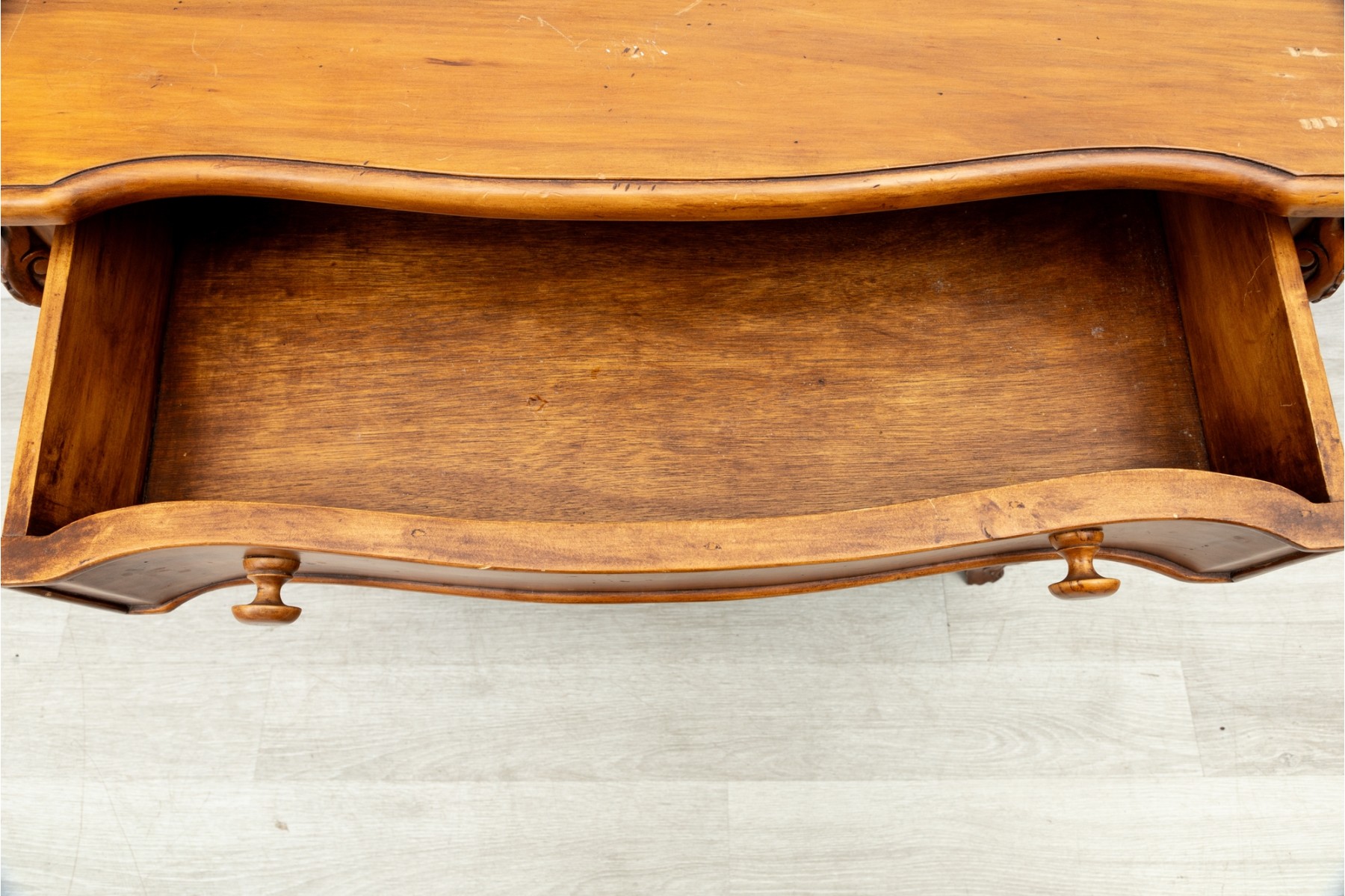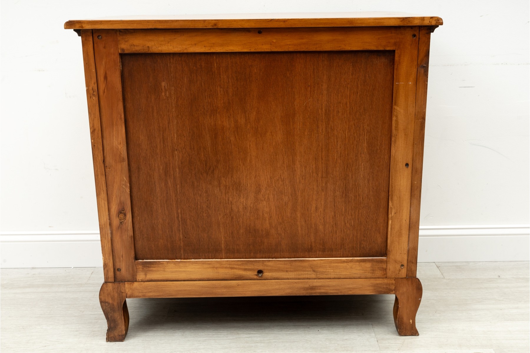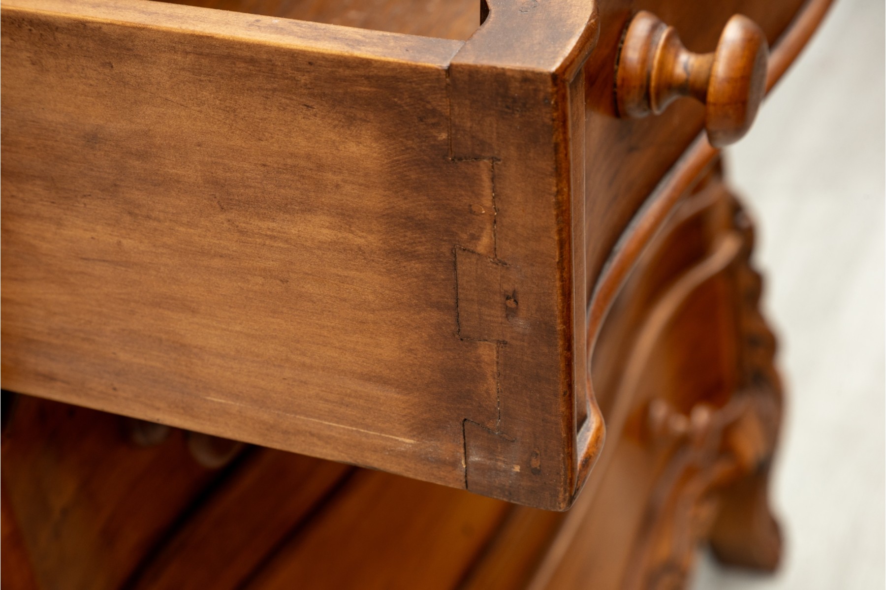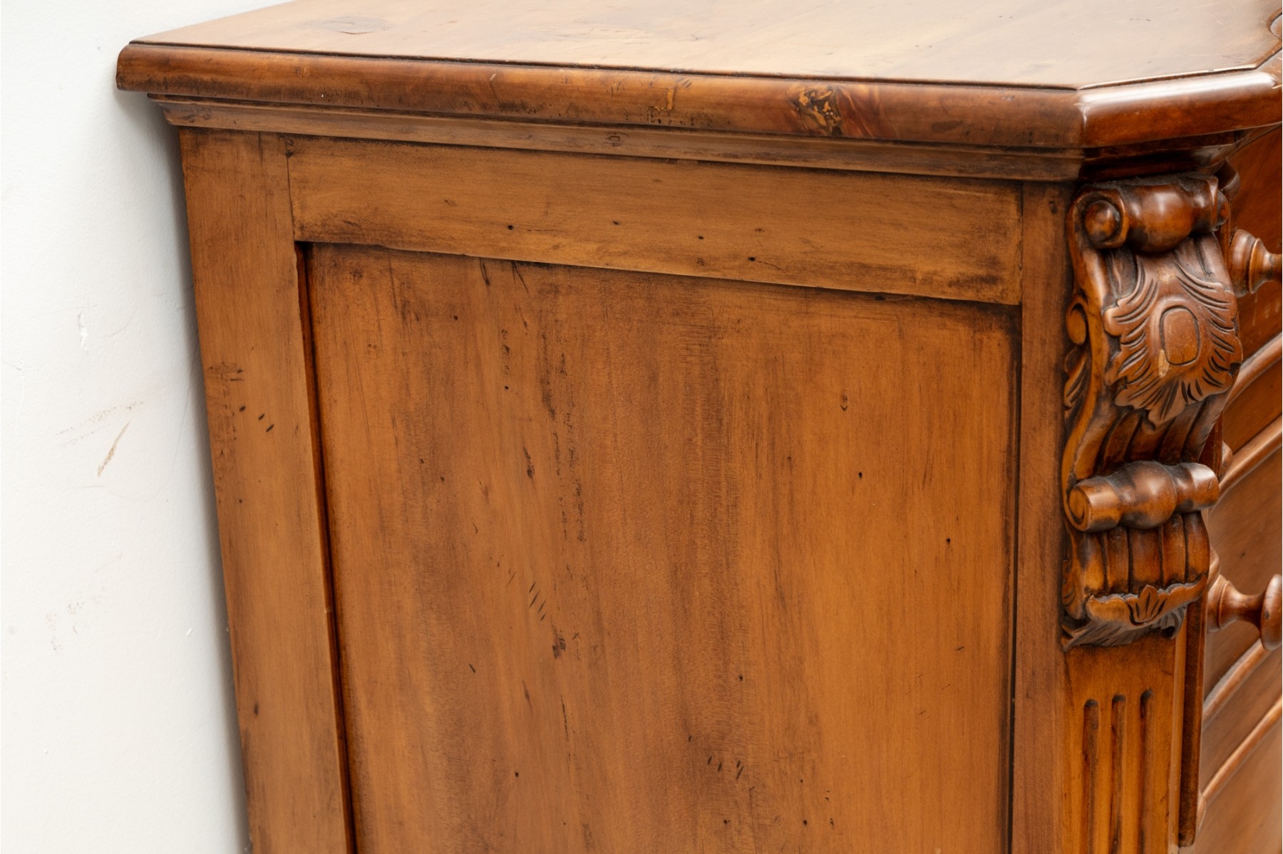A Louis XV-style chest of drawers featuring a carved floral apron that gracefully extends into the trim. This elegant piece showcases curved lines, short cabriole legs, and intricate detailing to compliment shallow drawers with primitive dovetailing.