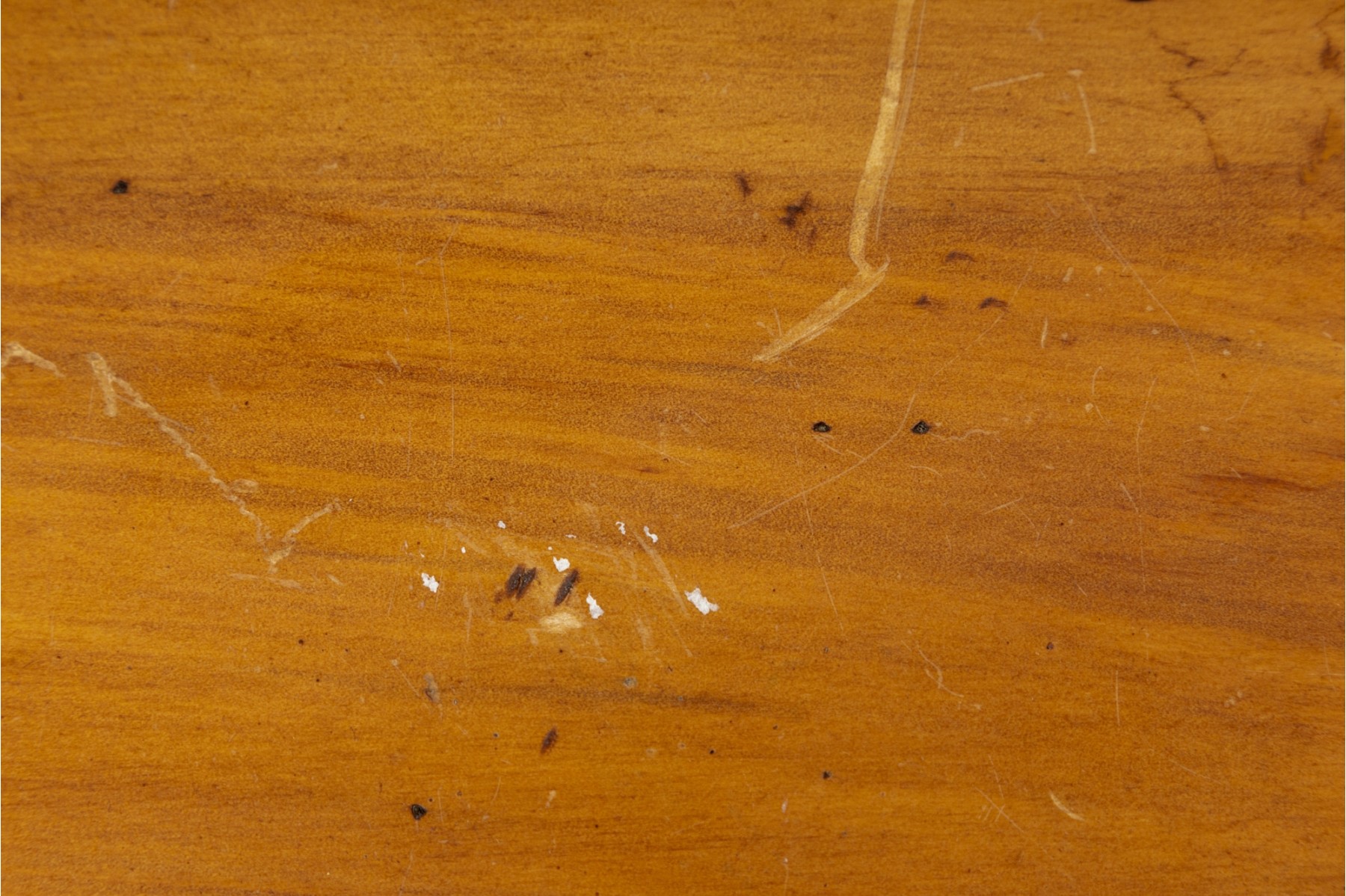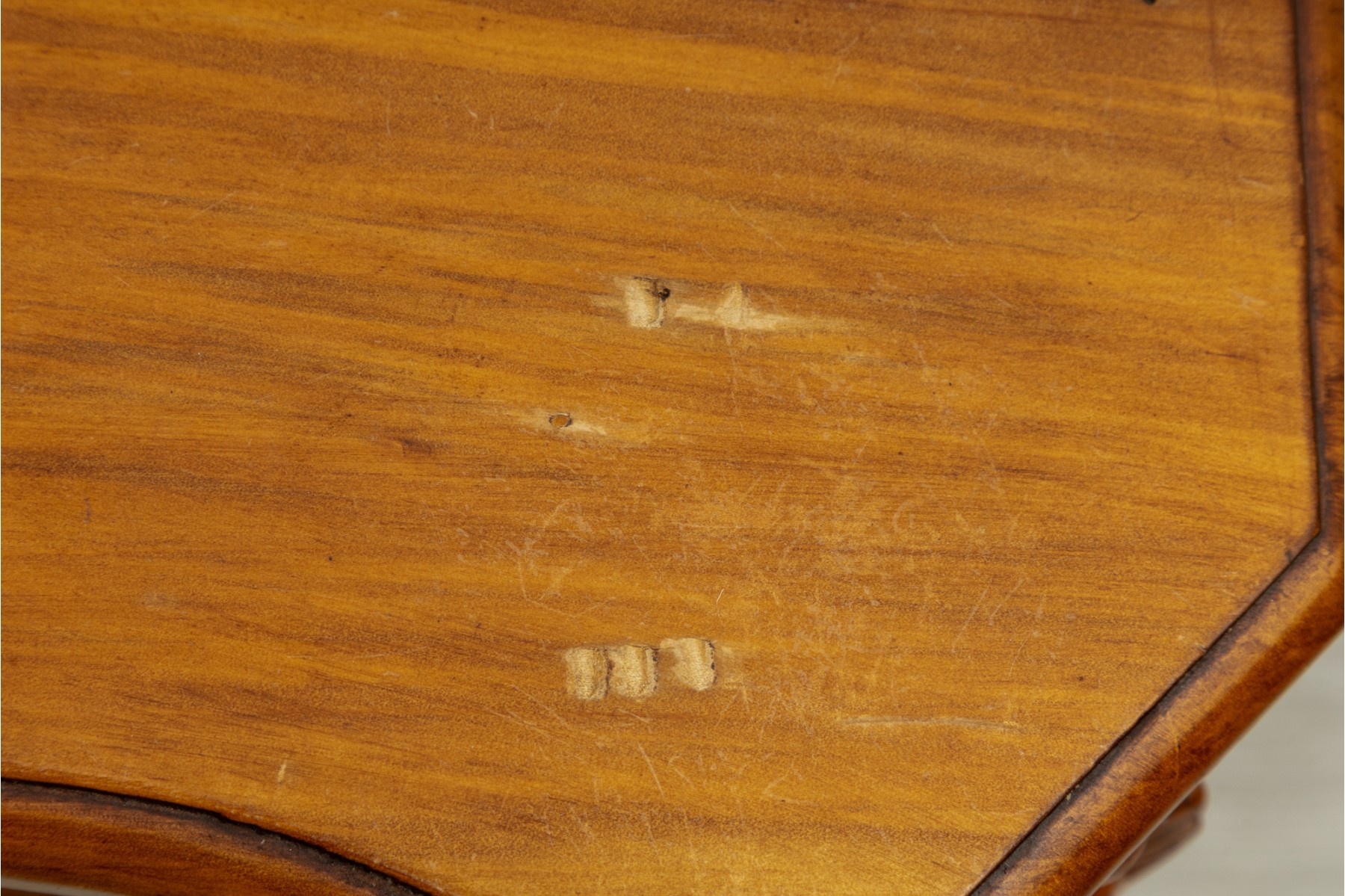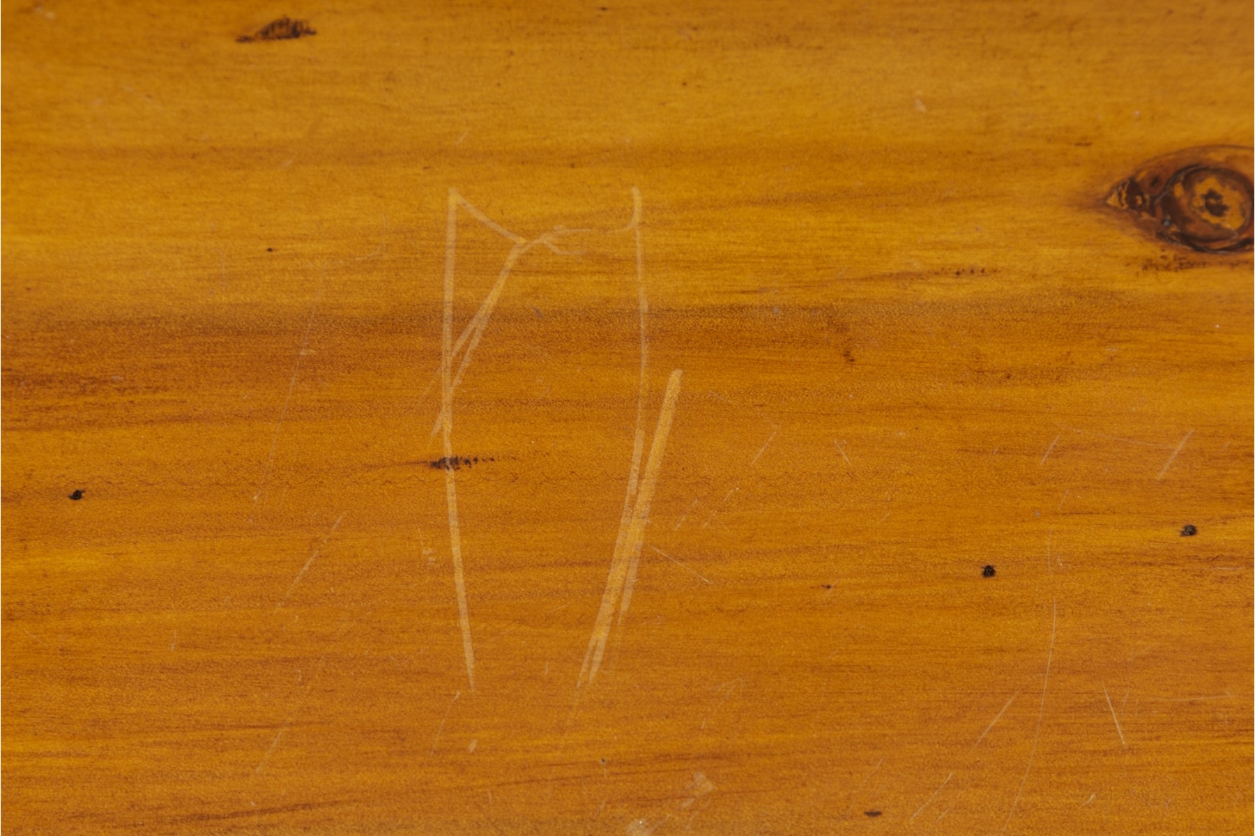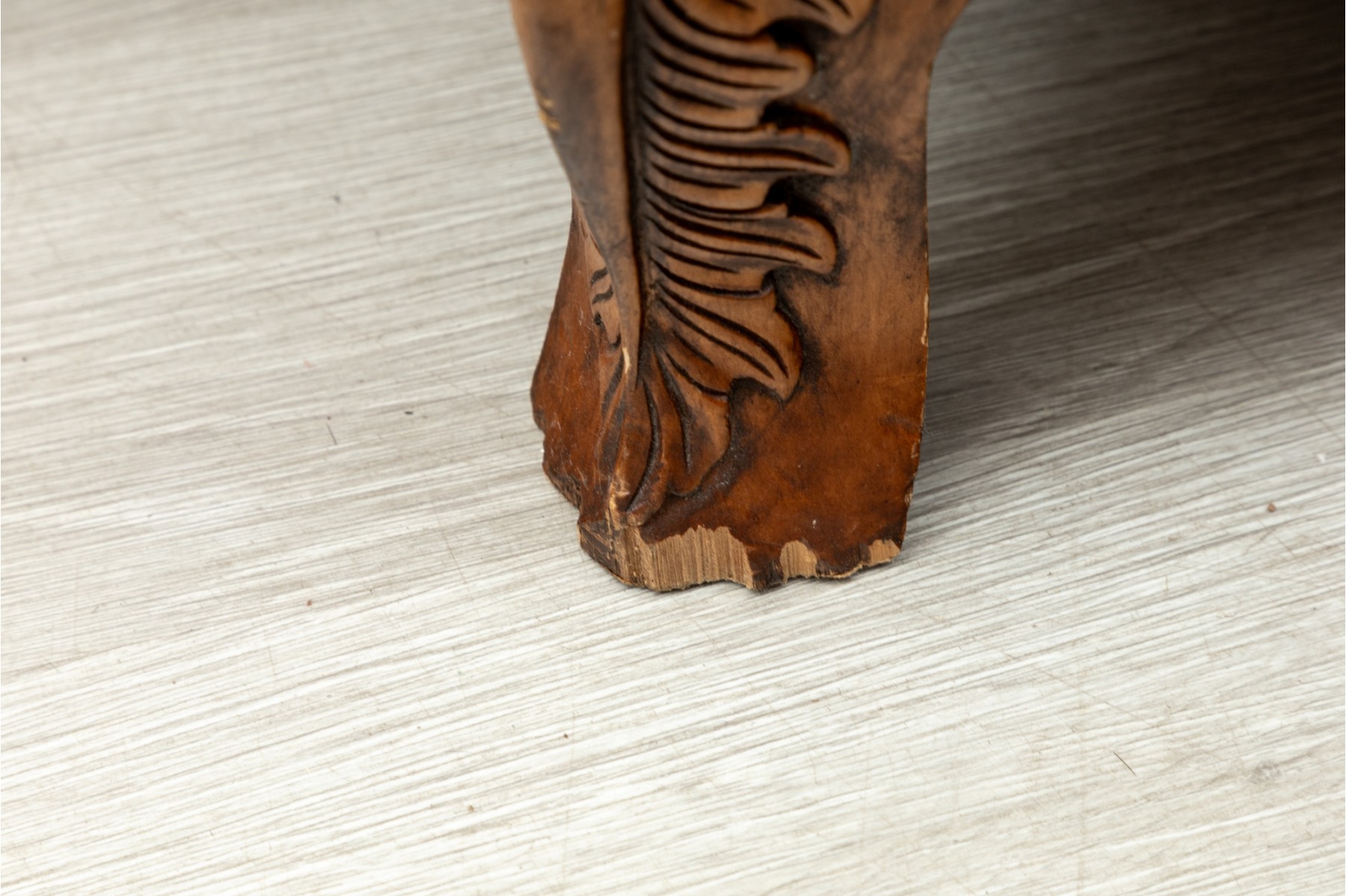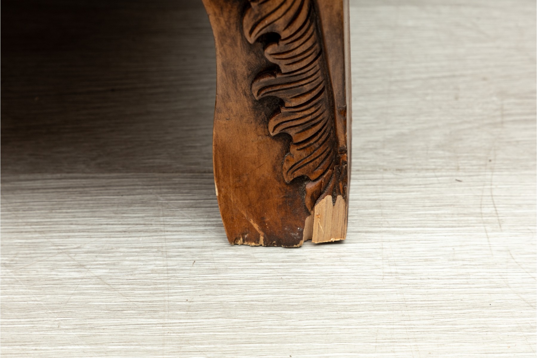 A Louis XV-style chest of drawers featuring a carved floral apron that gracefully extends into the trim. This elegant piece showcases curved lines, short cabriole legs, and intricate detailing to compliment shallow drawers with primitive dovetailing.