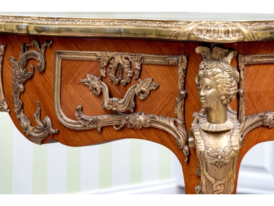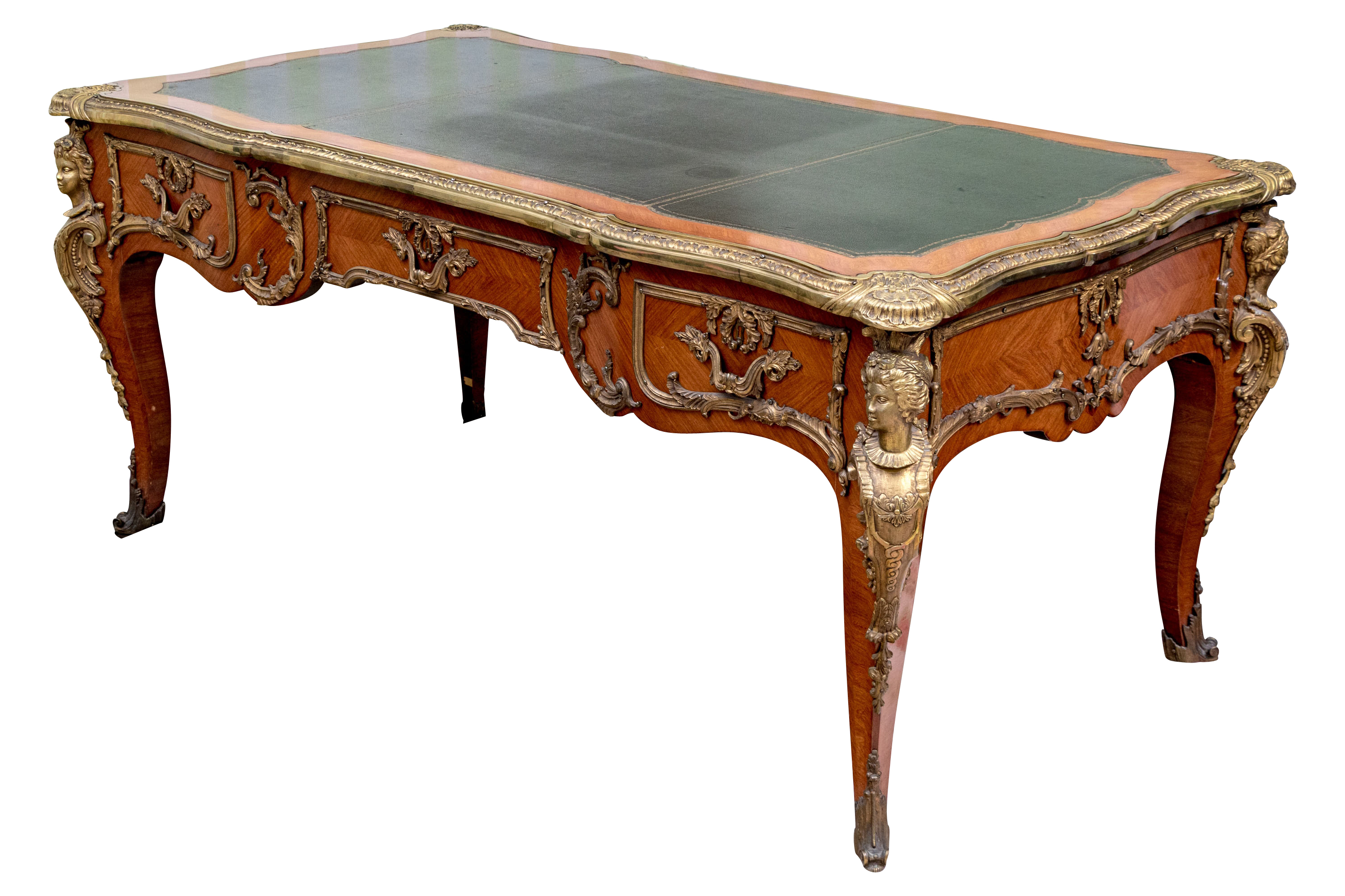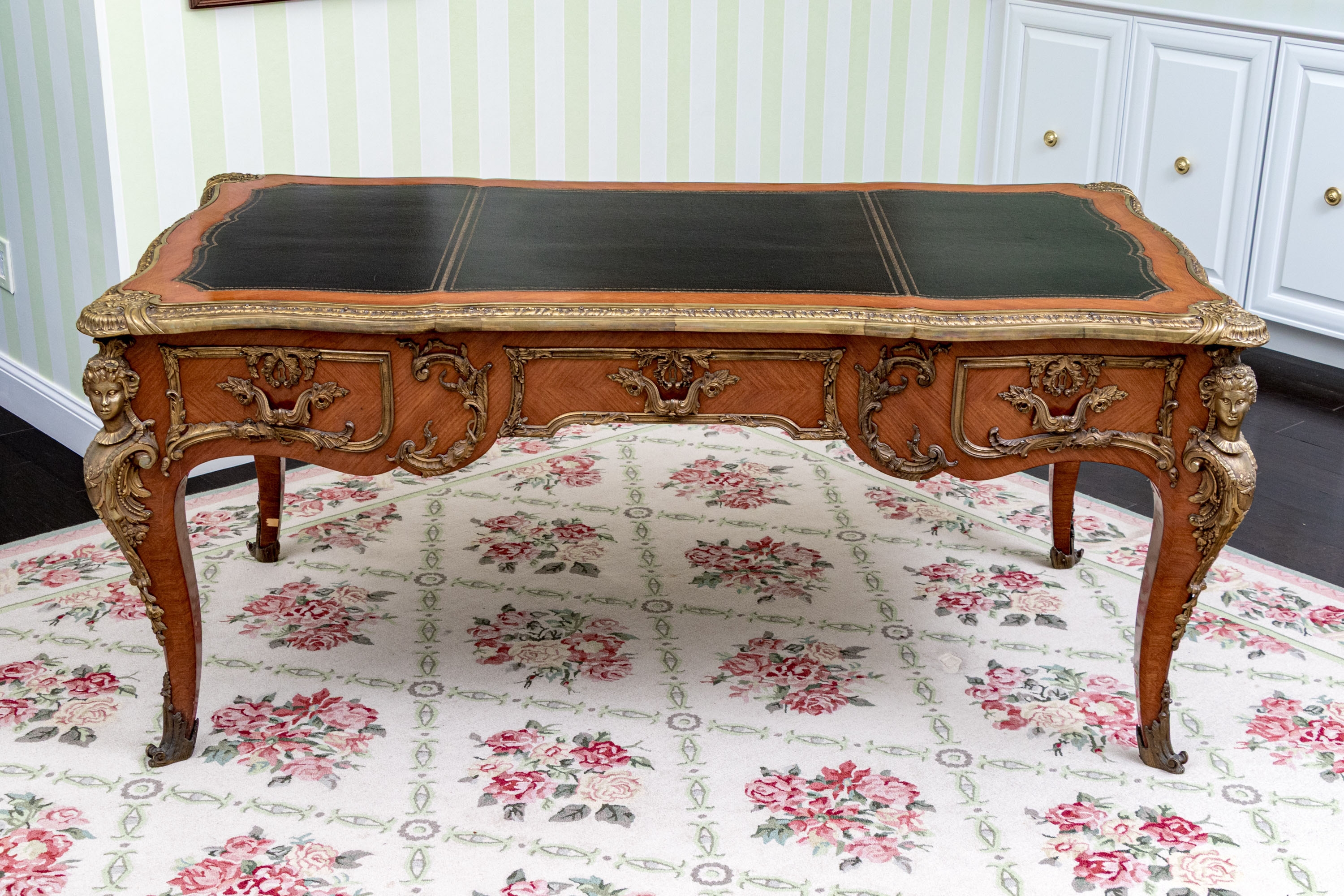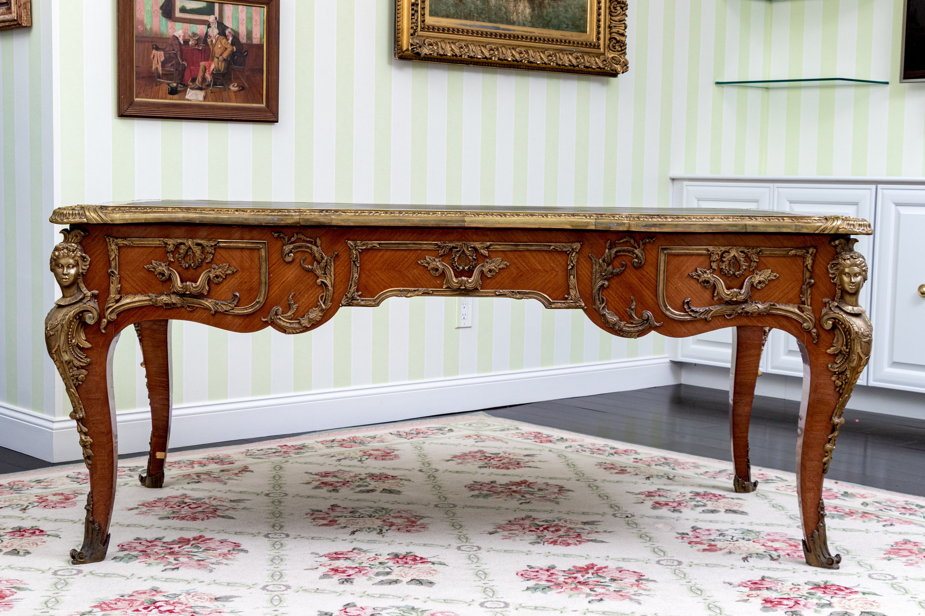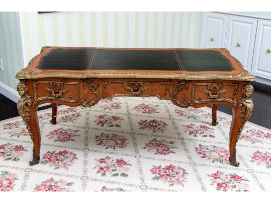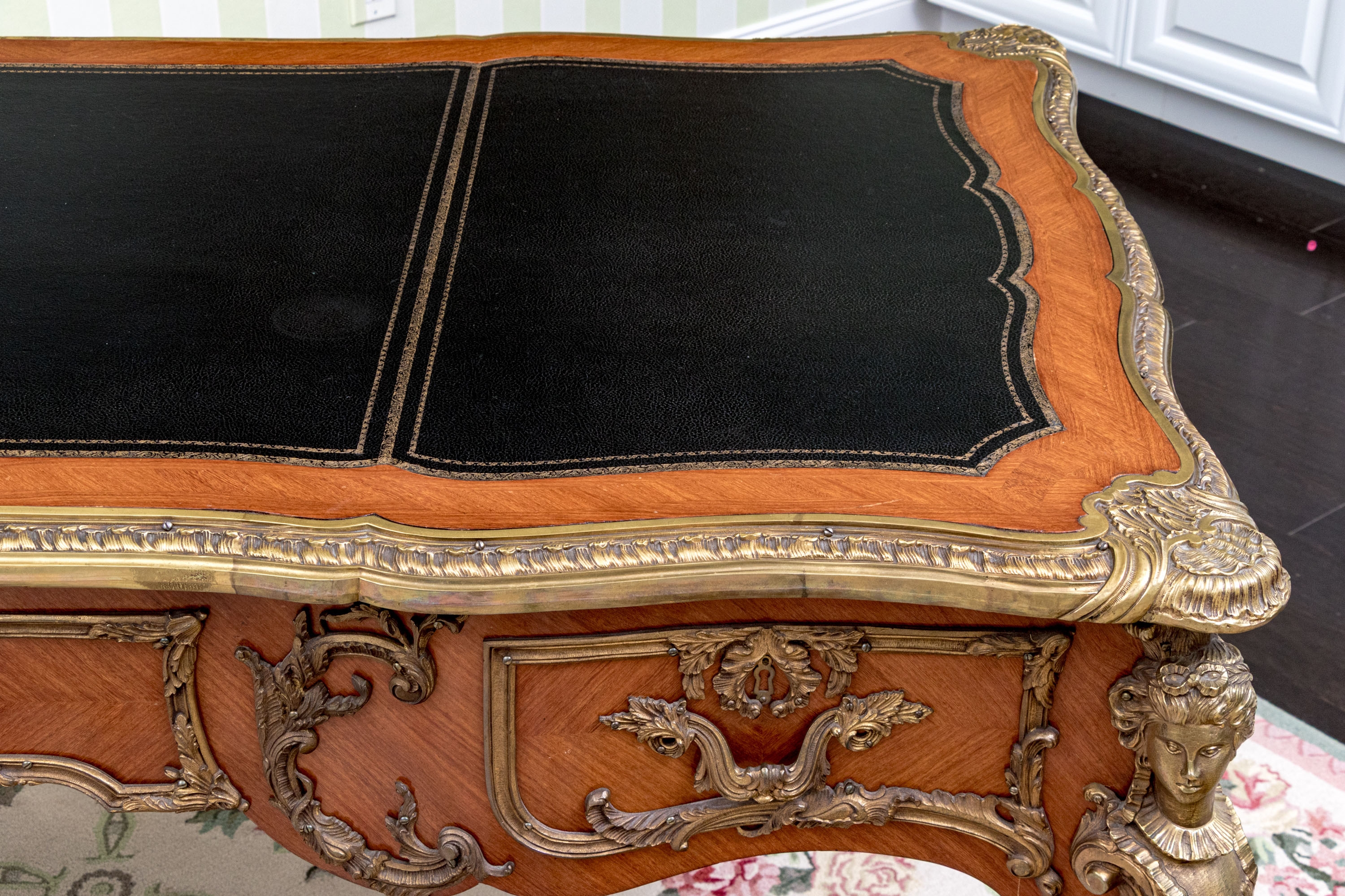 Louis XV style heavy substantial bureau plat having a shaped top with black inset leather writing surface, with three functional drawers on one side and pseudo drawers on other side, with heavy brass trim and elaborately etched desk edge, ornate cast brass hardware, feet and female sculptural face mounts at the corners. The desk comes with a softly pebbled black tooled leather top. One working key.