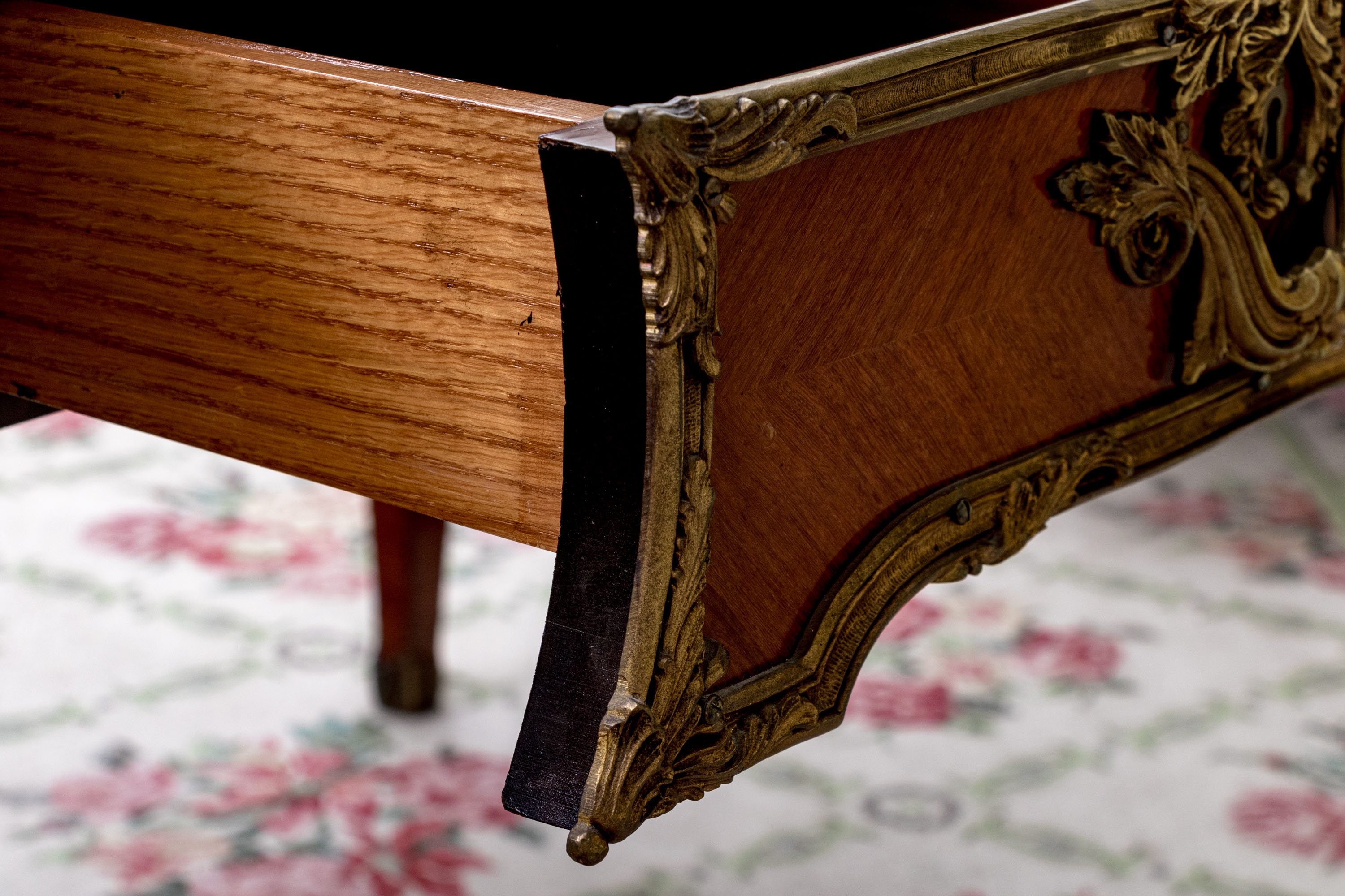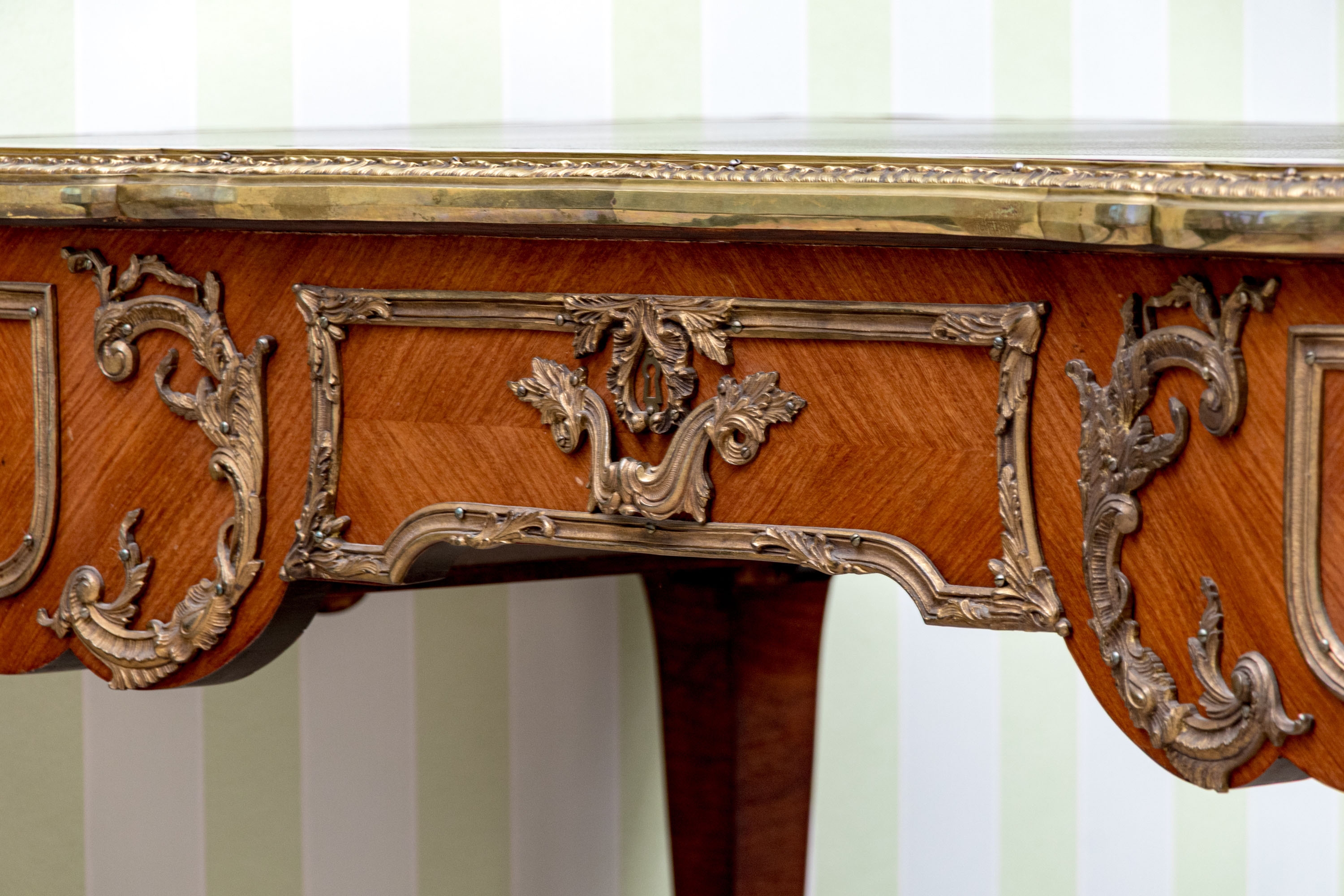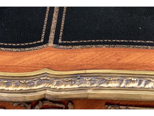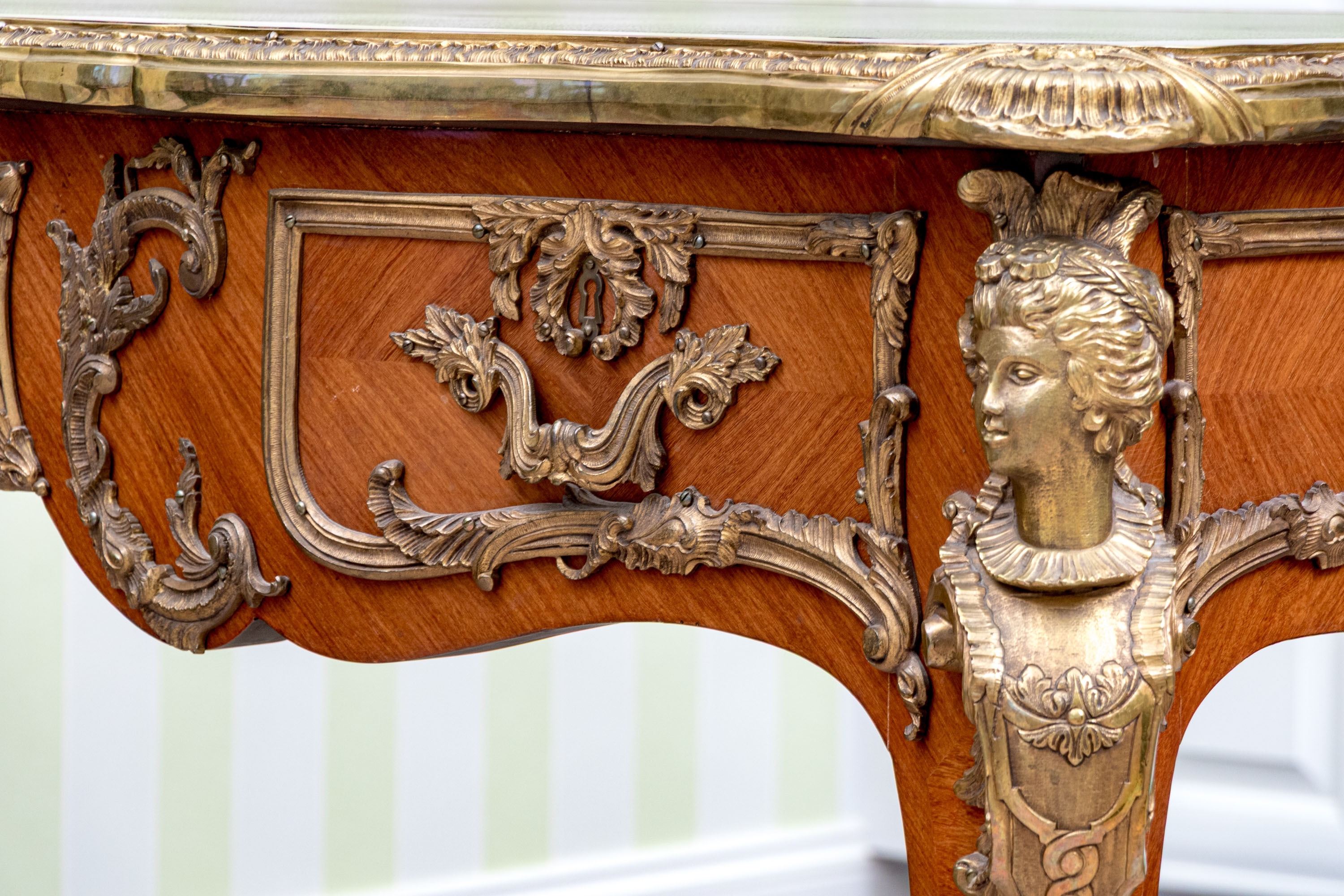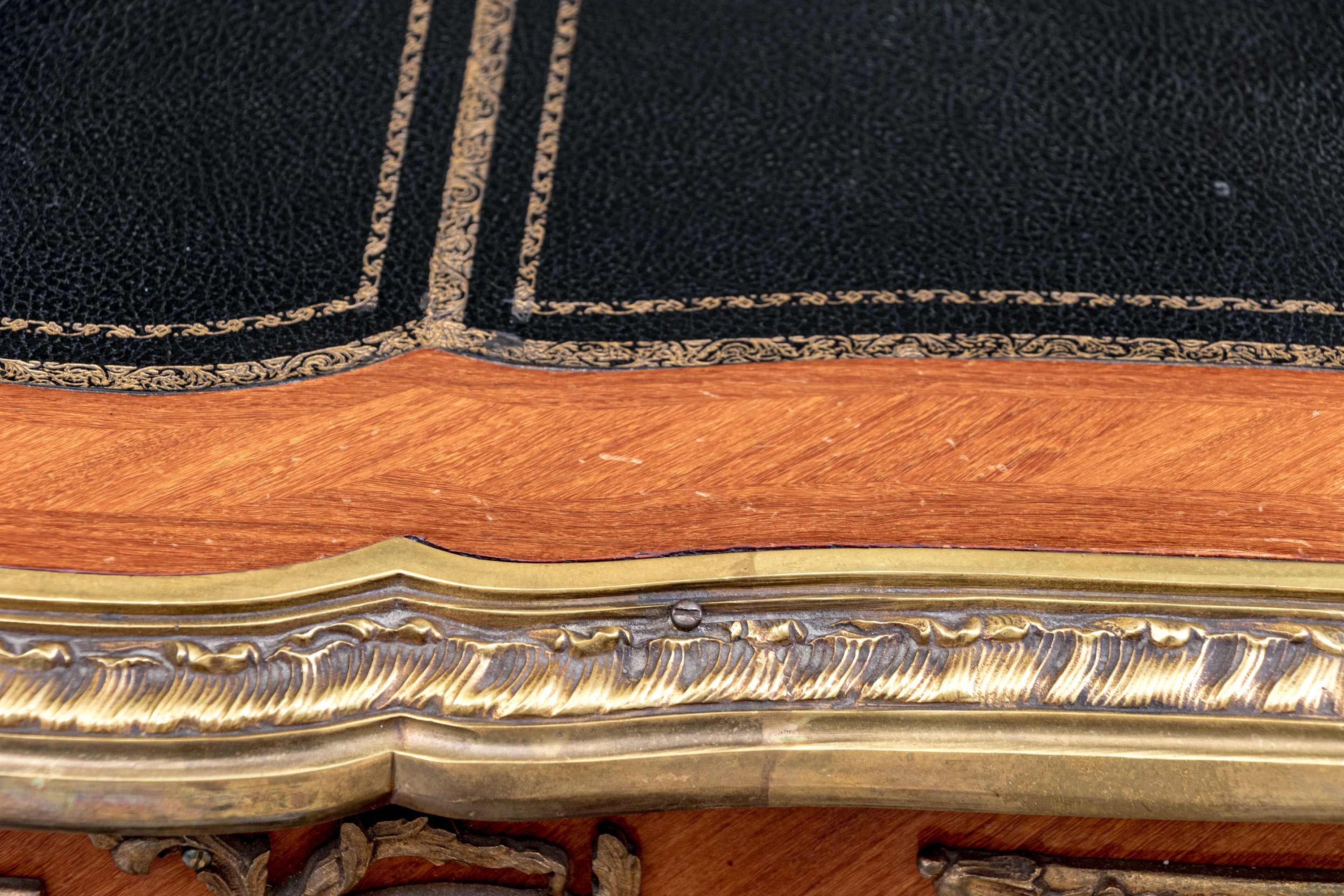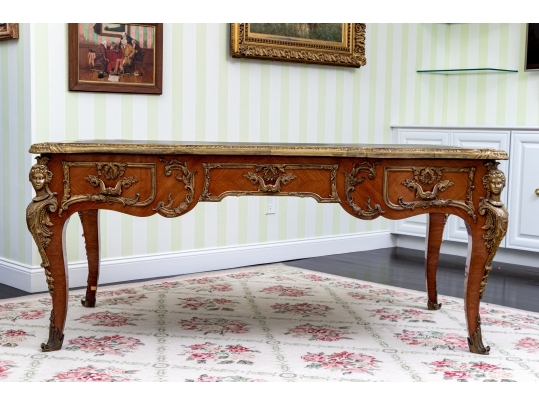 Louis XV style heavy substantial bureau plat having a shaped top with black inset leather writing surface, with three functional drawers on one side and pseudo drawers on other side, with heavy brass trim and elaborately etched desk edge, ornate cast brass hardware, feet and female sculptural face mounts at the corners. The desk comes with a softly pebbled black tooled leather top. One working key.