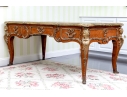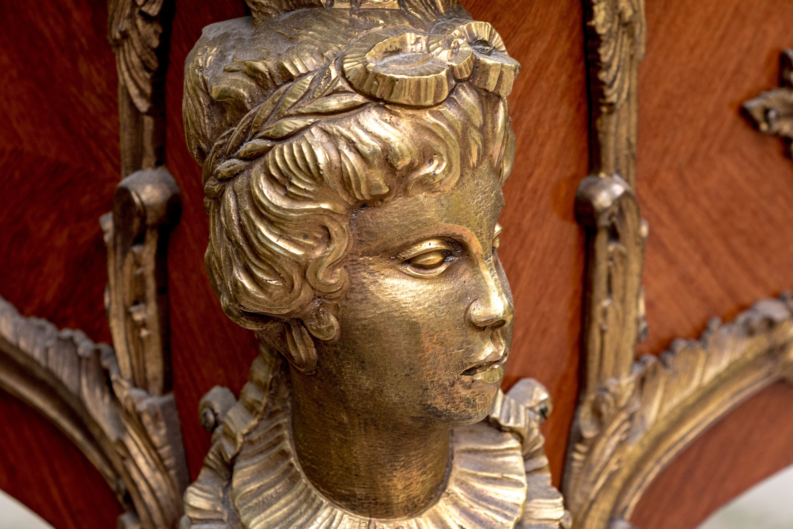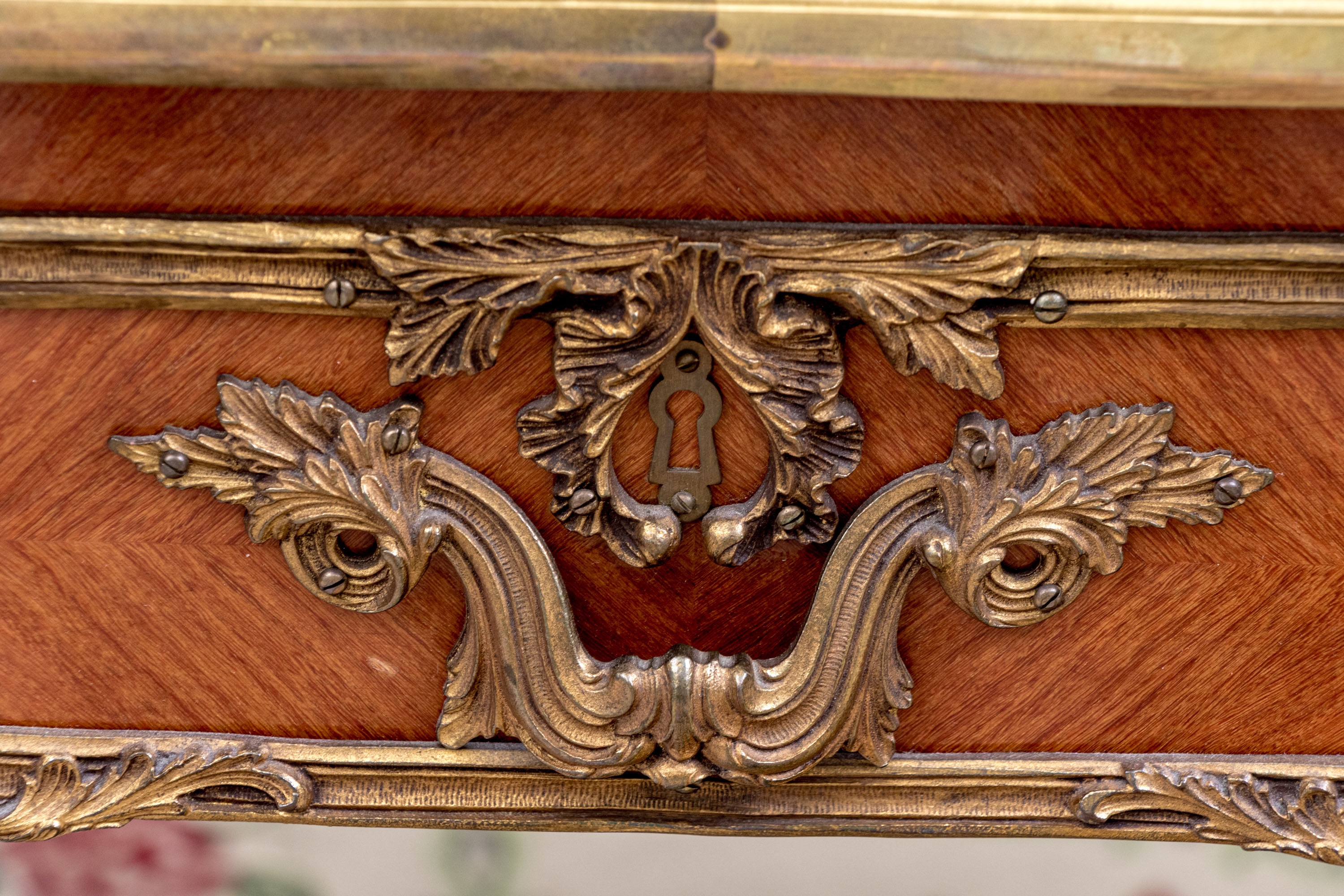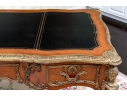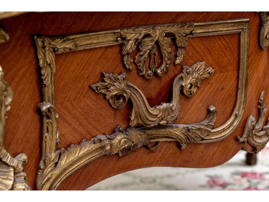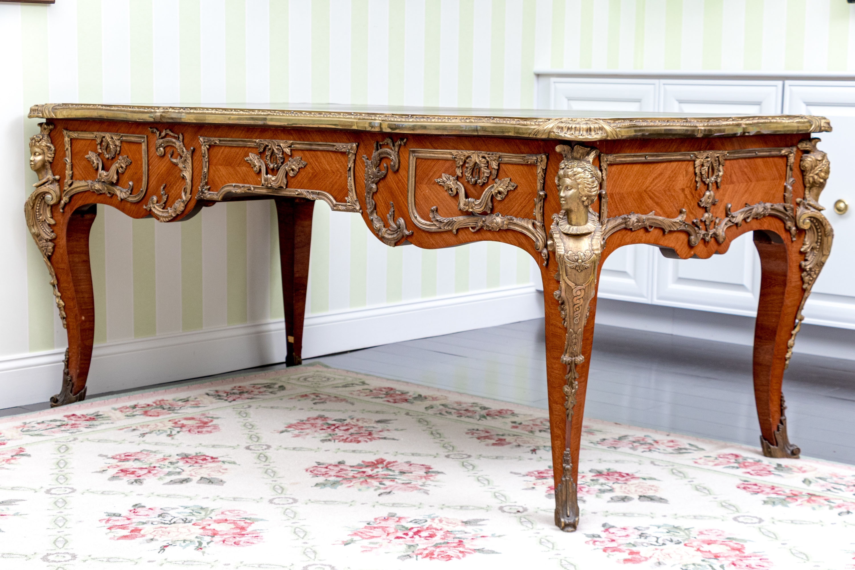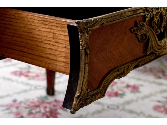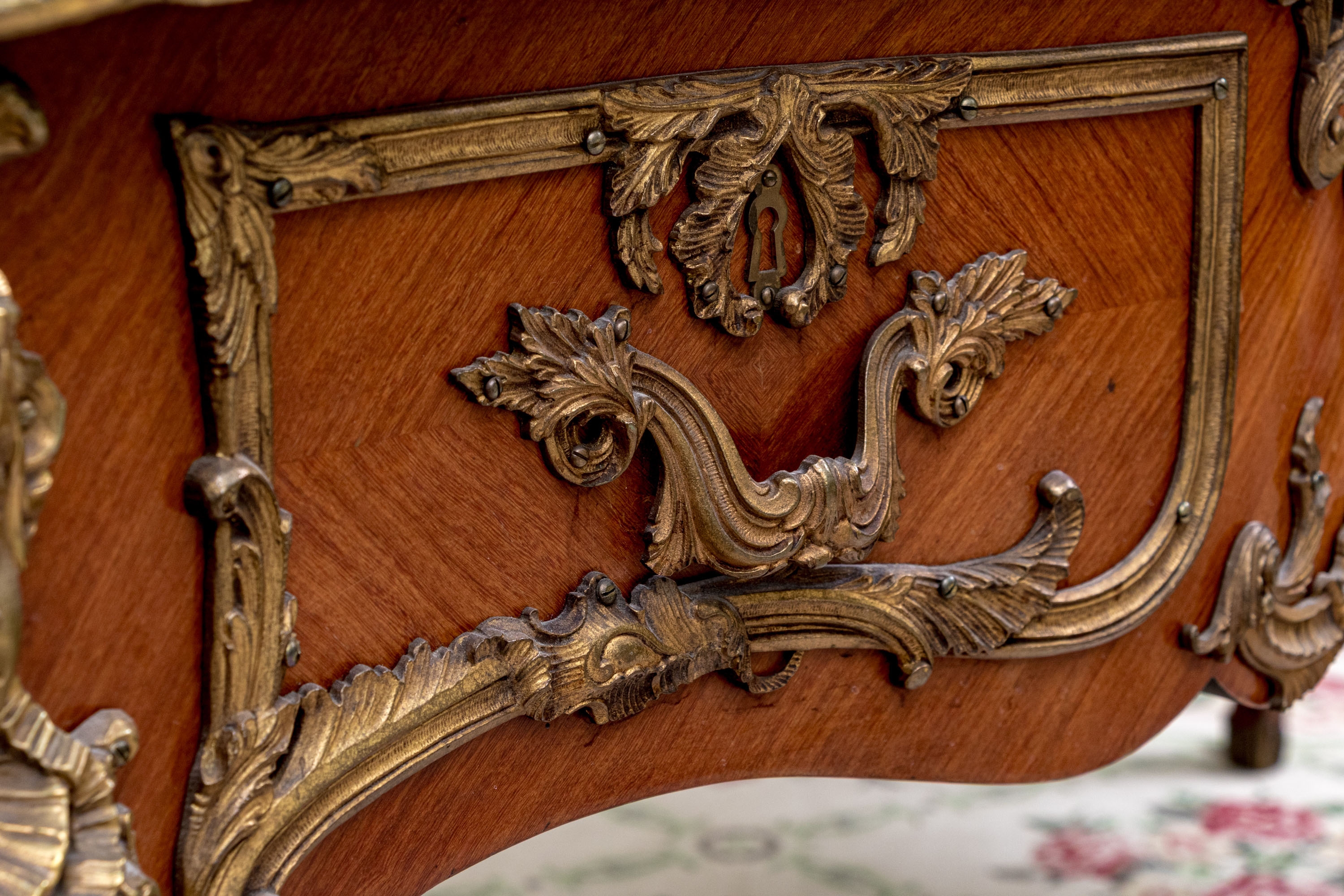 Louis XV style heavy substantial bureau plat having a shaped top with black inset leather writing surface, with three functional drawers on one side and pseudo drawers on other side, with heavy brass trim and elaborately etched desk edge, ornate cast brass hardware, feet and female sculptural face mounts at the corners. The desk comes with a softly pebbled black tooled leather top. One working key.