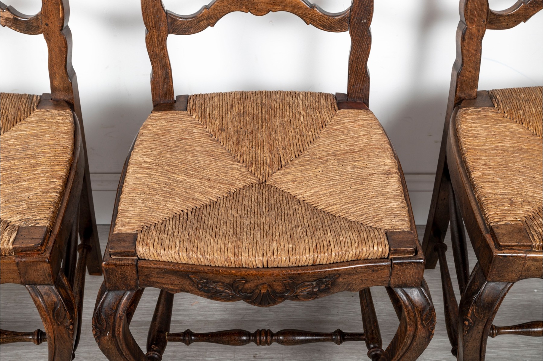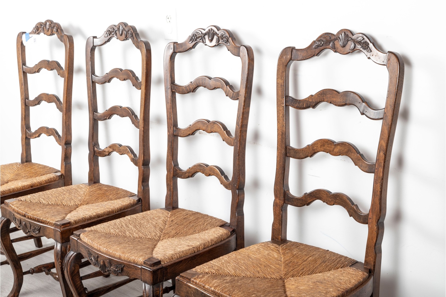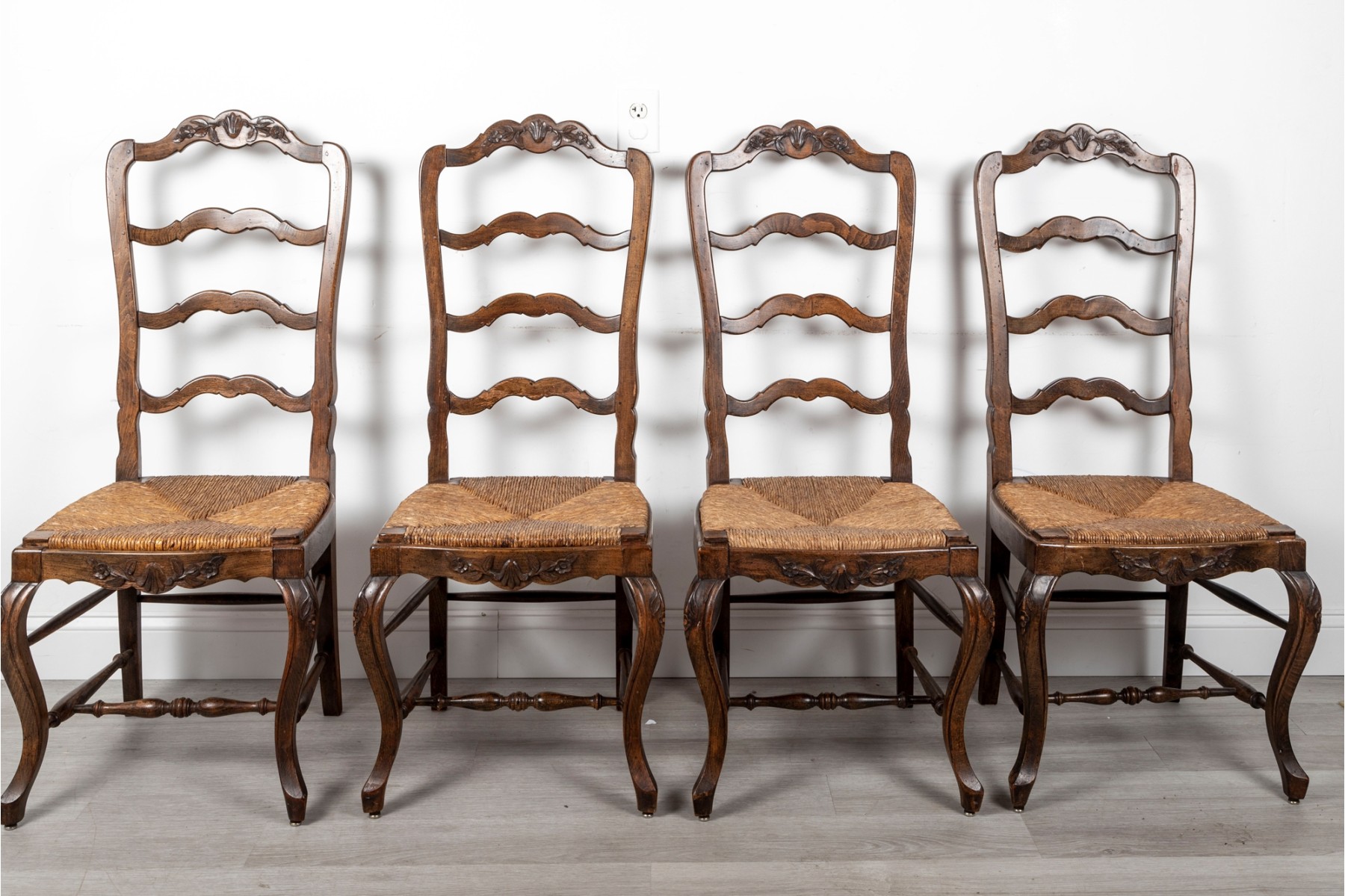 A set of four hardwood antique wooden ladder-back chairs with woven rush seats. The chairs feature carved detailing on the crest rails and shaped legs, typical of traditional or rustic styles like French Provincial or Louis XV, Circa late 20th century -- made in Spain by Miracle Americana International.