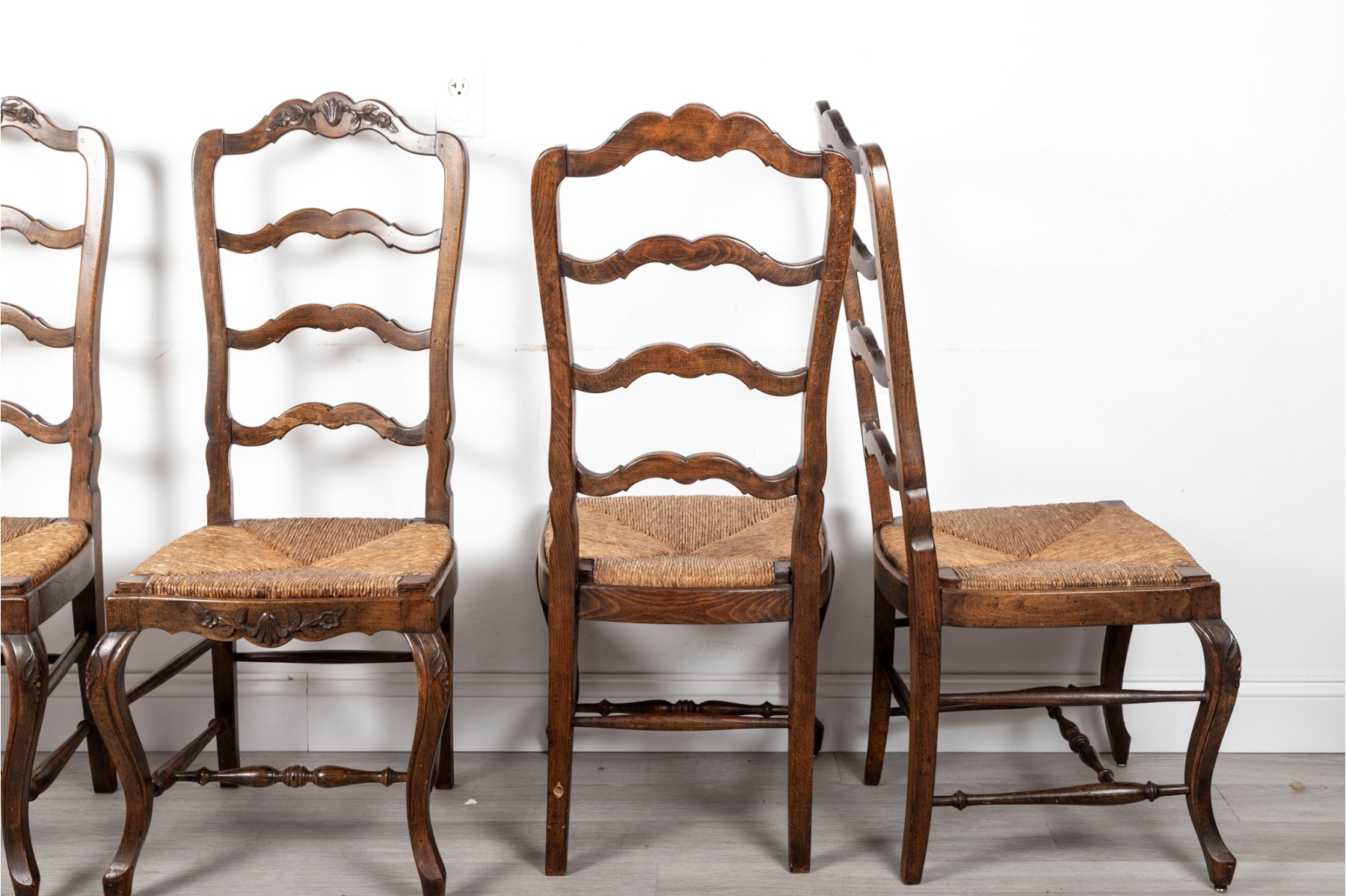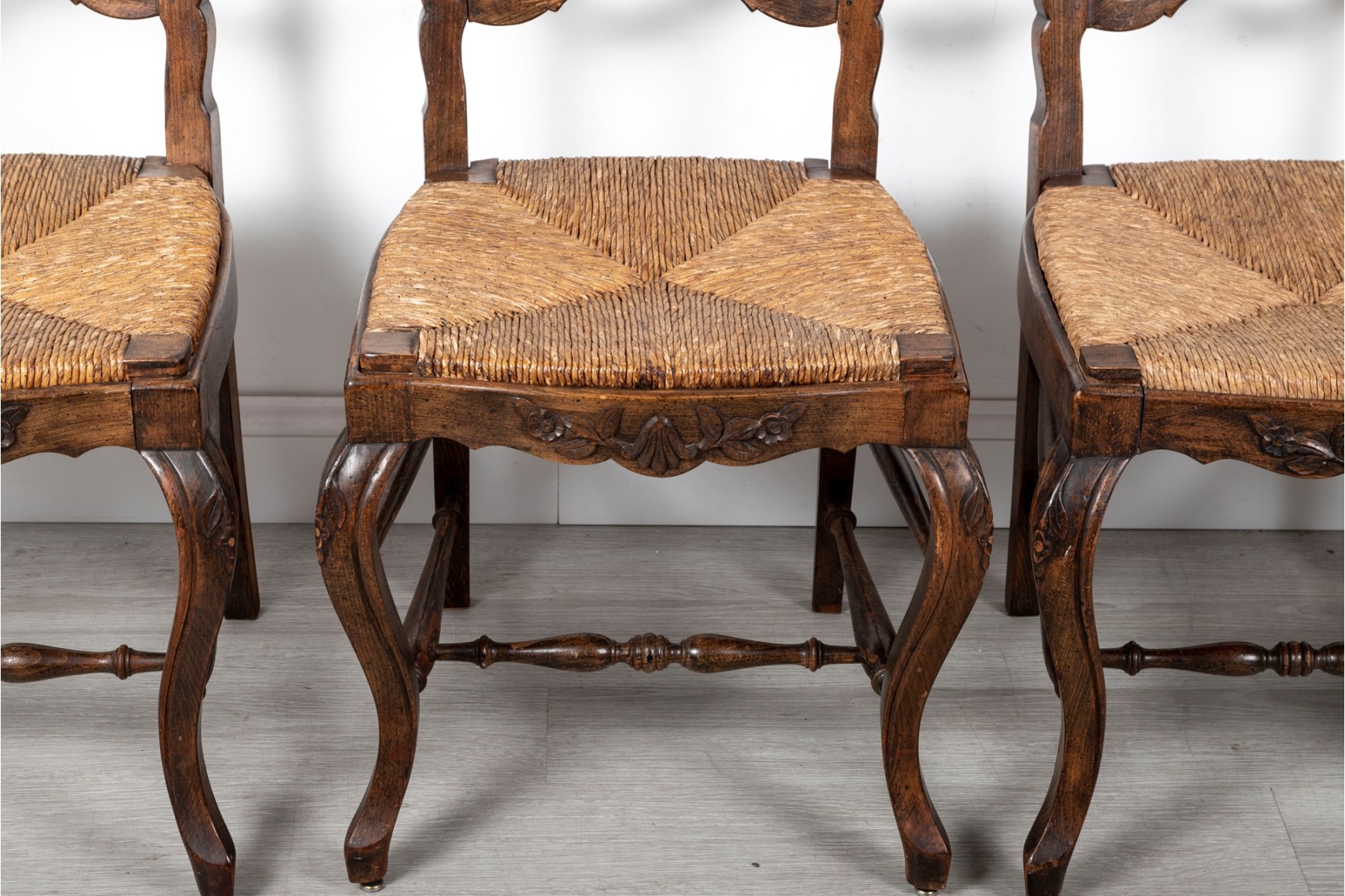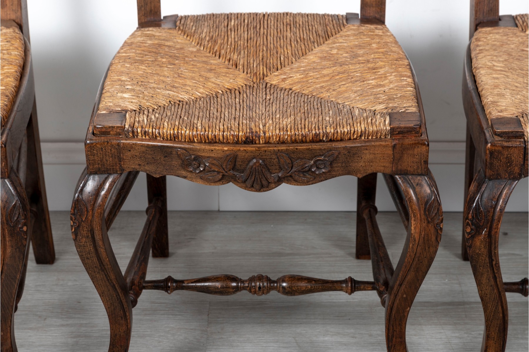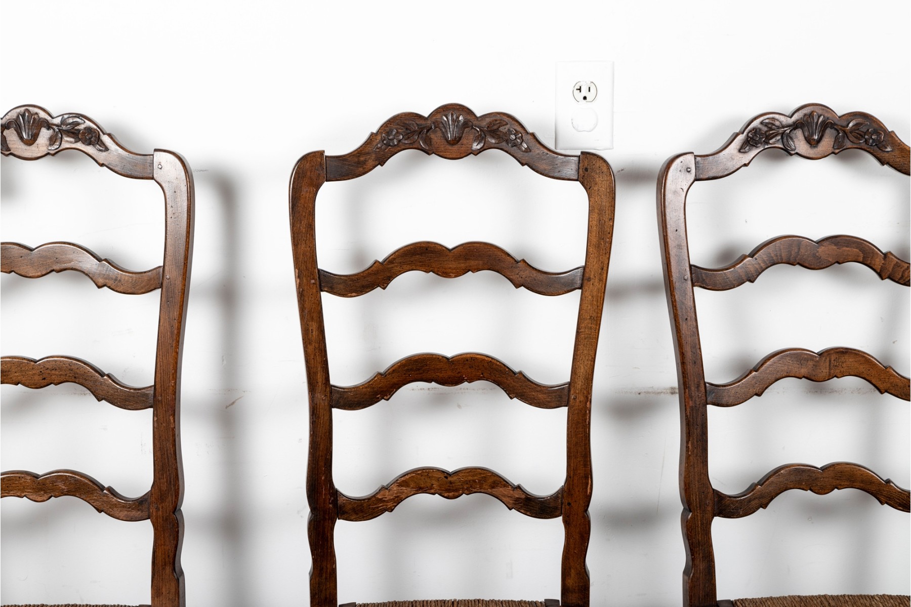 A set of four hardwood antique wooden ladder-back chairs with woven rush seats. The chairs feature carved detailing on the crest rails and shaped legs, typical of traditional or rustic styles like French Provincial or Louis XV, Circa late 20th century -- made in Spain by Miracle Americana International.