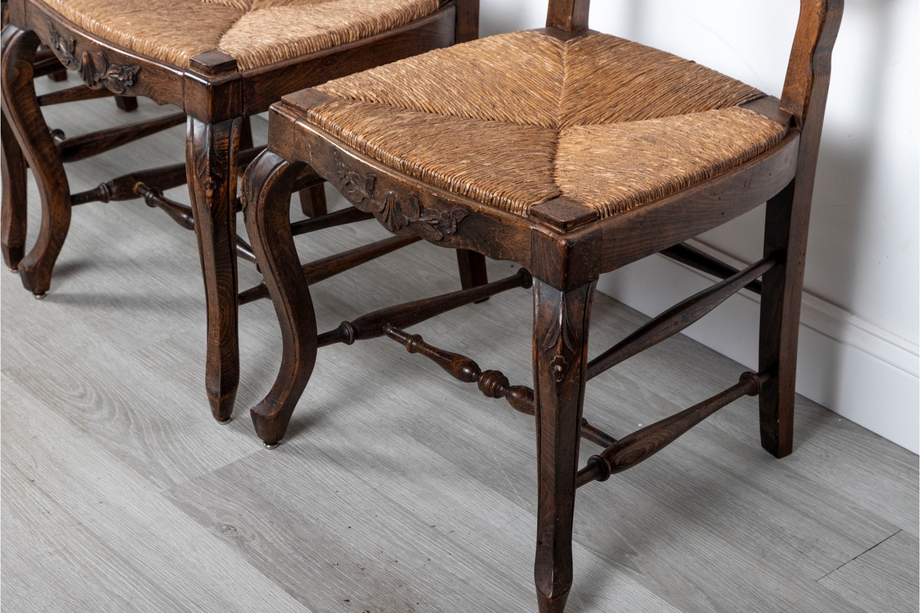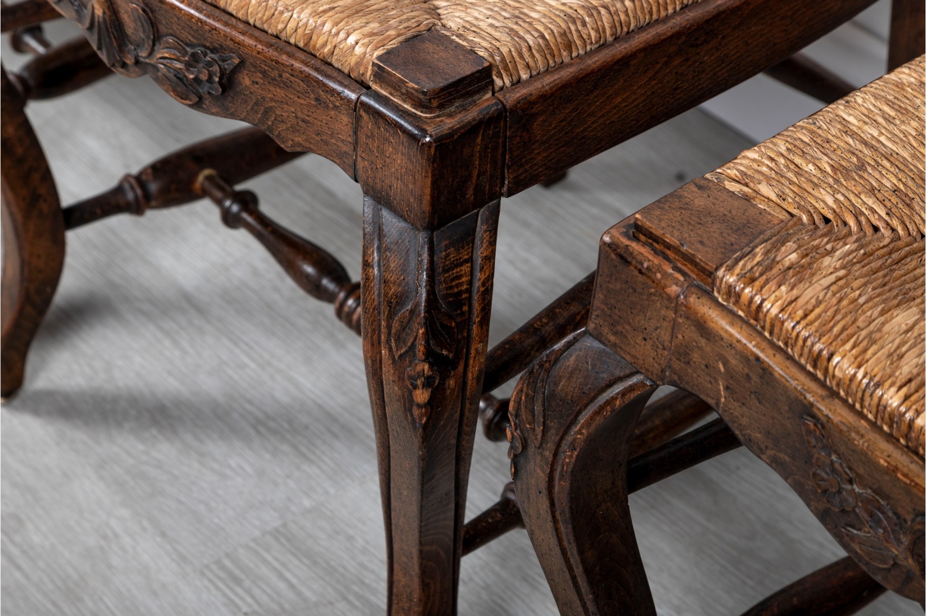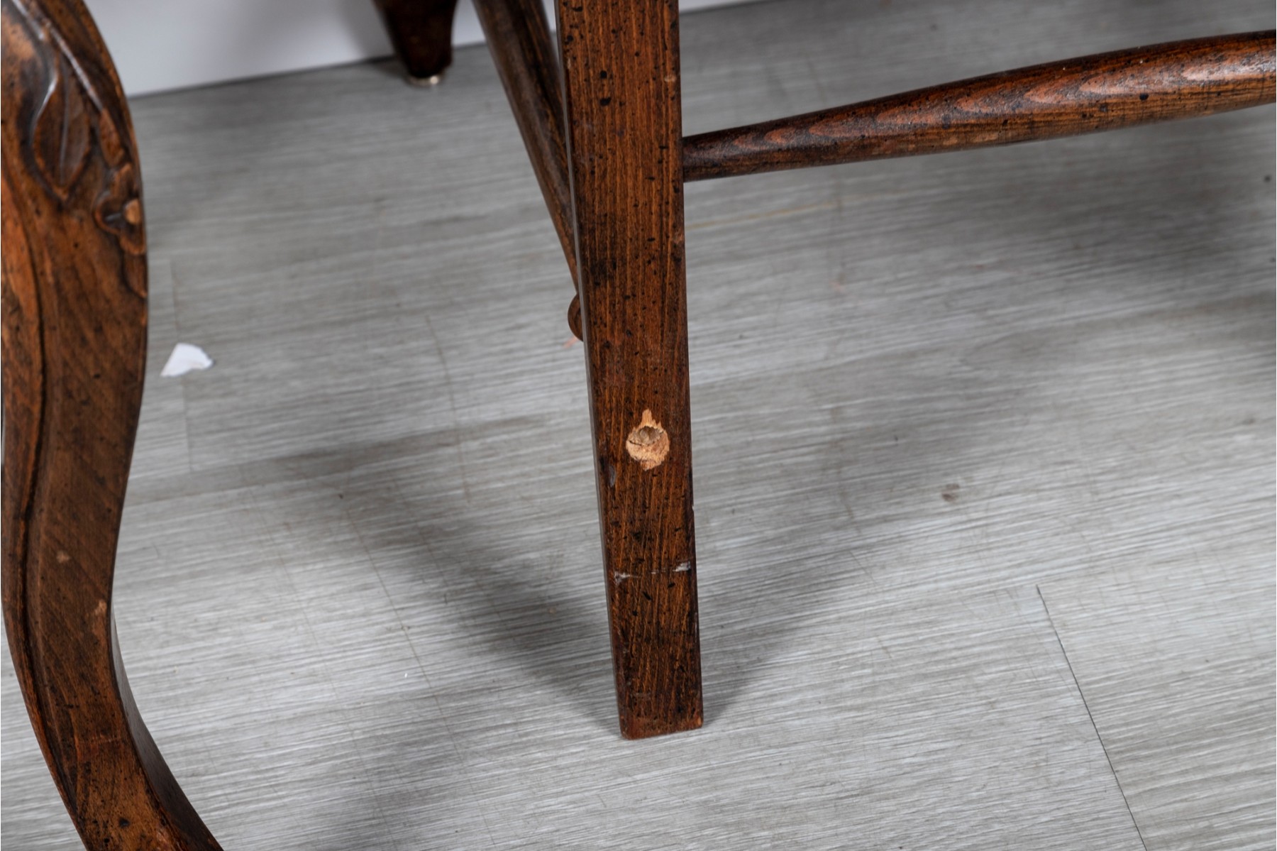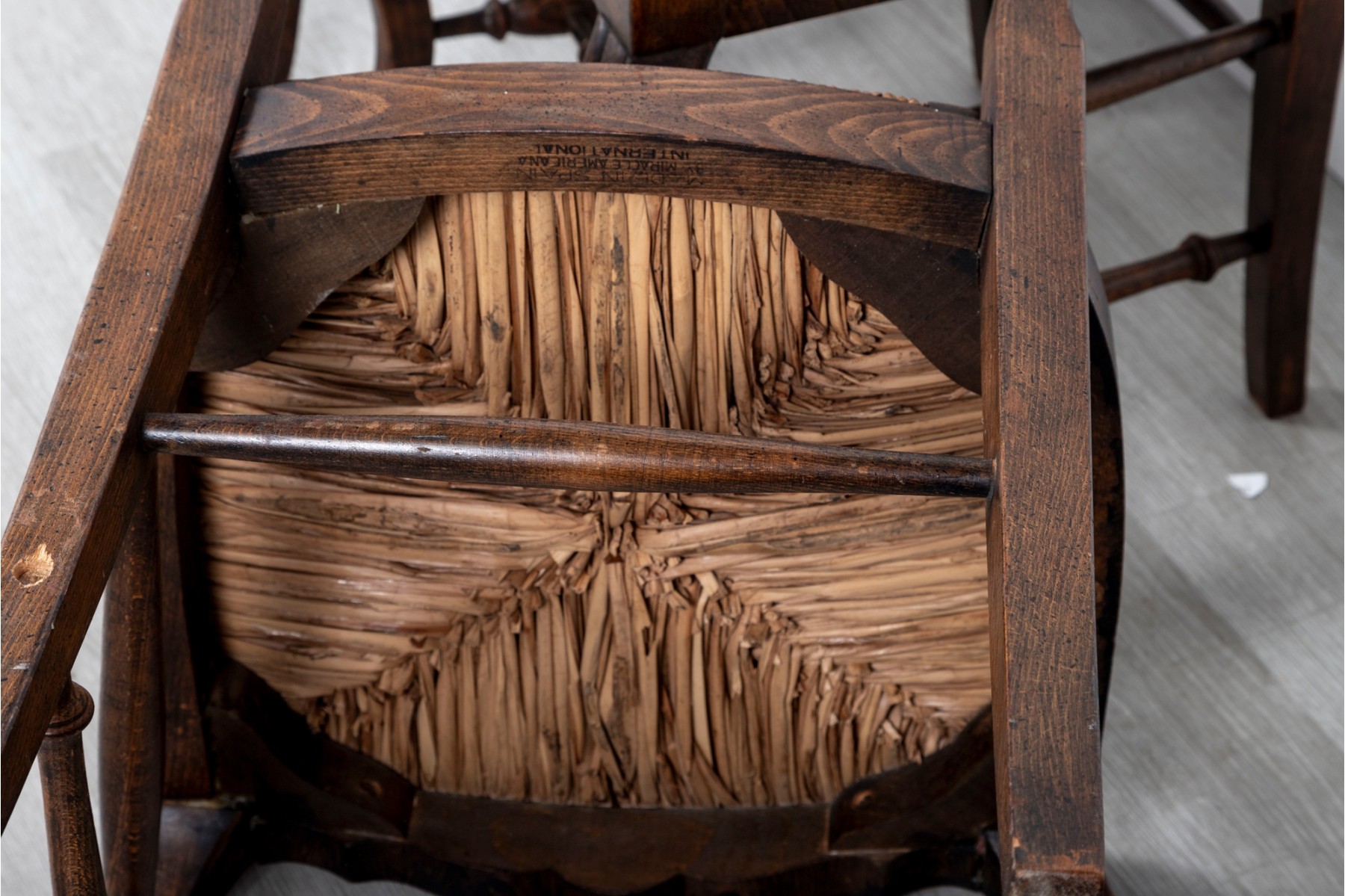 Exposed stretcher plug on one chair -- Likely an unfinished repair. Small losses to rush seats and losses to finish, but overall presents well.