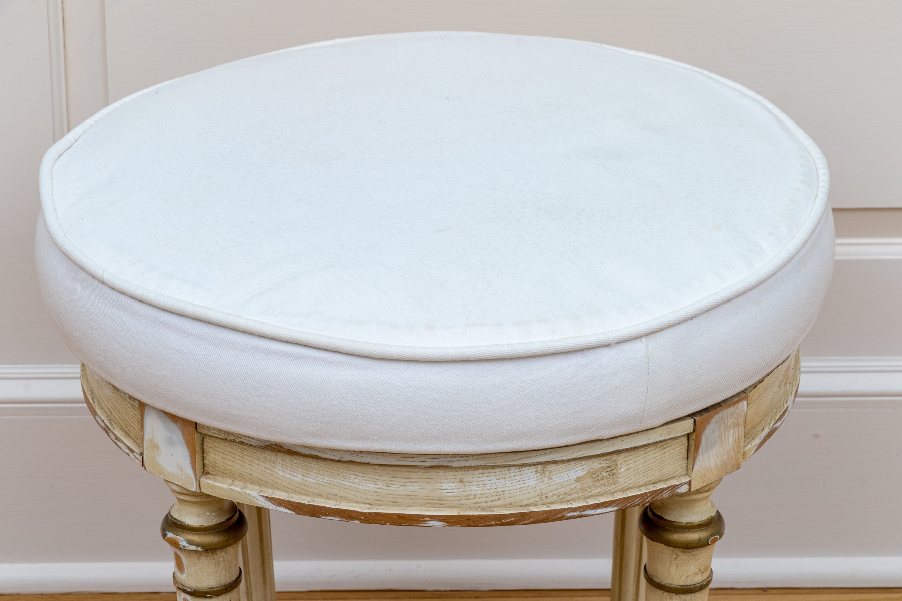 Standing on four carved tapered and fluted and paint finished legs with circular white cushion with piped trim.