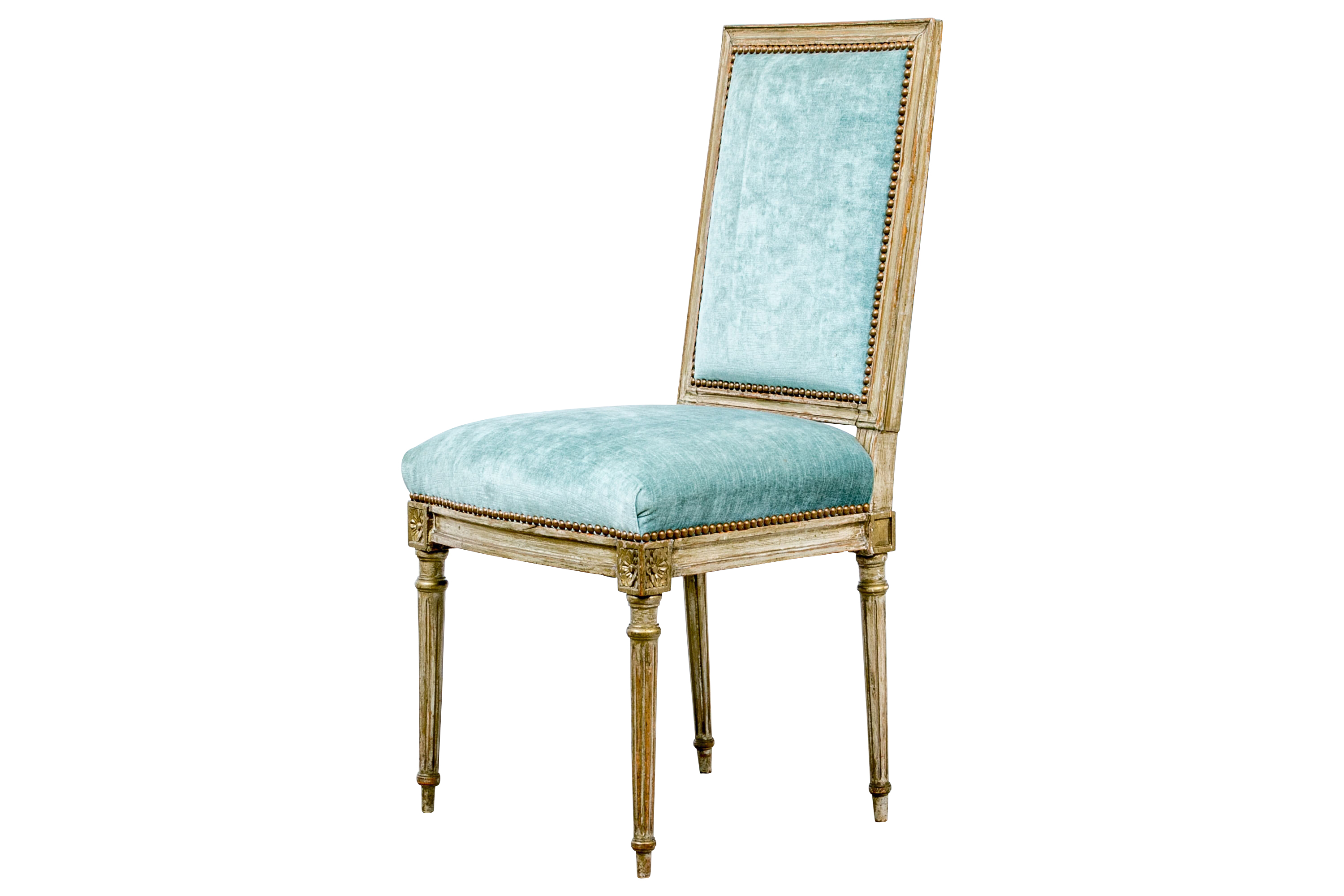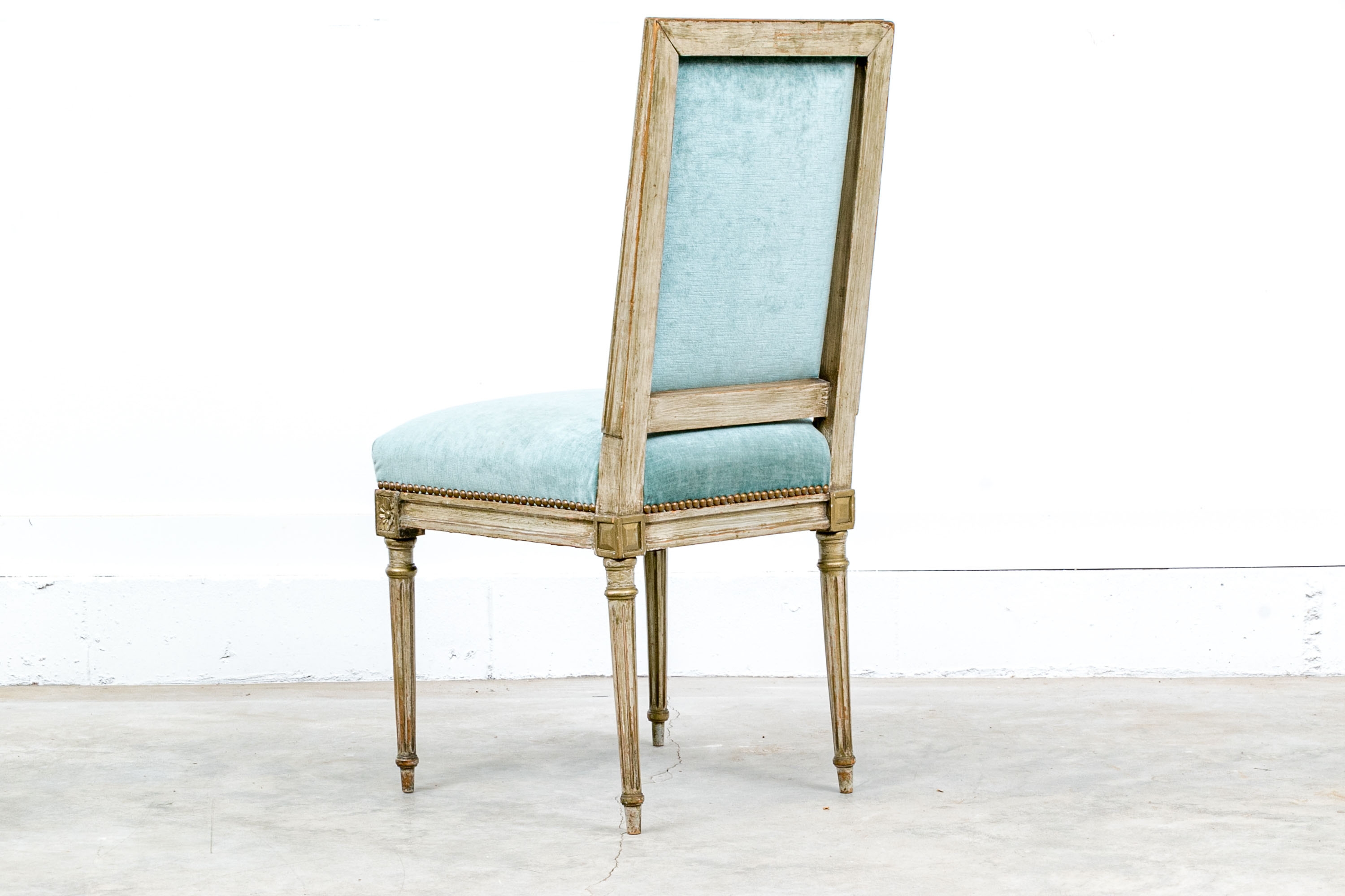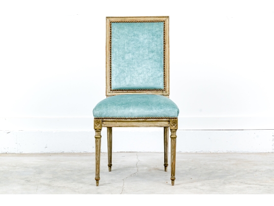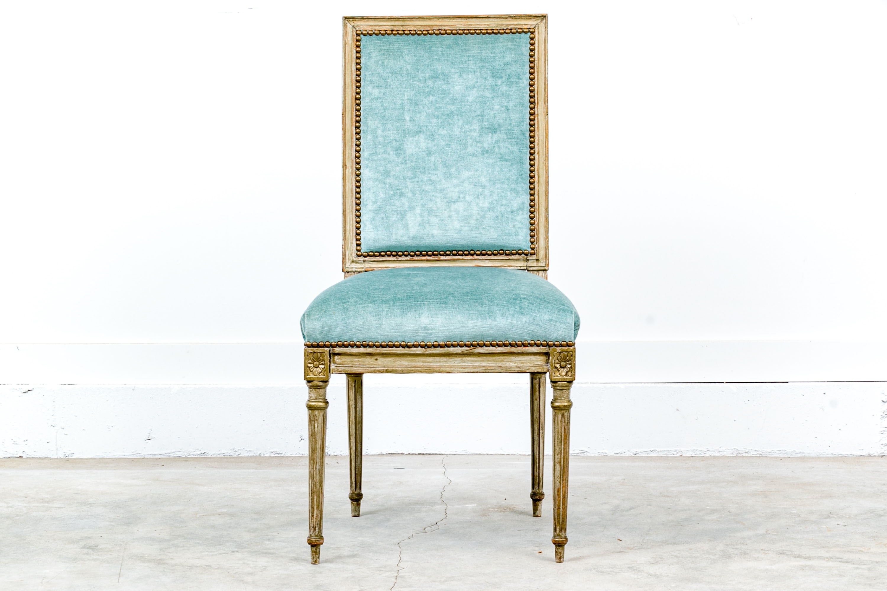 Louis XVI style paint decorated side chair in blue velvet upholstery with rectangular back, brass tack decoration, carved medallions in gold and the whole resting upon fluted legs.