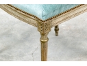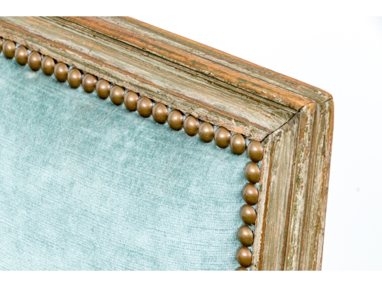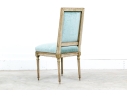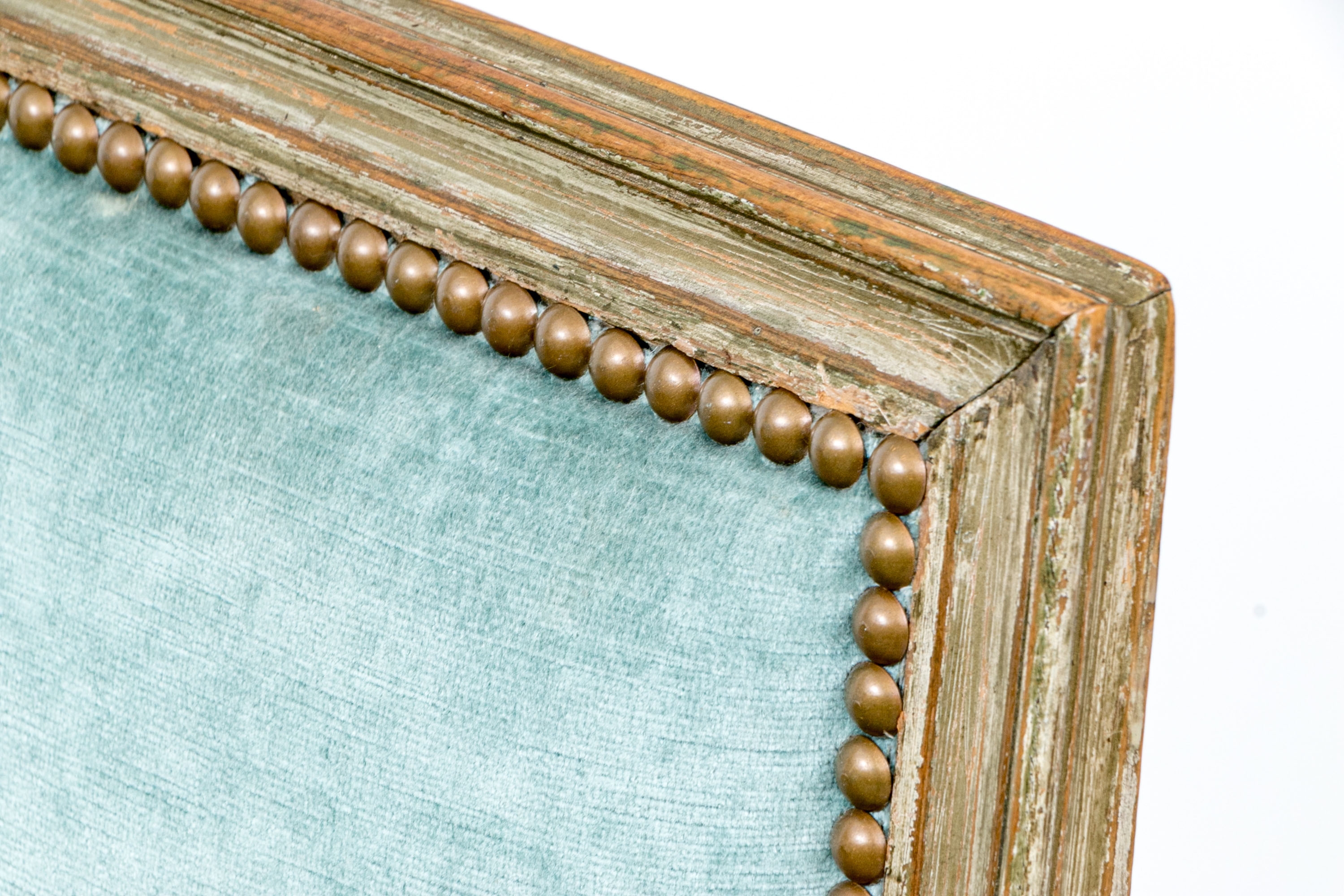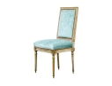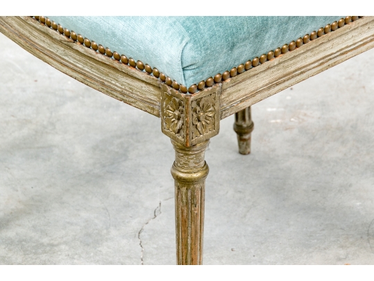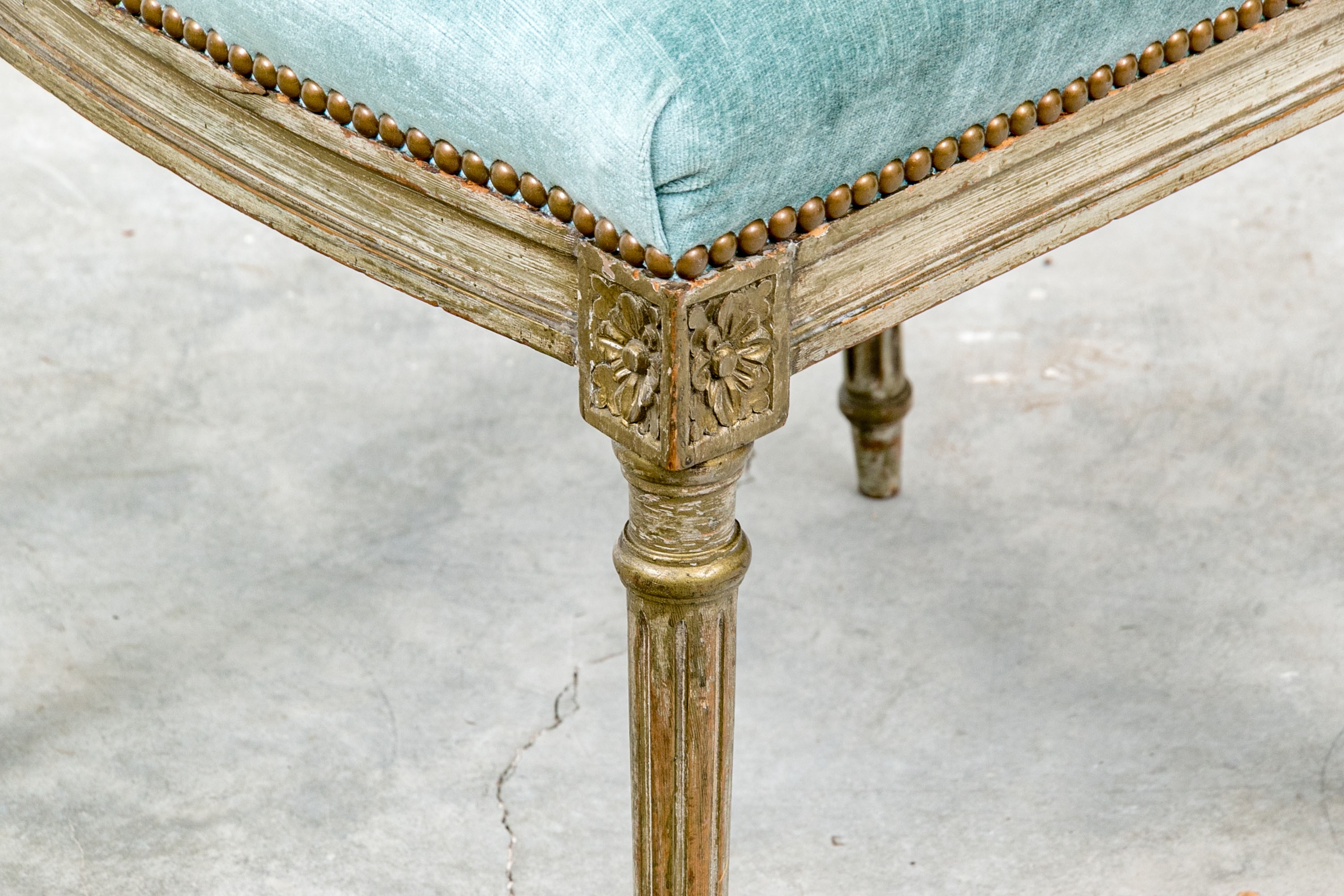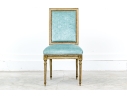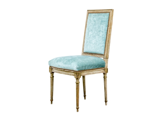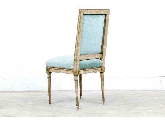 Louis XVI style paint decorated side chair in blue velvet upholstery with rectangular back, brass tack decoration, carved medallions in gold and the whole resting upon fluted legs.