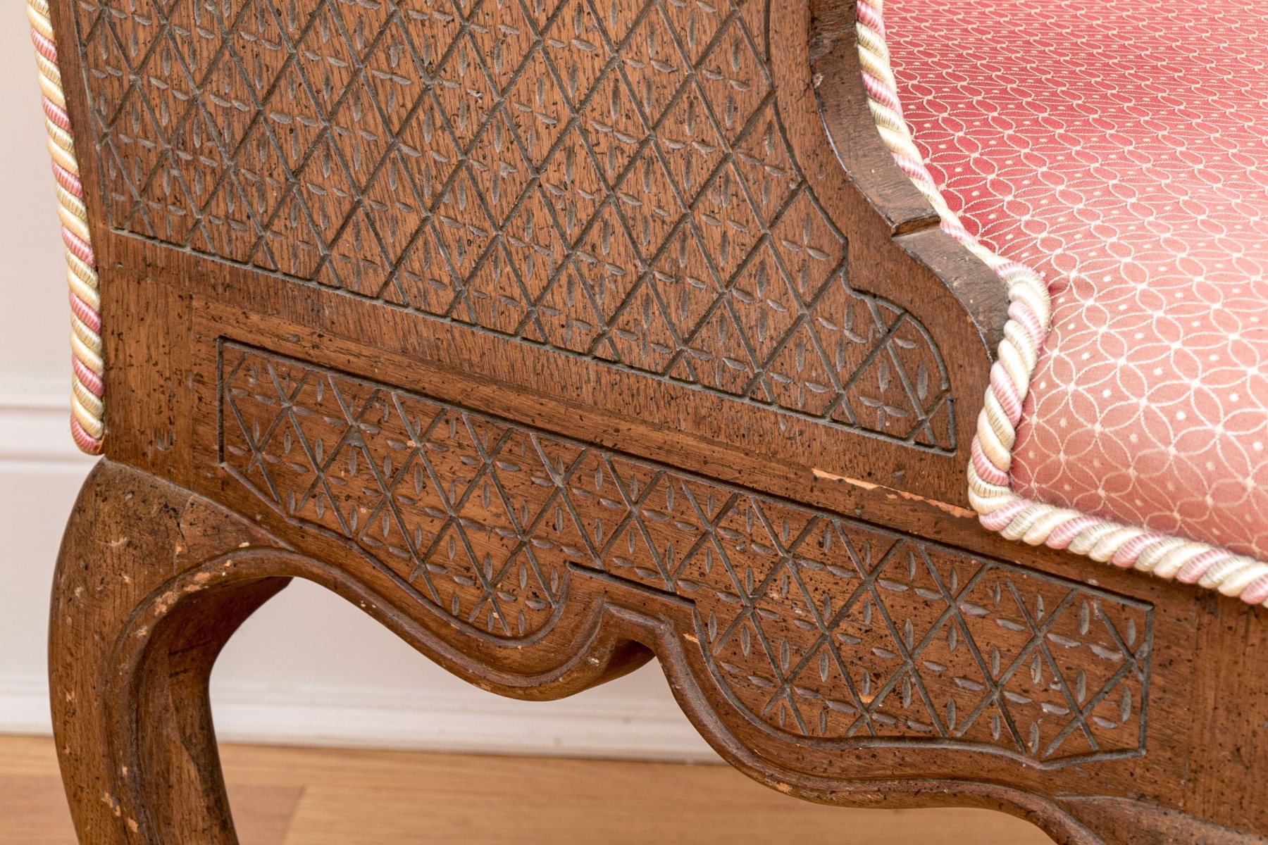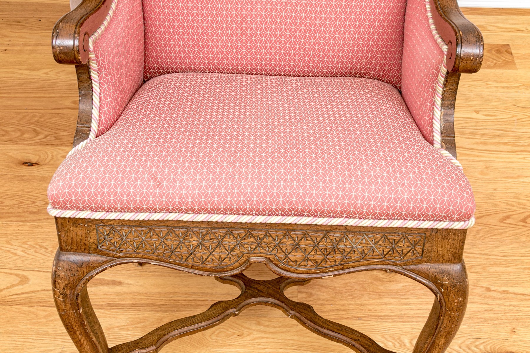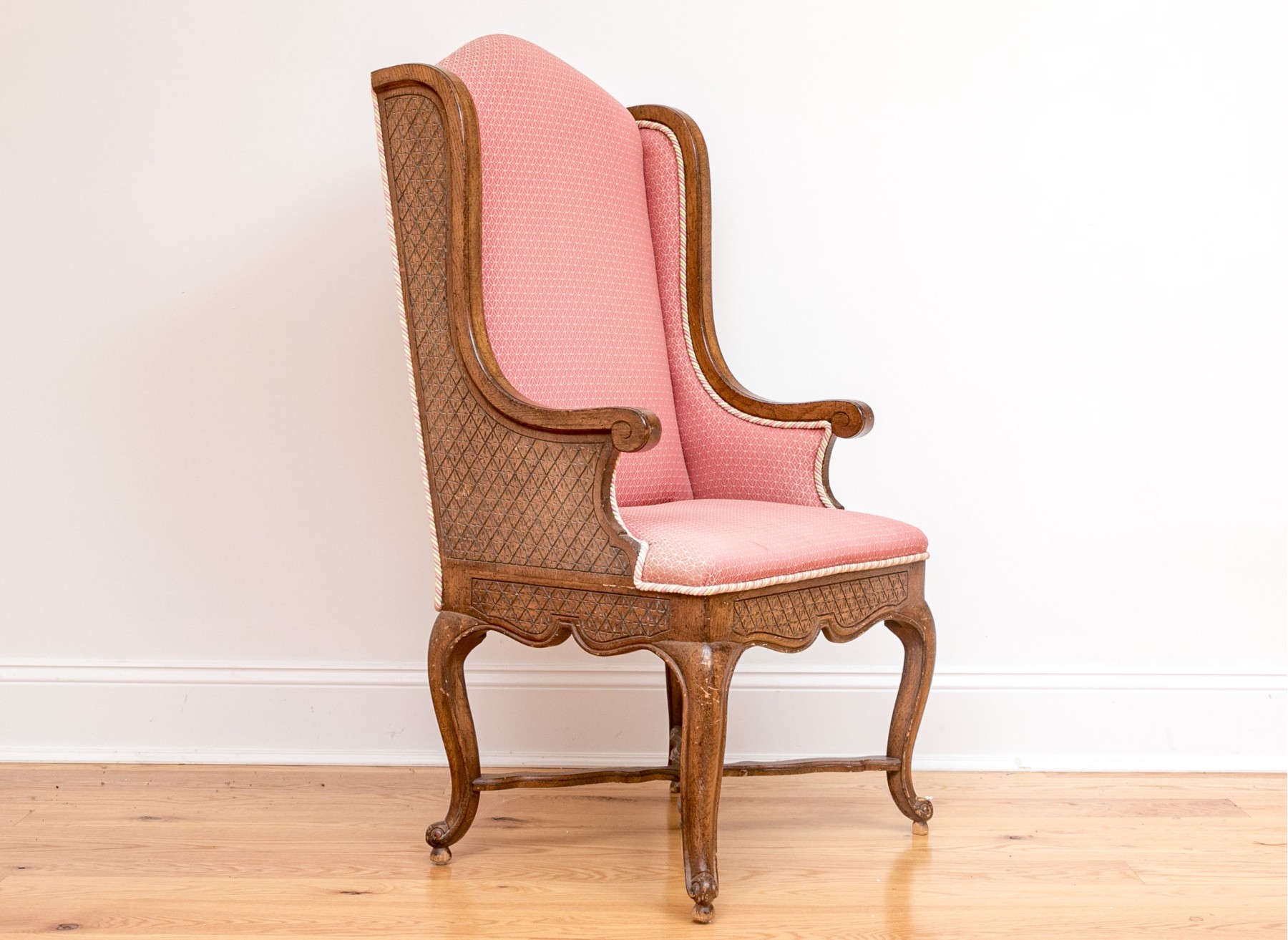 Tall wingback chair in the Louis XVI style, characterized by its tall arched back, deep upholstered seating, gracefully scrolling arms, intricately carved apron, and a fully carved wood back. The chair features a nicely shaped X-style stretcher, providing both structural support and an additional decorative element. Supported by sturdy cabriole legs, the chair concludes with ball casters