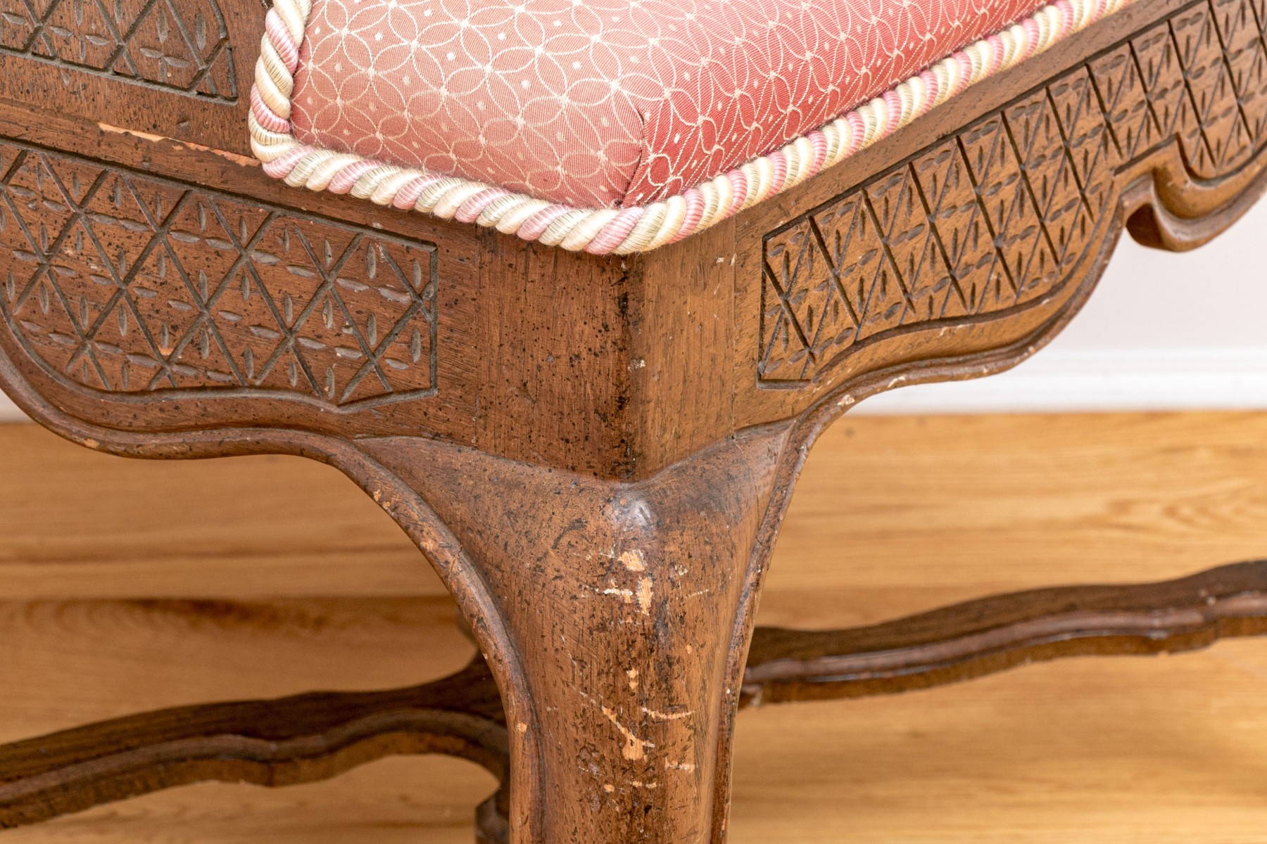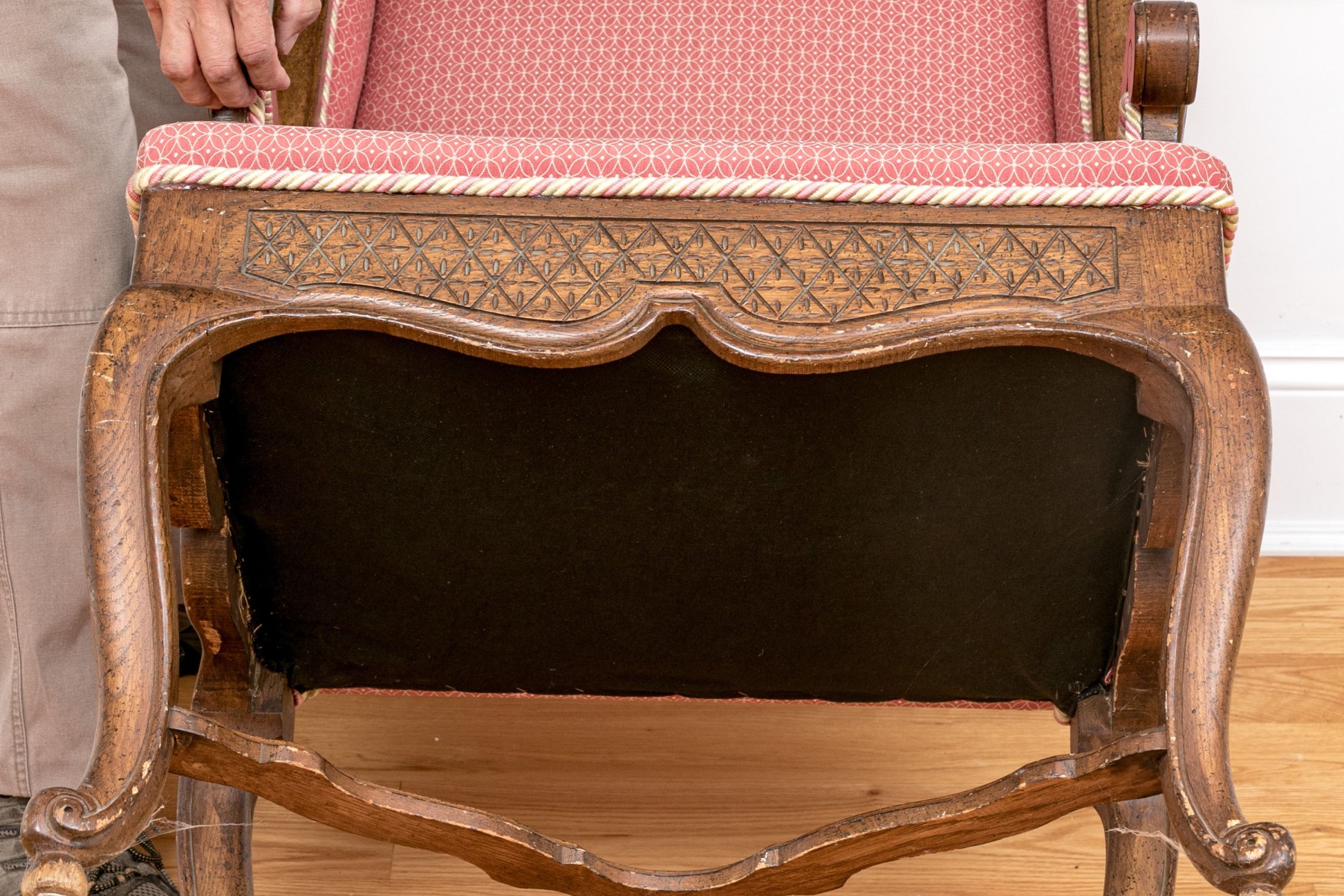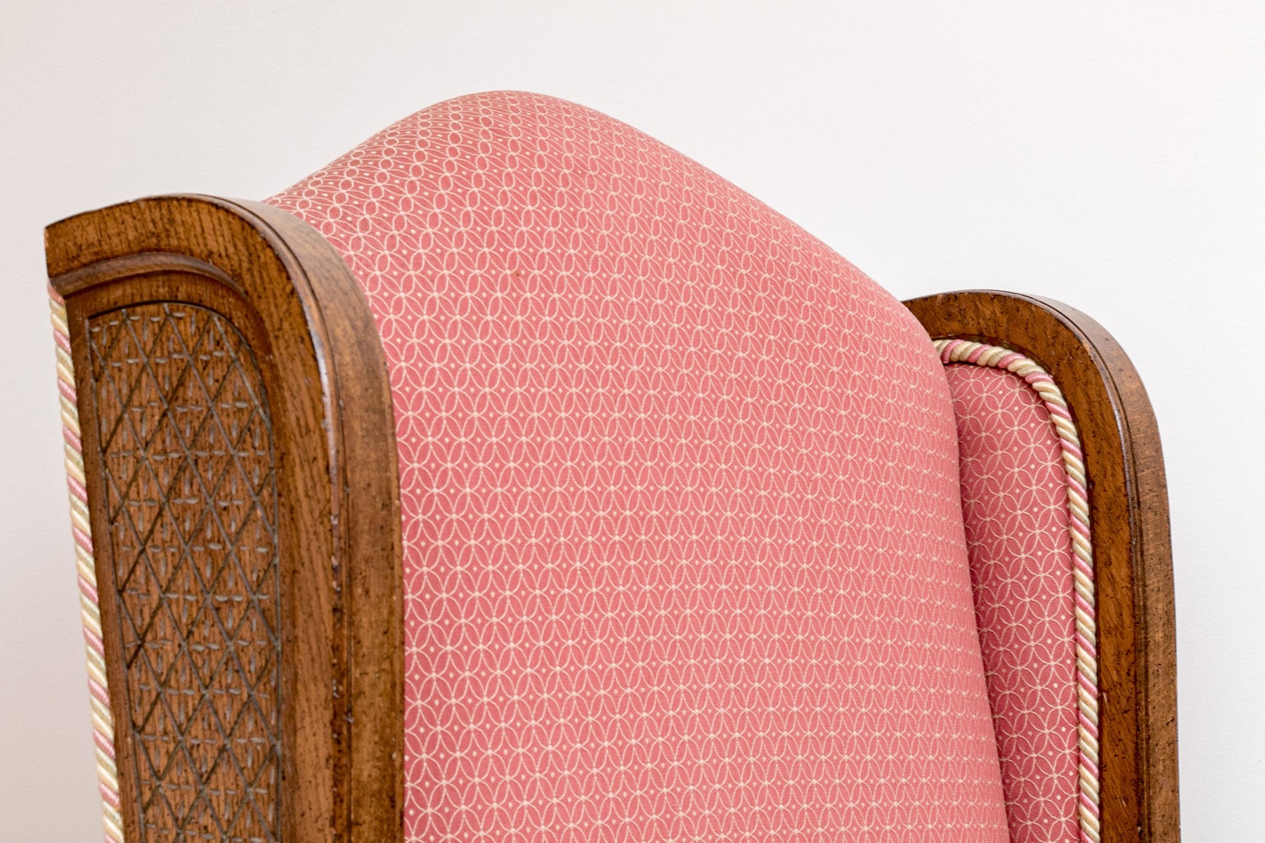 Tall wingback chair in the Louis XVI style, characterized by its tall arched back, deep upholstered seating, gracefully scrolling arms, intricately carved apron, and a fully carved wood back. The chair features a nicely shaped X-style stretcher, providing both structural support and an additional decorative element. Supported by sturdy cabriole legs, the chair concludes with ball casters