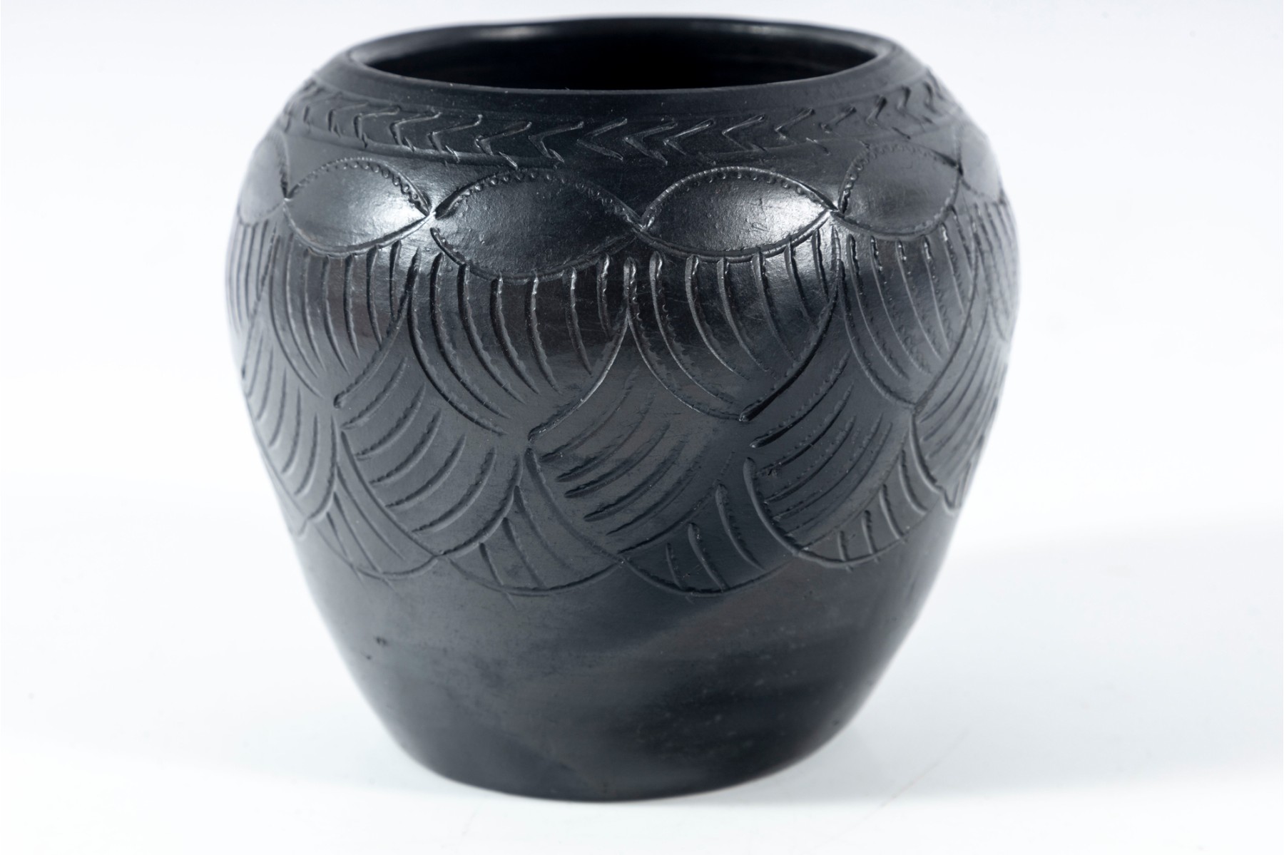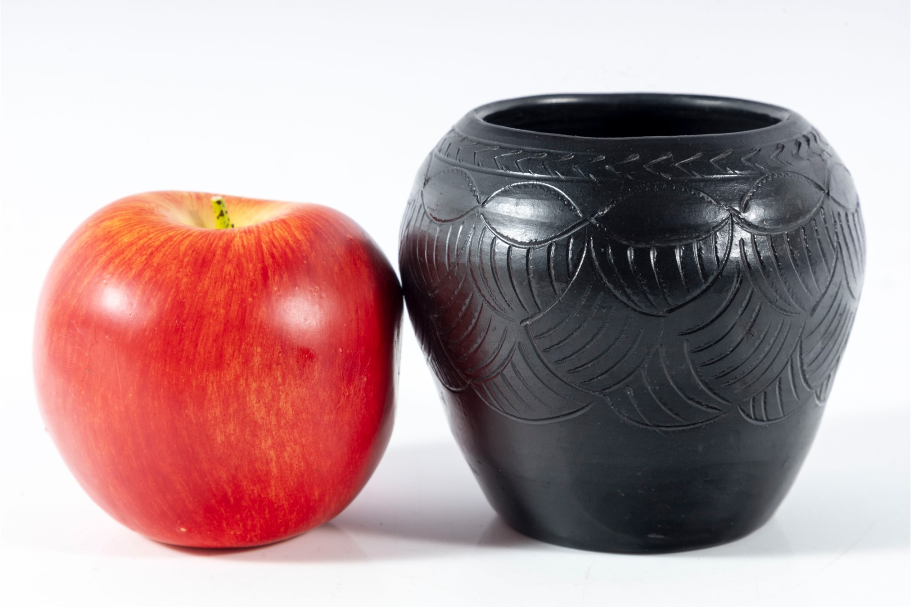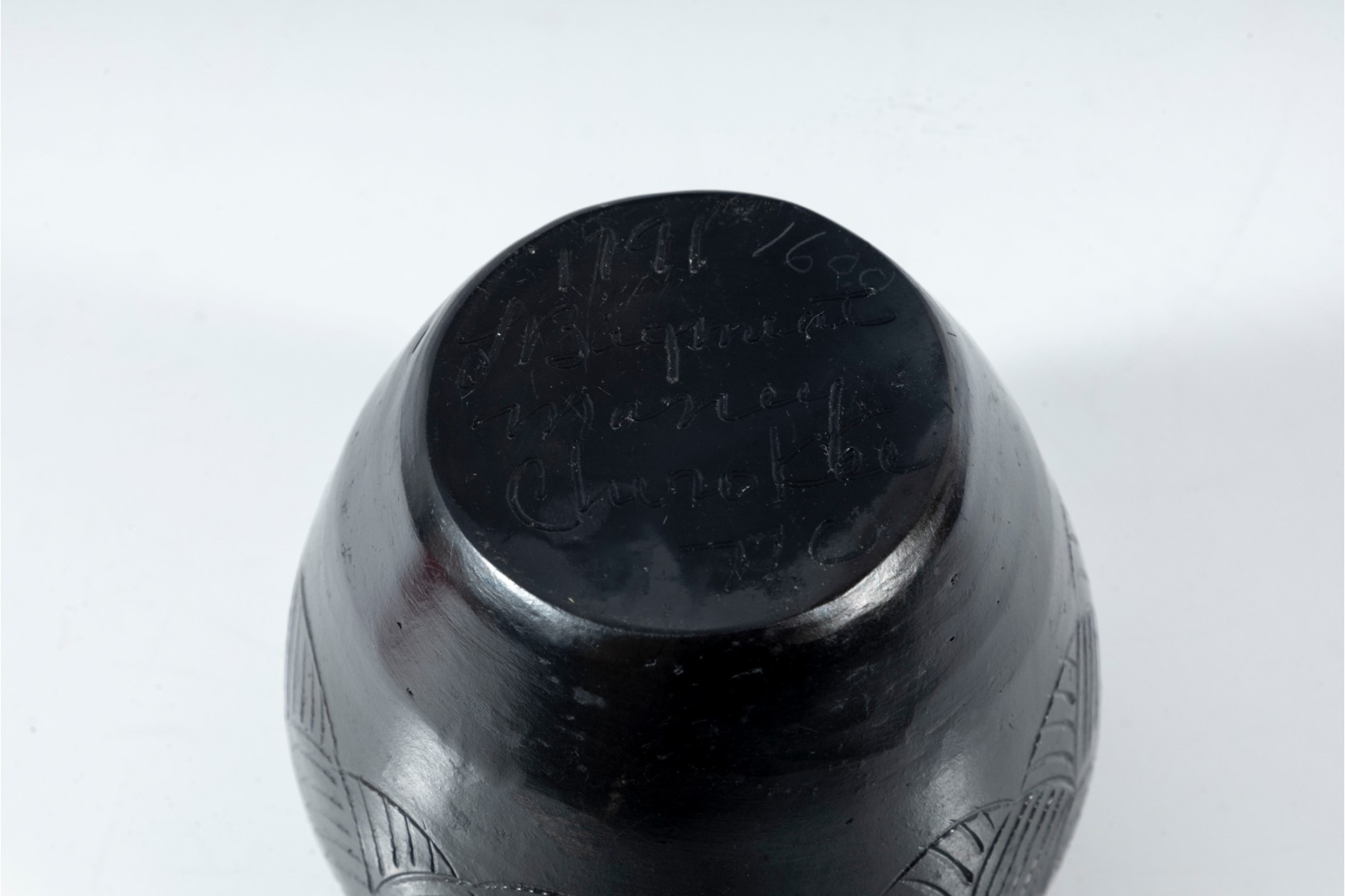 Louise Bigmeat Maney was active in the western North Carolina crafts community, producing Cherokee Indian pottery known for its black, shiny finish, achieved through several stages of polishing and firing with soft woods. A date and detailed signature remains incised at the bottom, see photos for details.