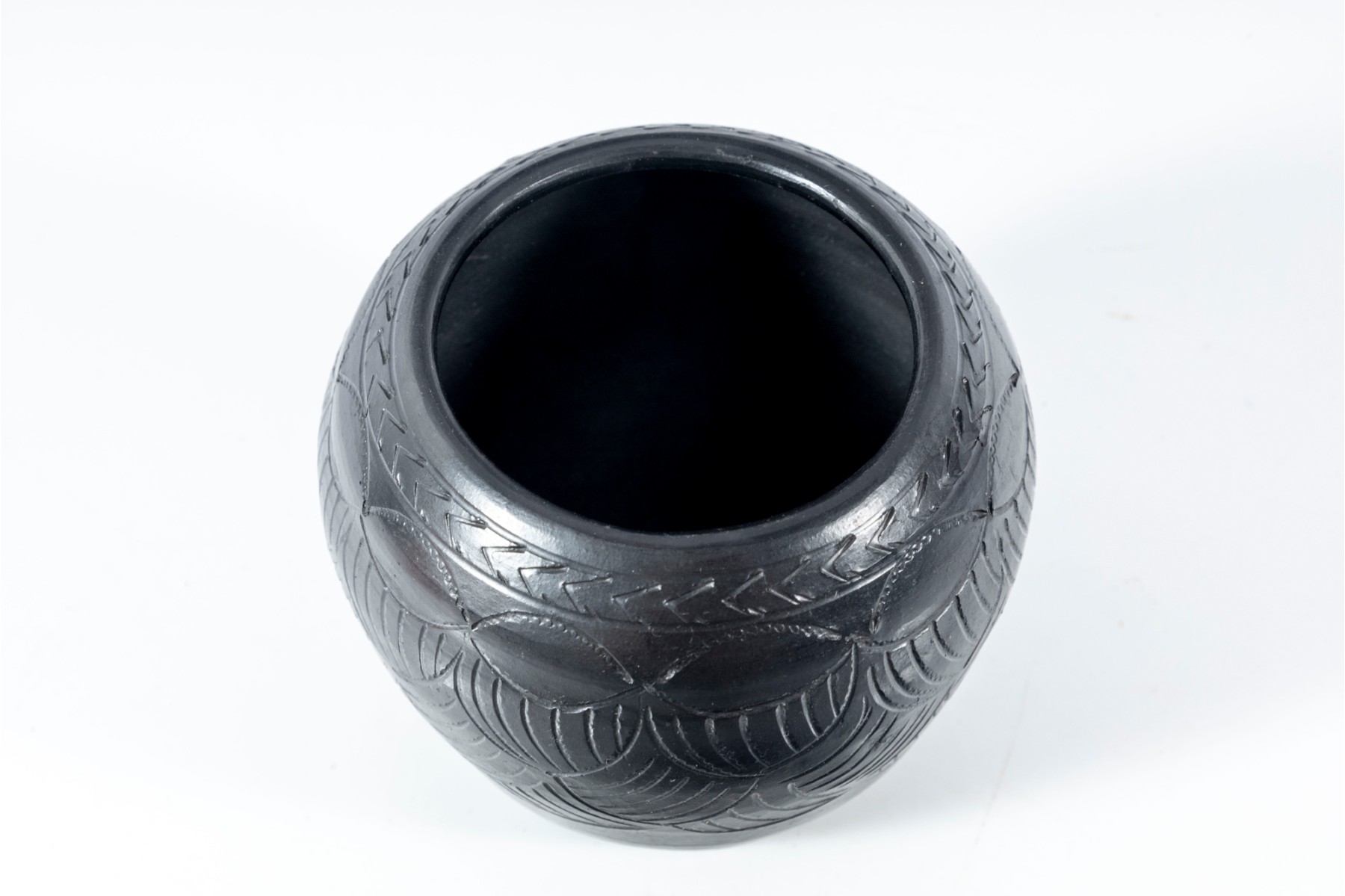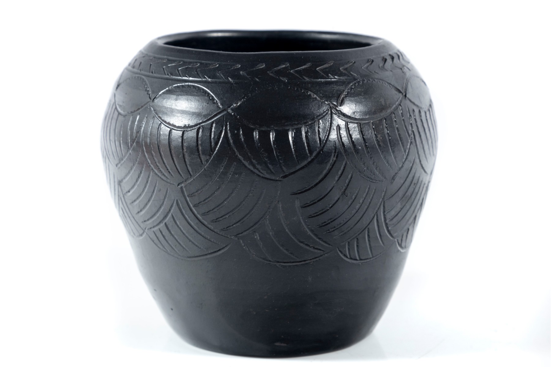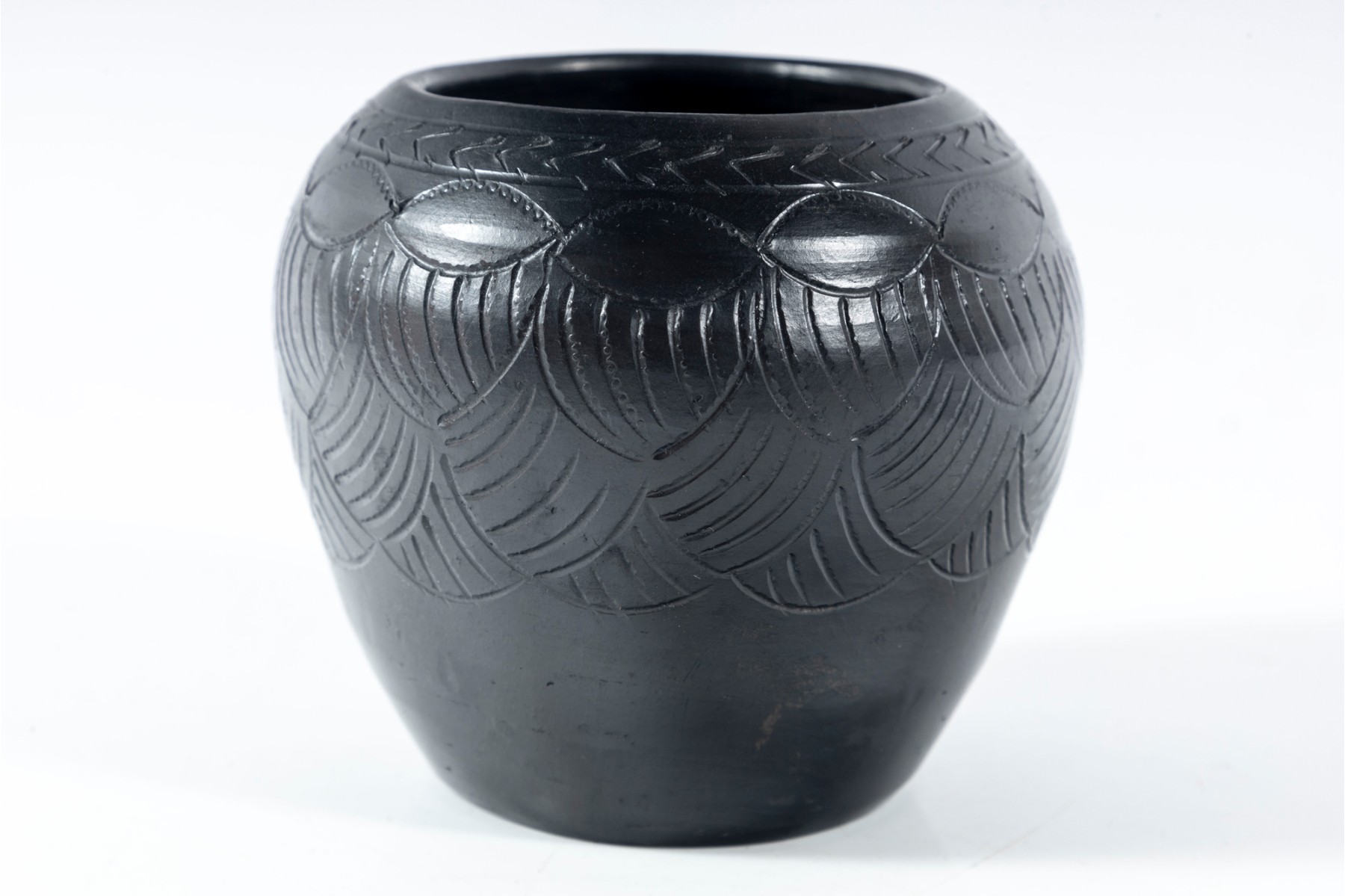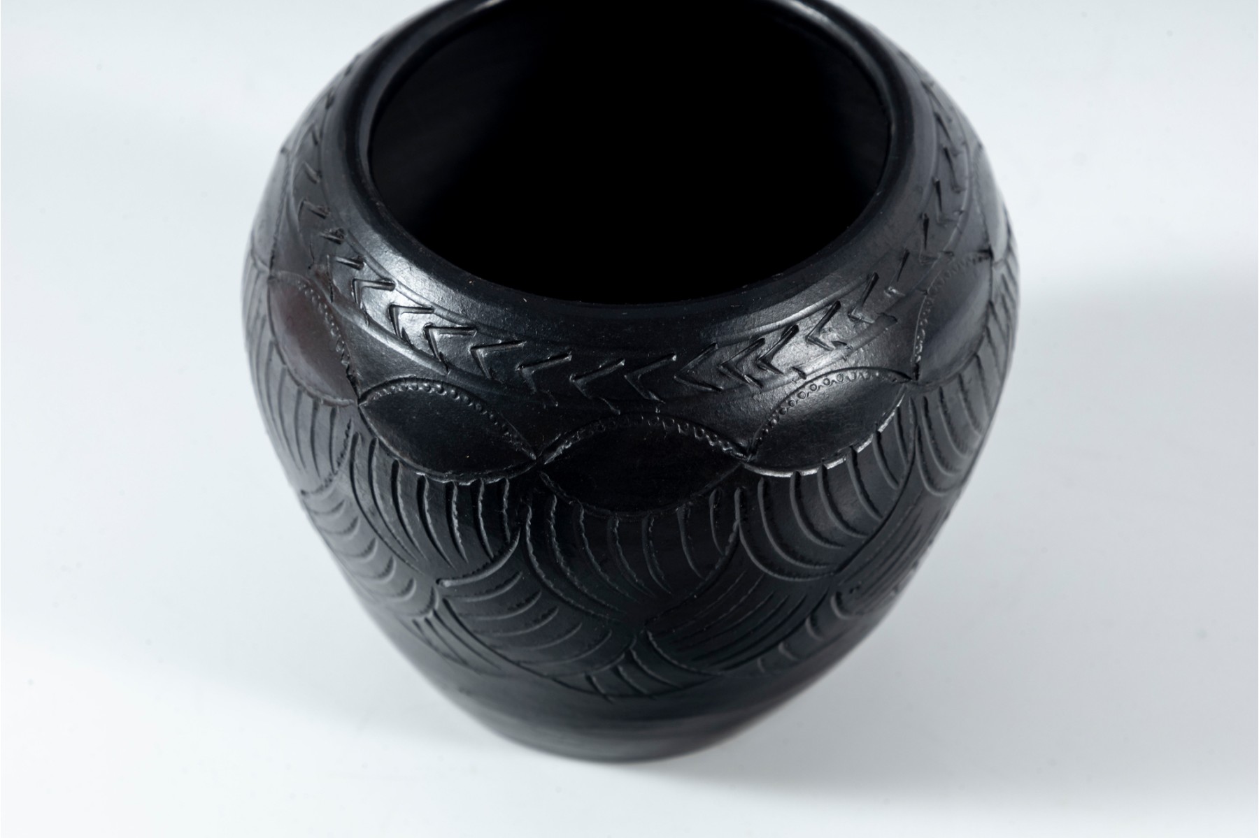Louise Bigmeat Maney was active in the western North Carolina crafts community, producing Cherokee Indian pottery known for its black, shiny finish, achieved through several stages of polishing and firing with soft woods. A date and detailed signature remains incised at the bottom, see photos for details.