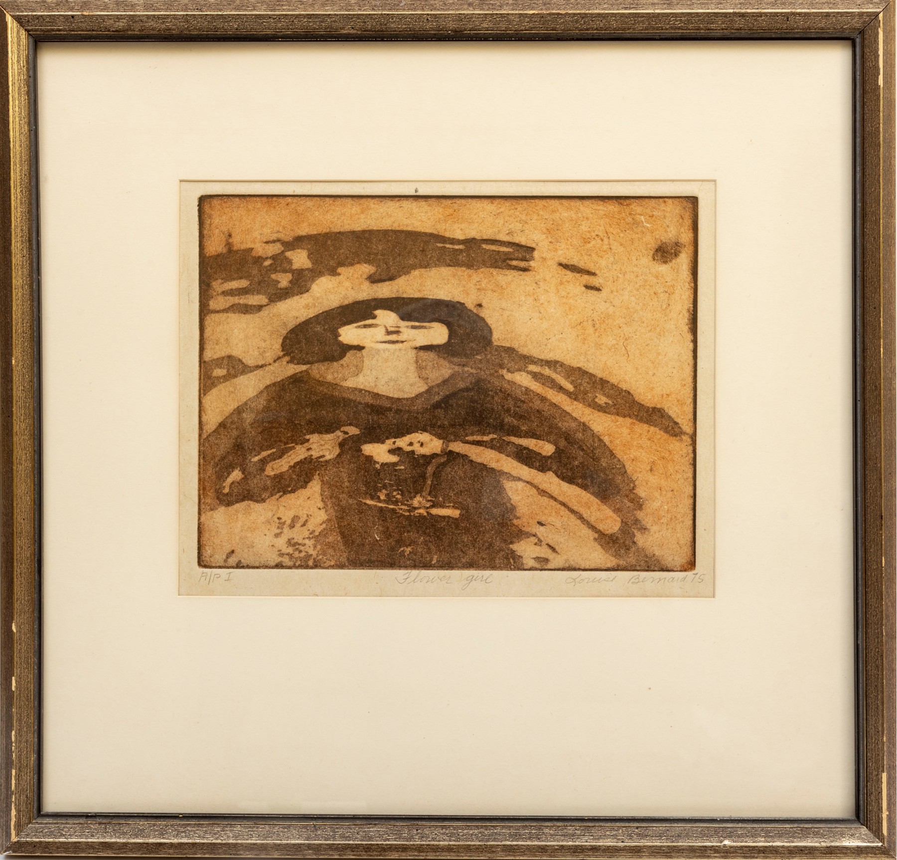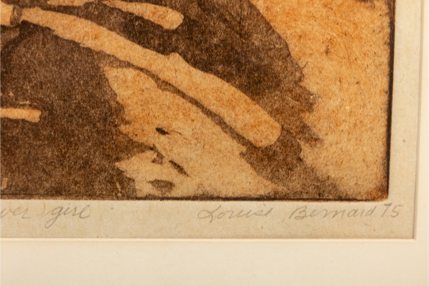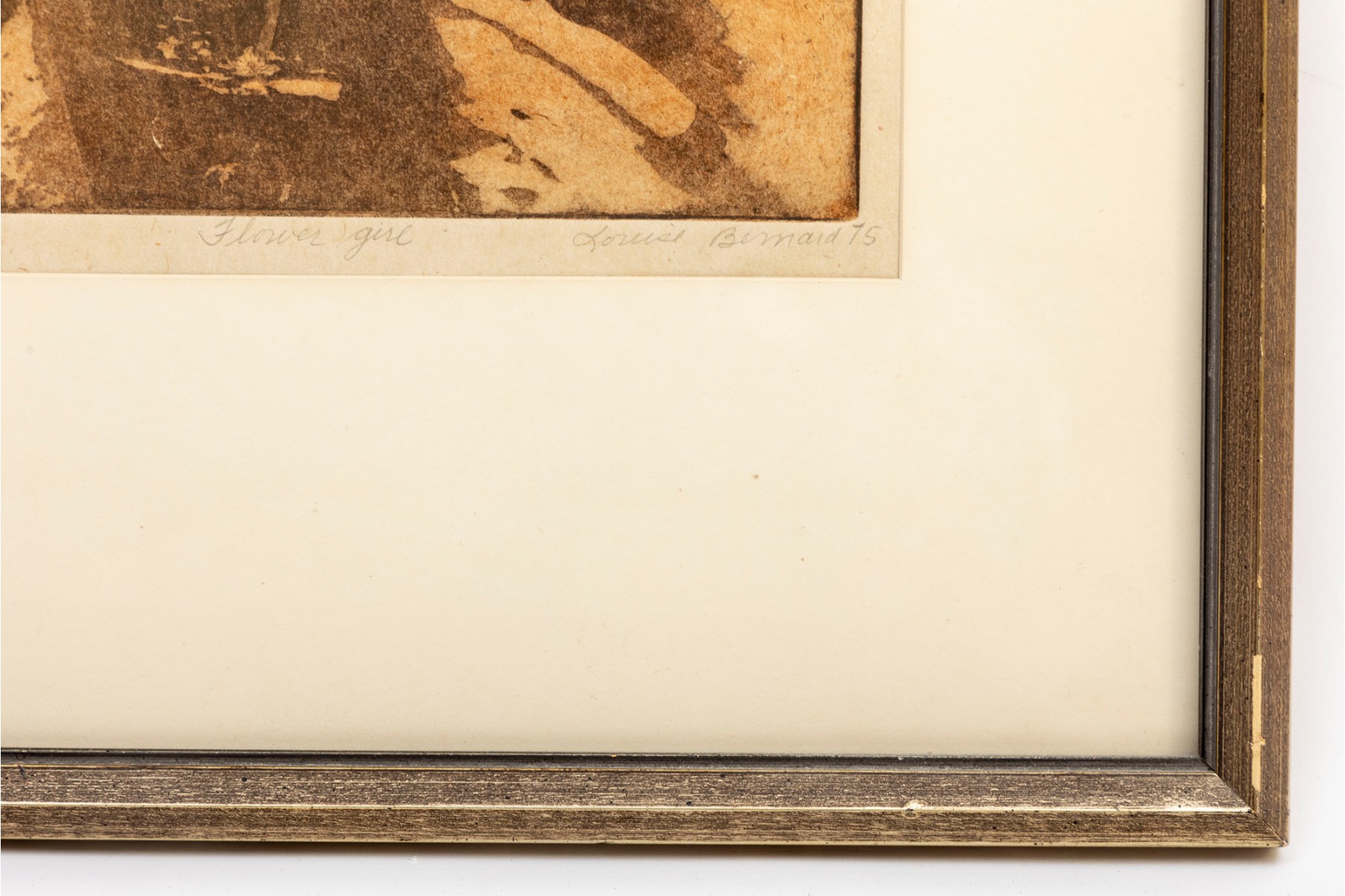 1975 Limited edition artist's proof print entitled, "Flower Girl" by American Artist Louise N. Bernard. The print is presented in a silvered wood frame faced with glass, and accented with a white mat border.