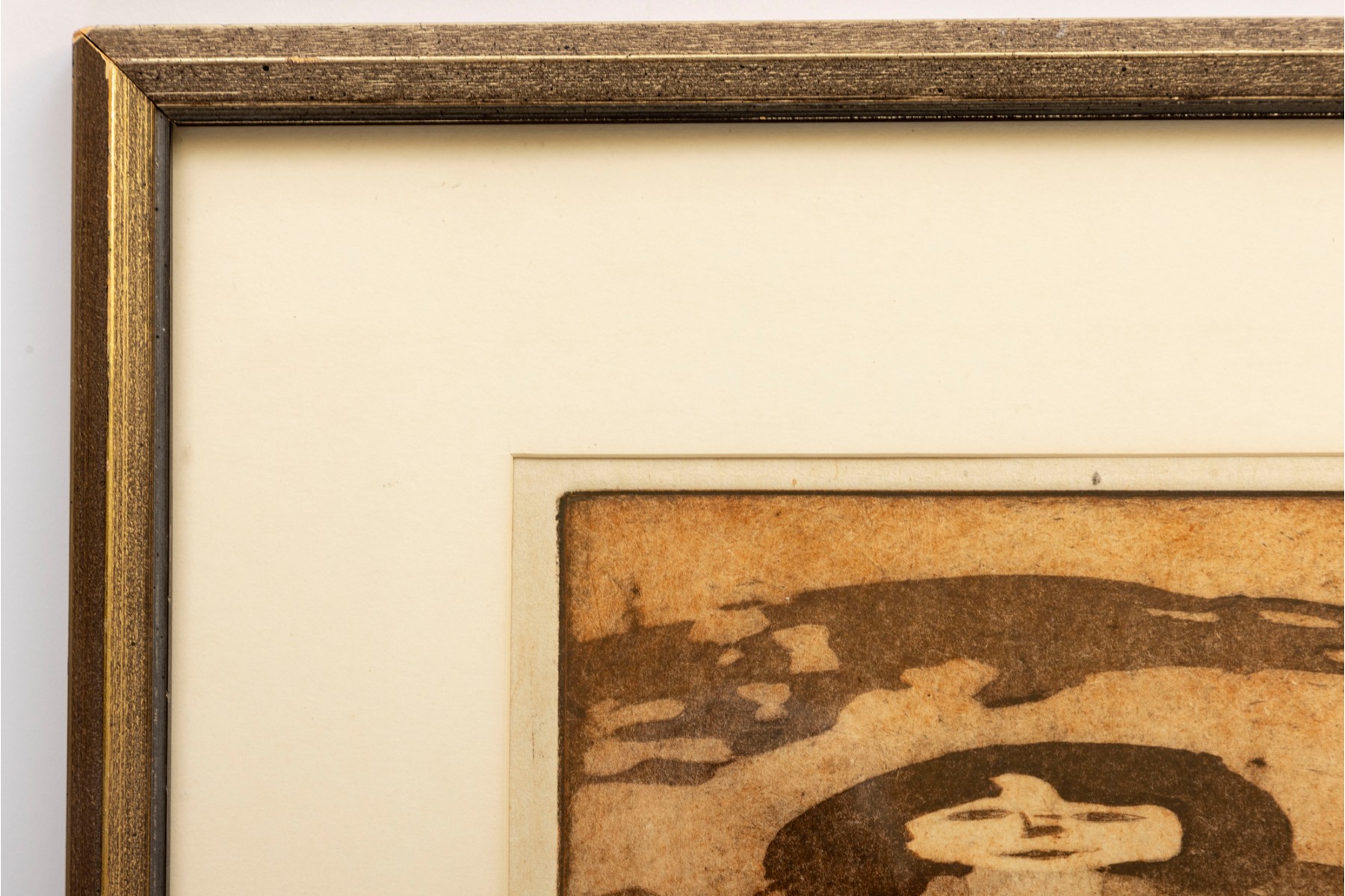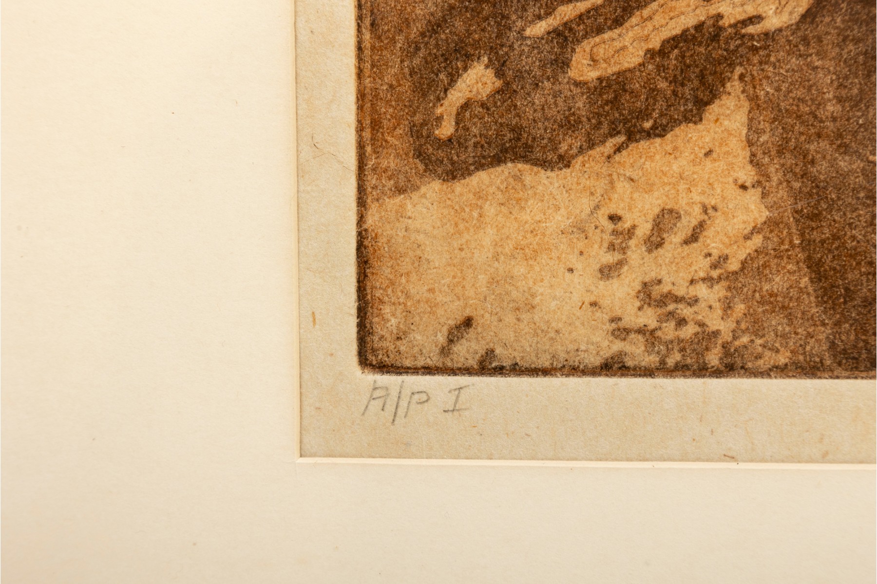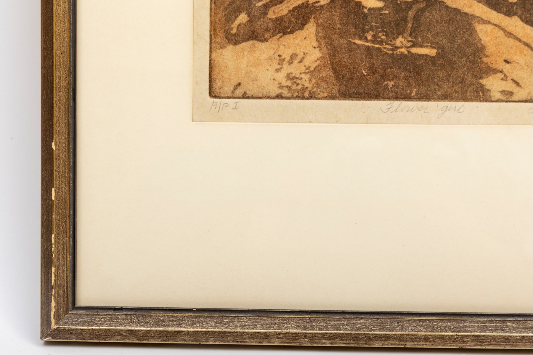 1975 Limited edition artist's proof print entitled, "Flower Girl" by American Artist Louise N. Bernard. The print is presented in a silvered wood frame faced with glass, and accented with a white mat border.