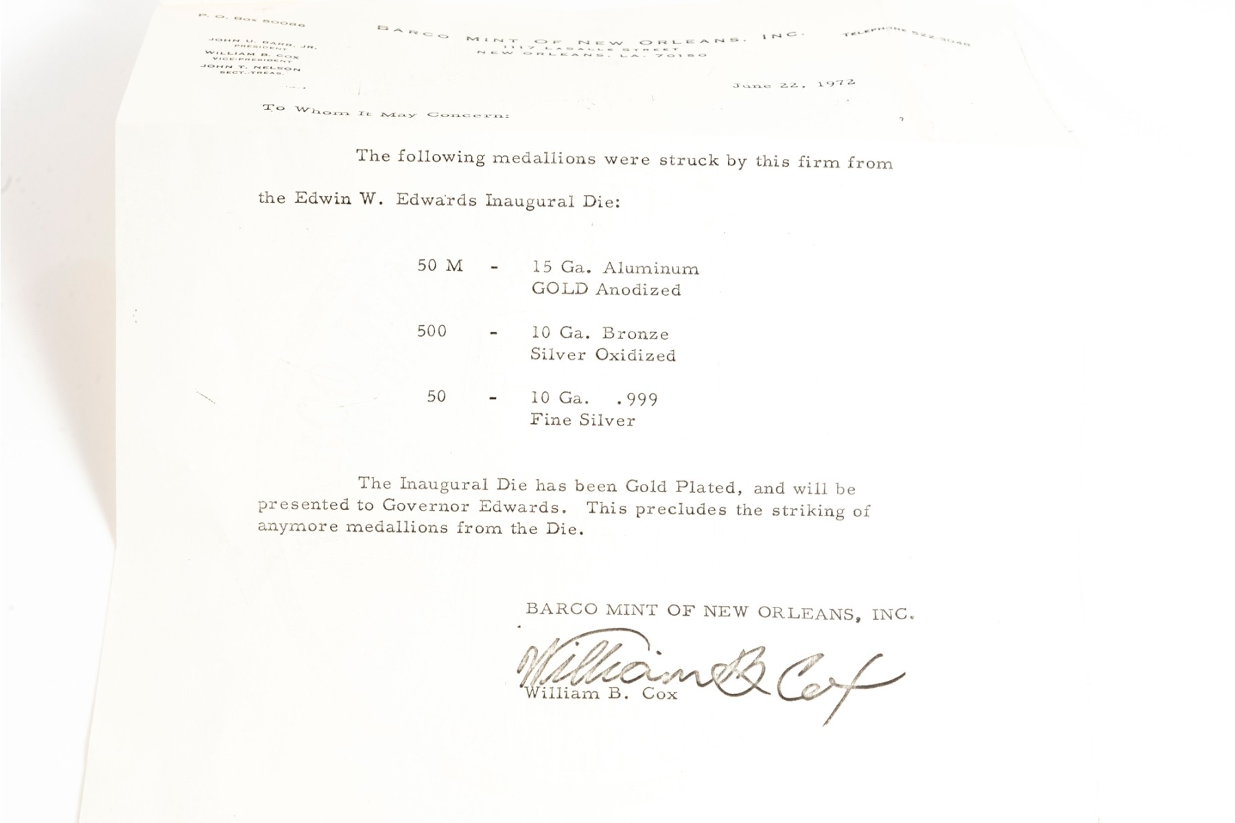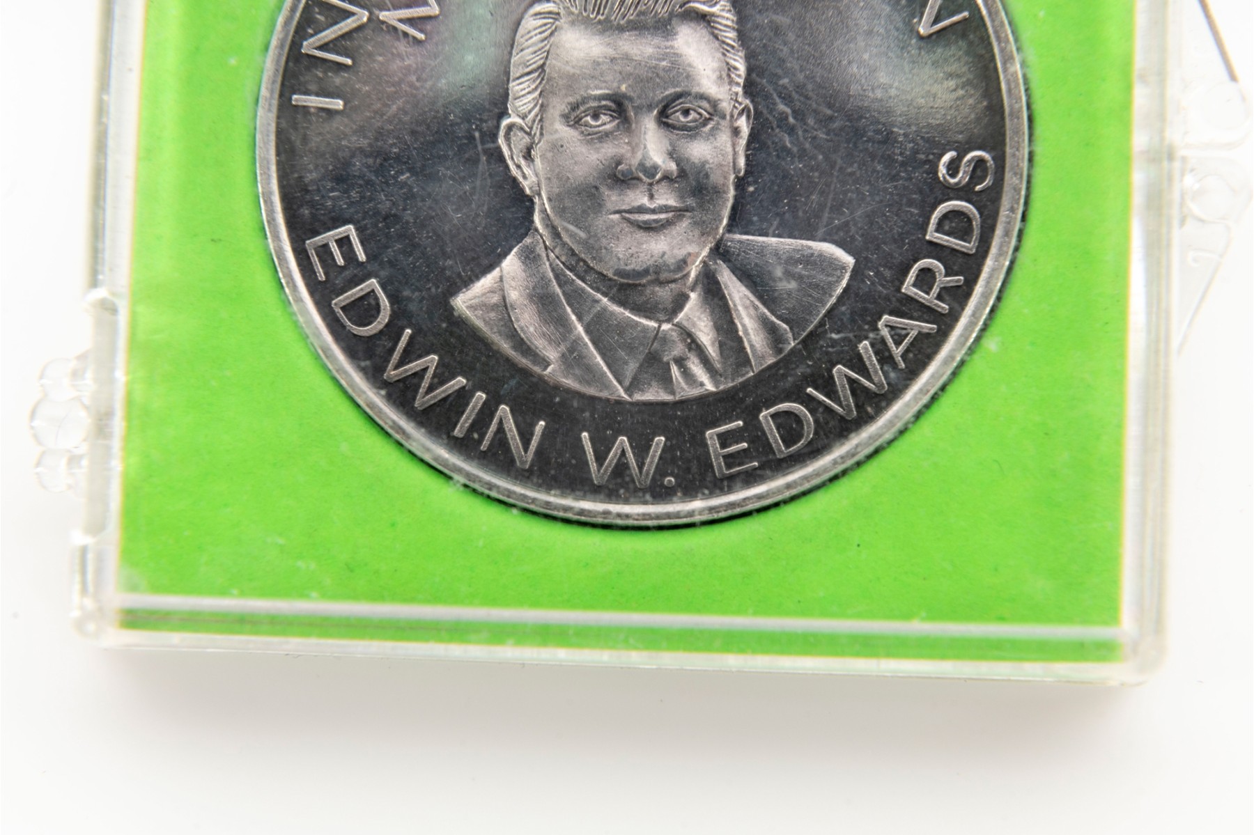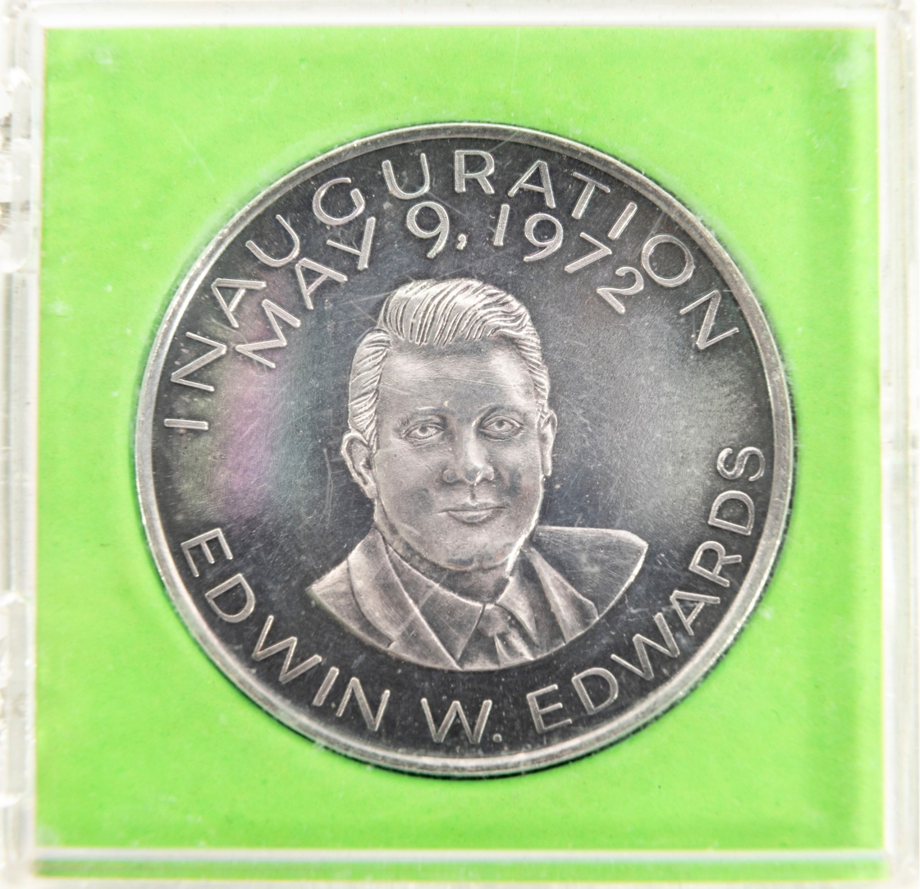 This Edwin Edwards' ten gauge .999 fine silver medallion is a rare and distinguished collectible, celebrating the inaugural tenure of Edwin Edwards as Louisiana’s governor. The Louisiana Barco Mint die for this medallion has been specially gold-plated and mounted, marking the end of its production, limited to just 50 pieces.