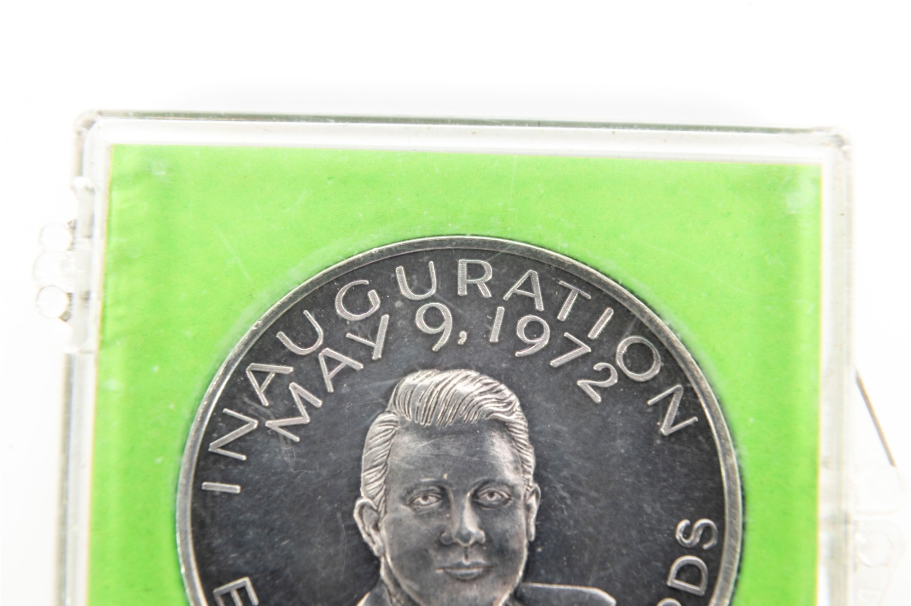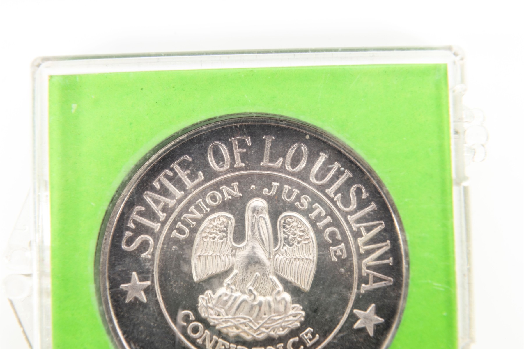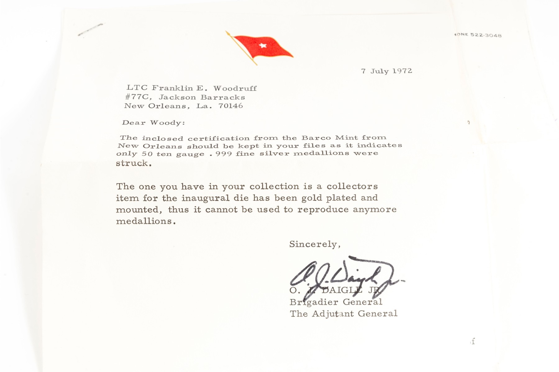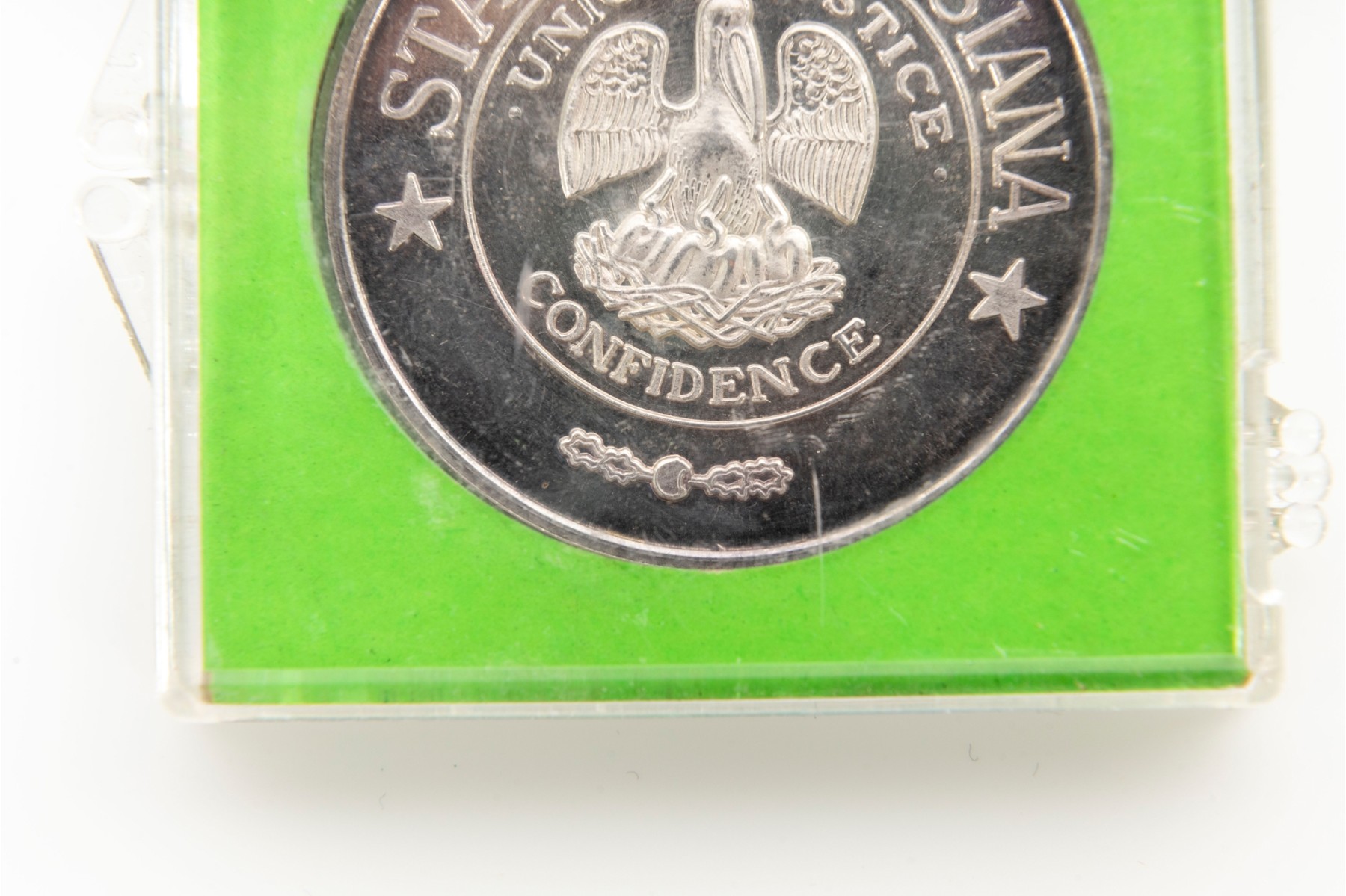 This Edwin Edwards' ten gauge .999 fine silver medallion is a rare and distinguished collectible, celebrating the inaugural tenure of Edwin Edwards as Louisiana’s governor. The Louisiana Barco Mint die for this medallion has been specially gold-plated and mounted, marking the end of its production, limited to just 50 pieces.