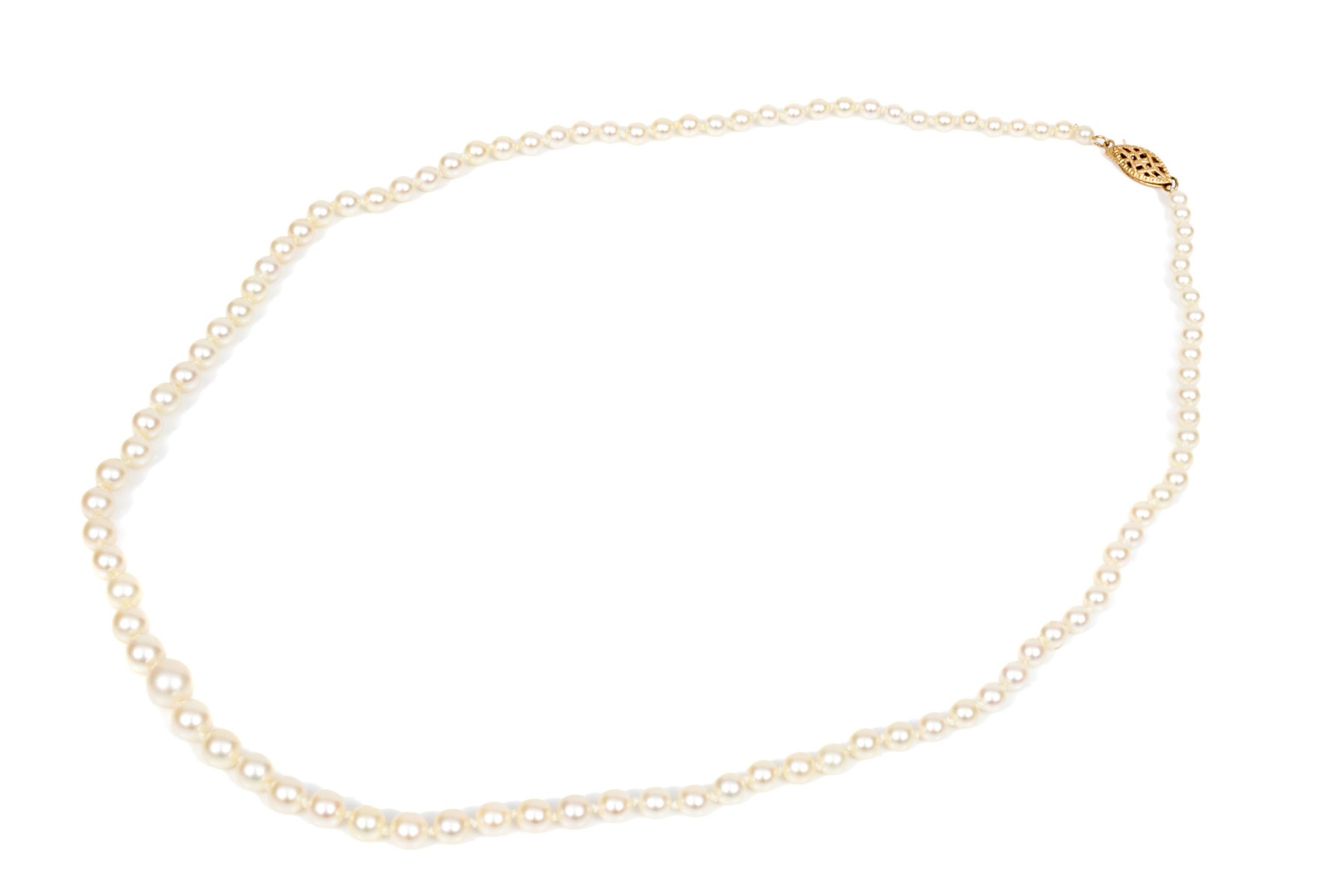 Lovely graduated 3.5mm to 6mm cultured pearl necklace, with a 14k yellow gold fishhook style clasp
