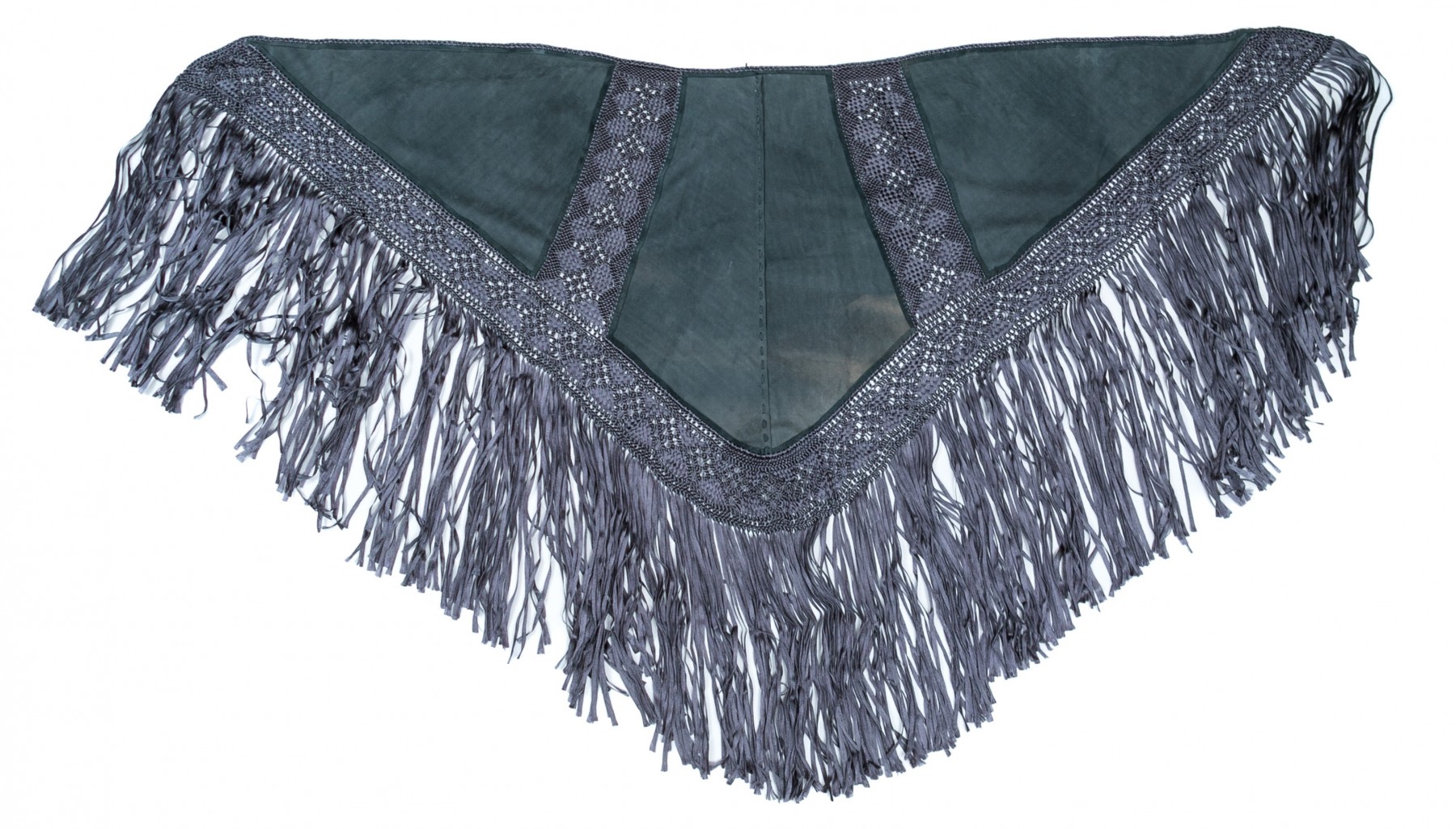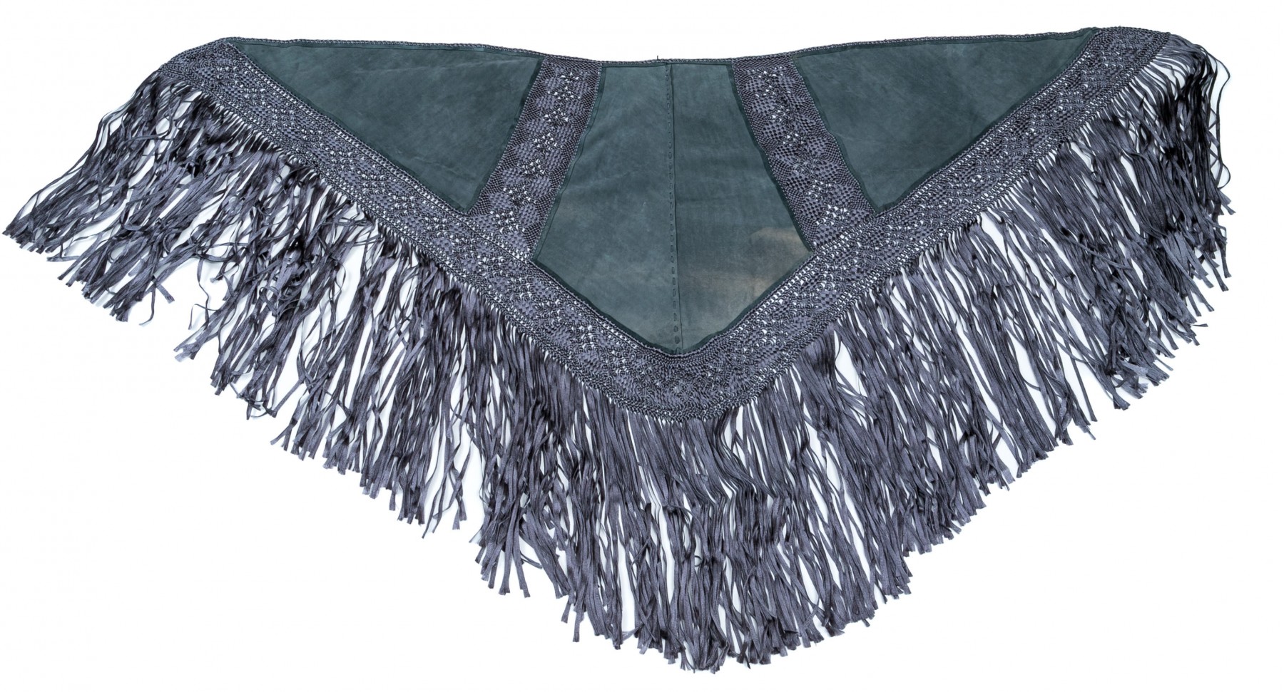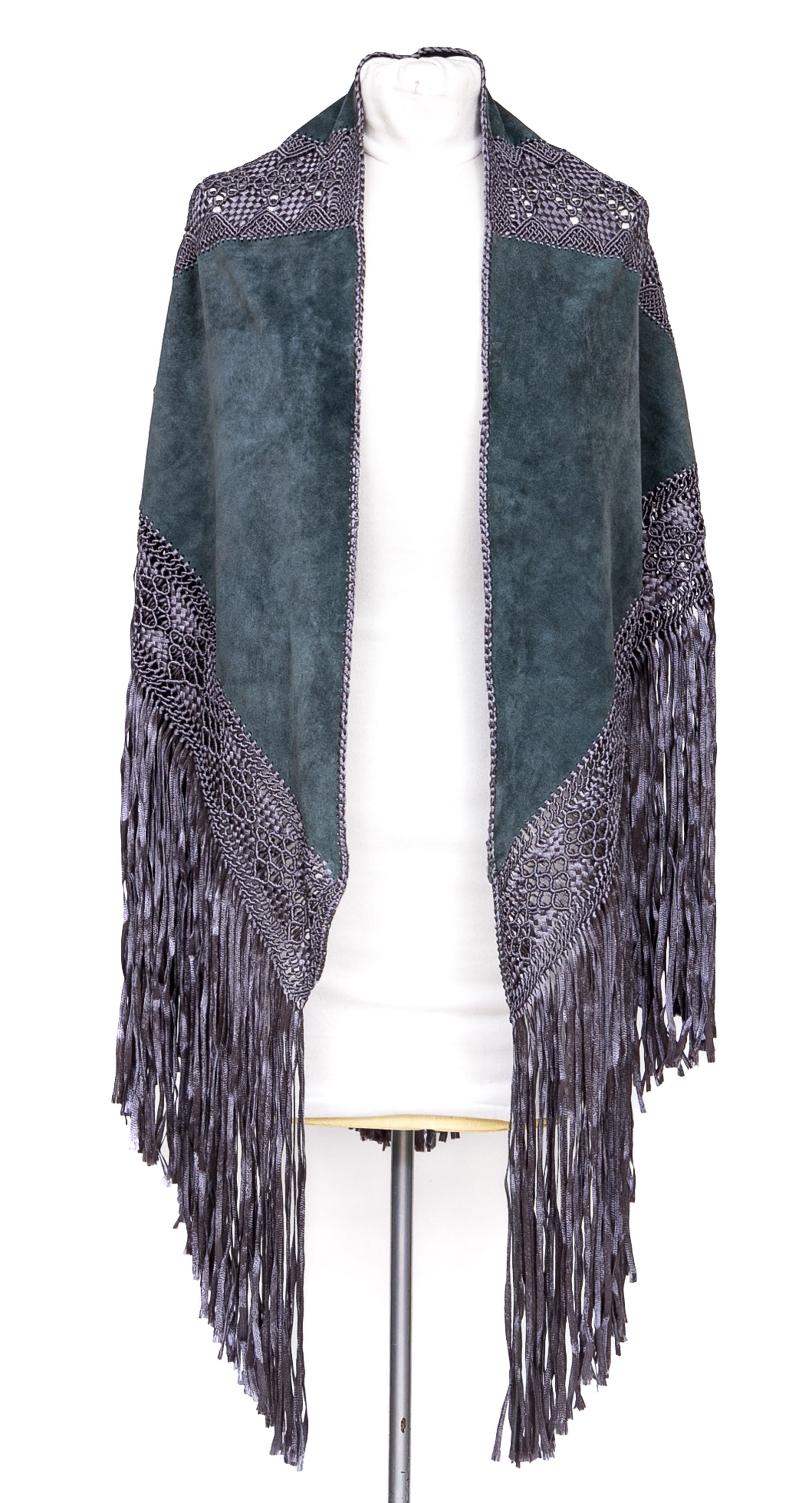 Lovely grey suede and woven large triangular shawl, fringed, OSFA