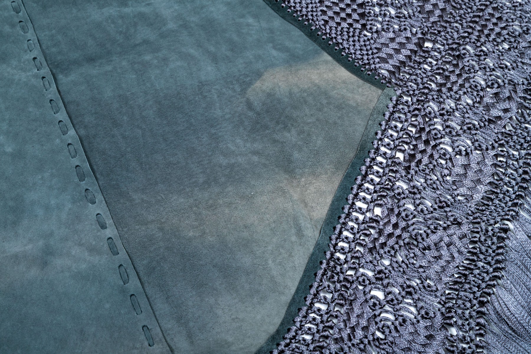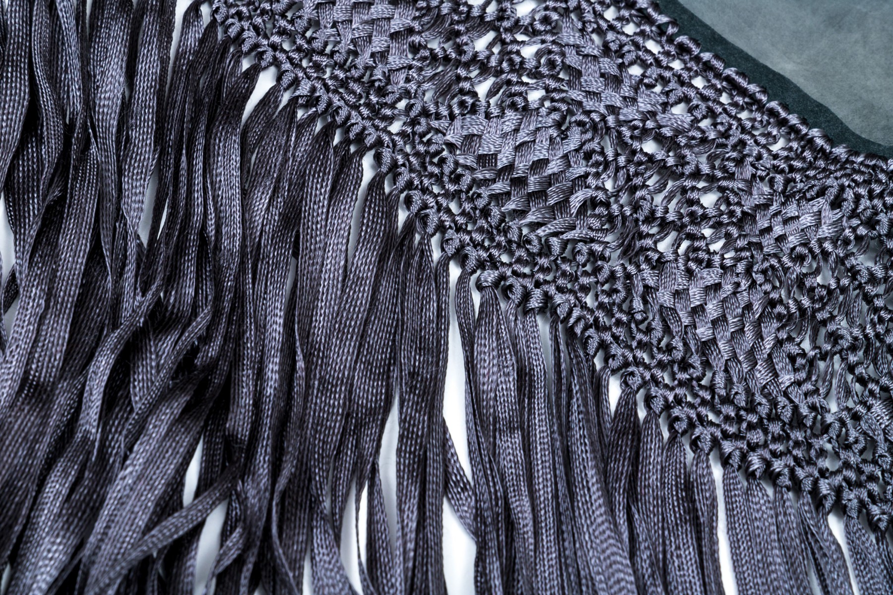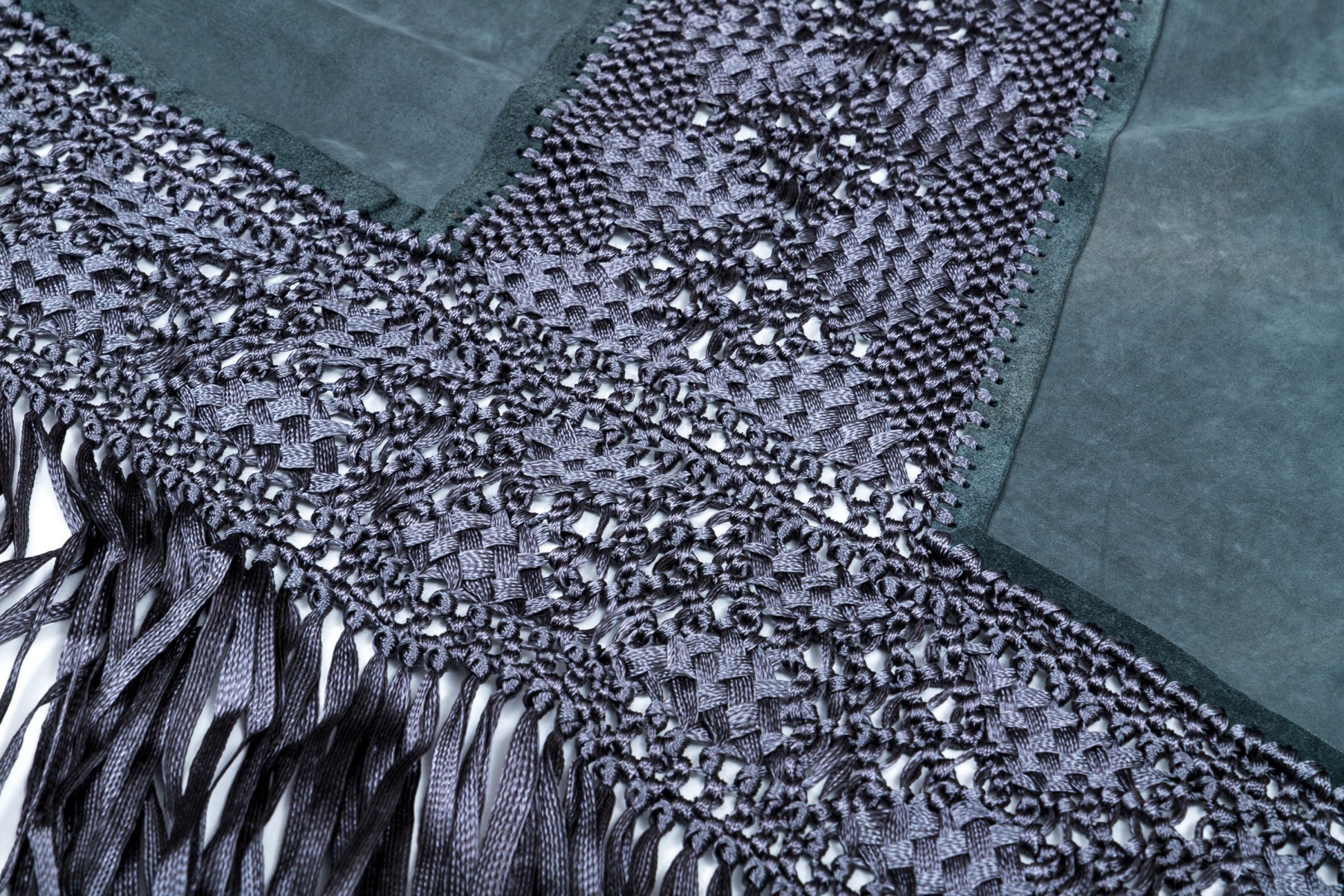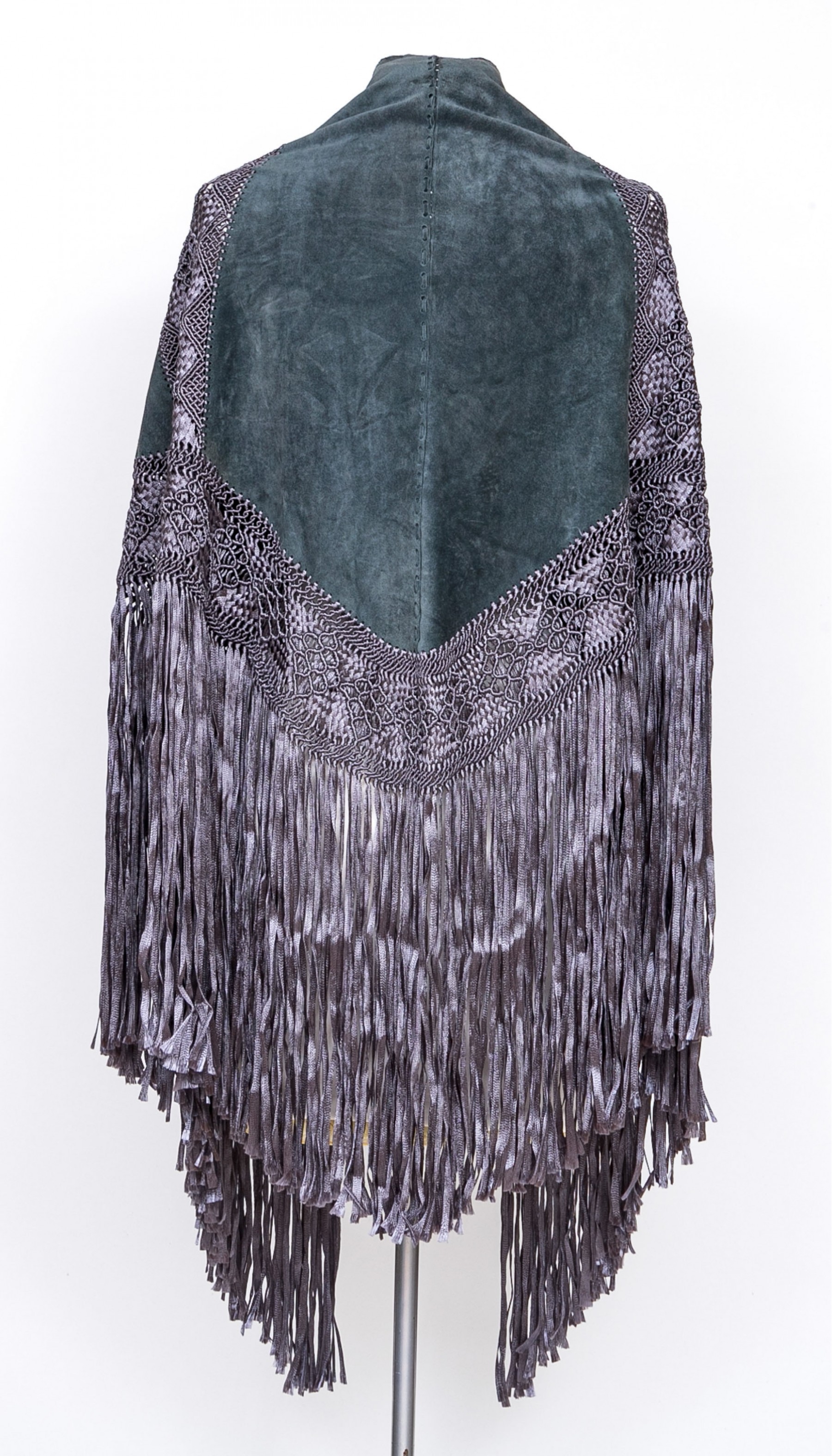 Lovely grey suede and woven large triangular shawl, fringed, OSFA