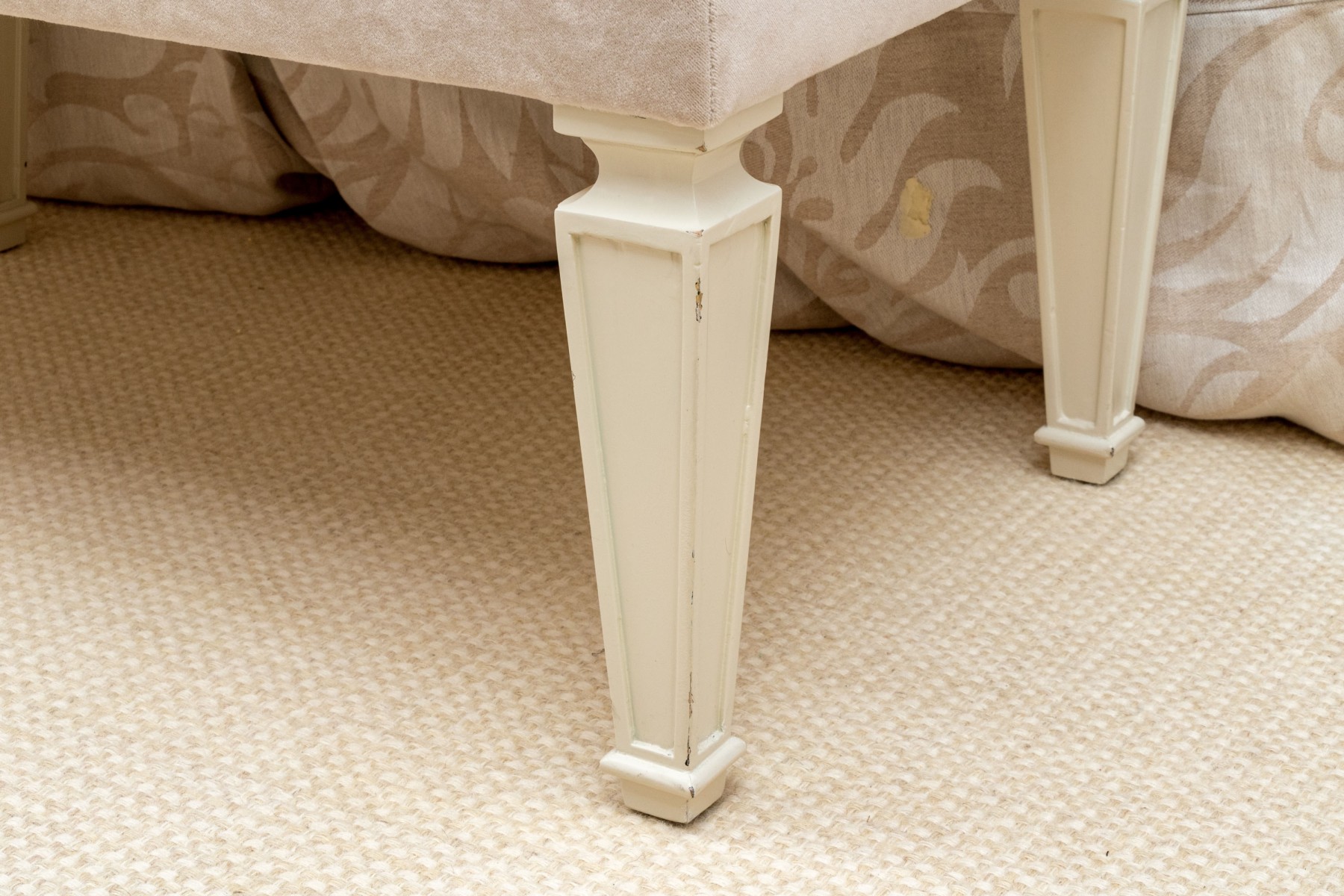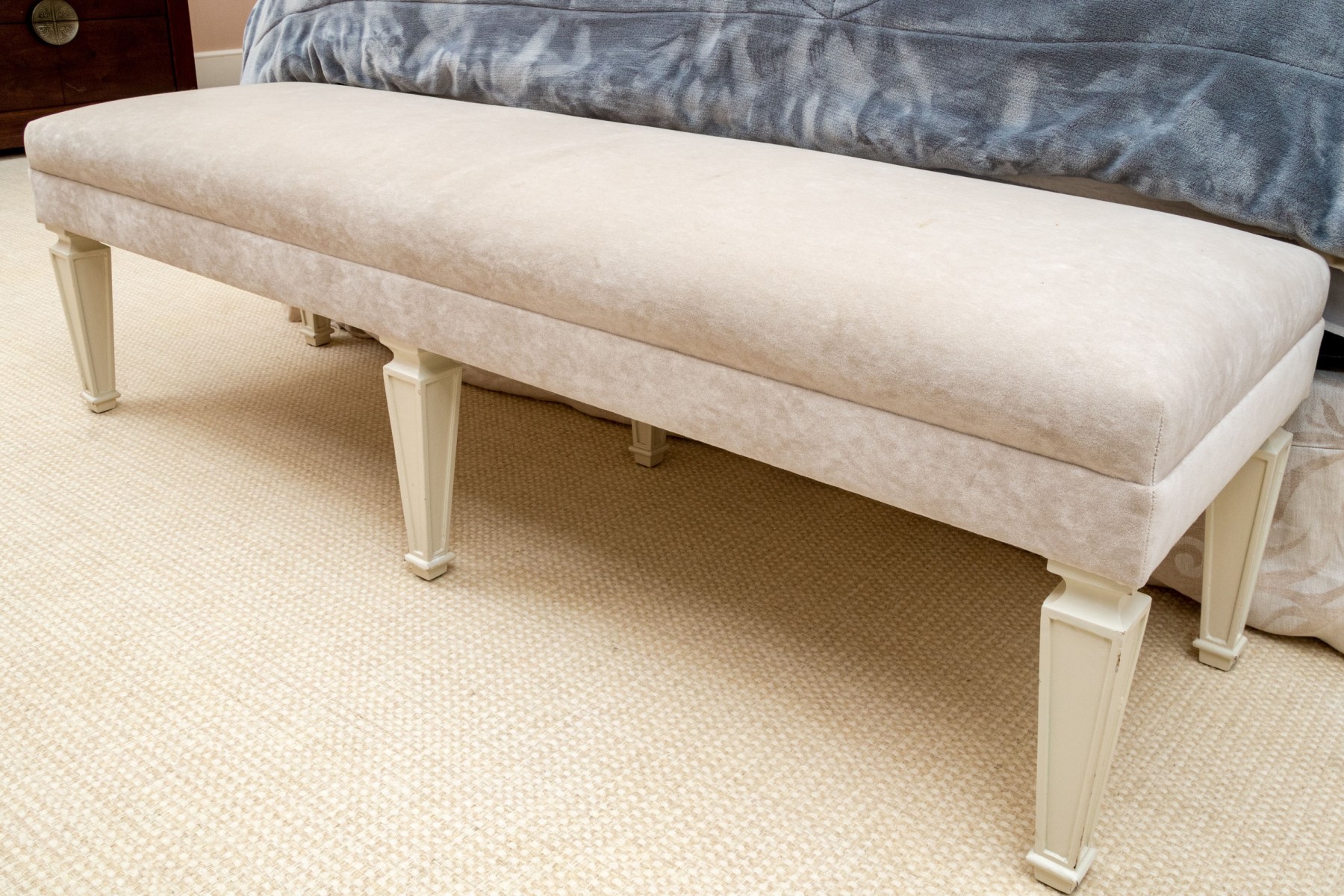 A lovely transitional style bench upholstered in versatile, neutral cream-beige velvet with a straight upholstered apron raised over cream painted tapered legs with a gorgeous, sophisticated design featuring flared and beveled tops over paneled columnar posts.
