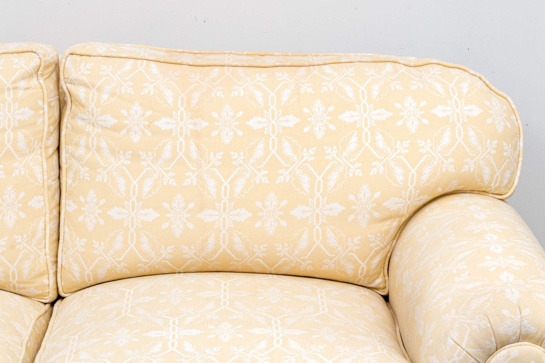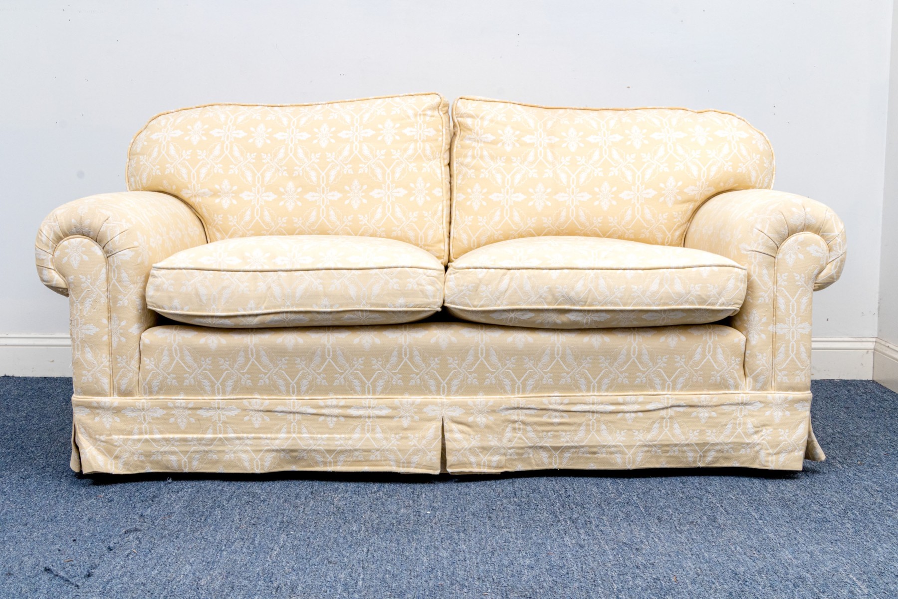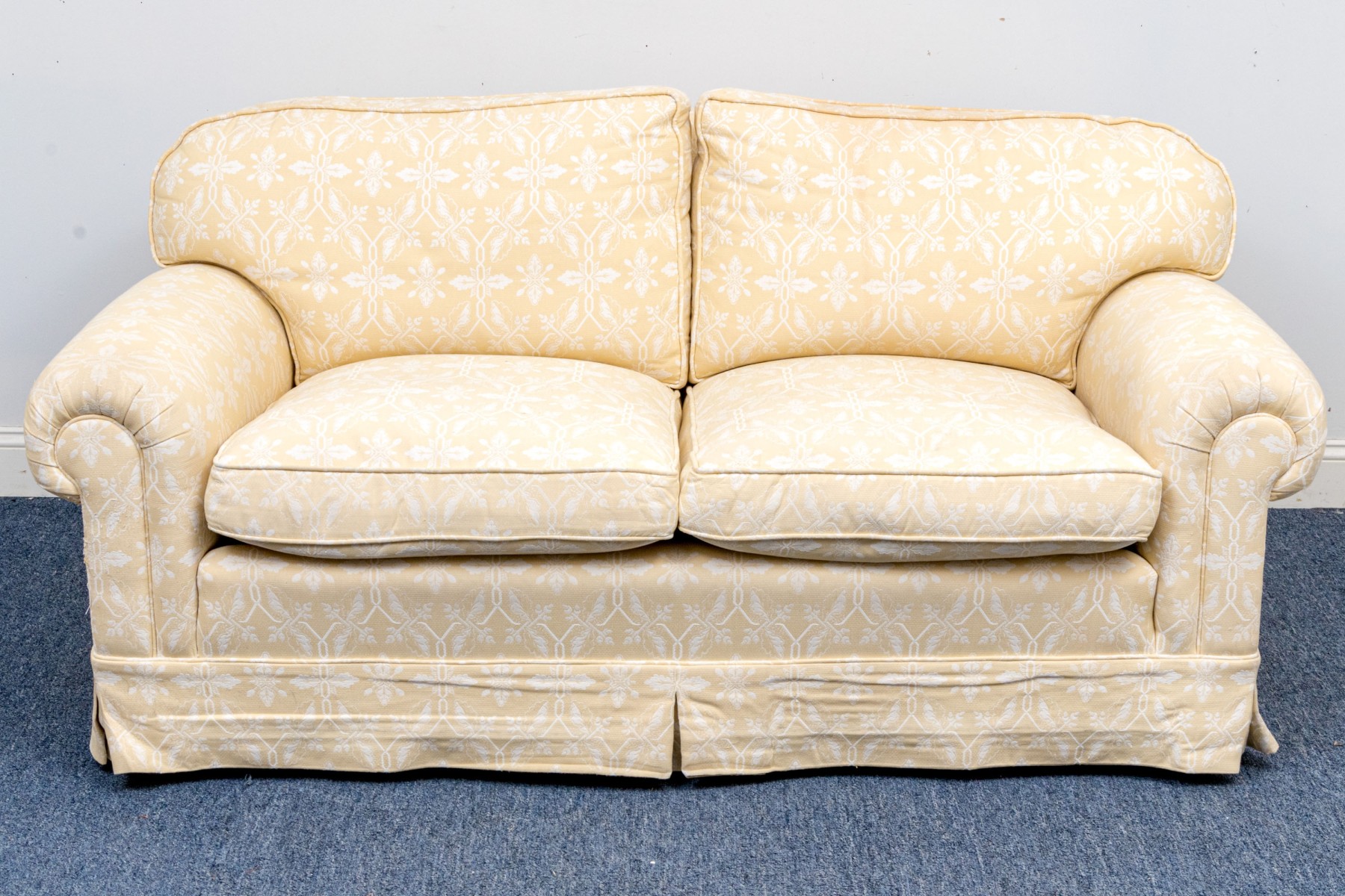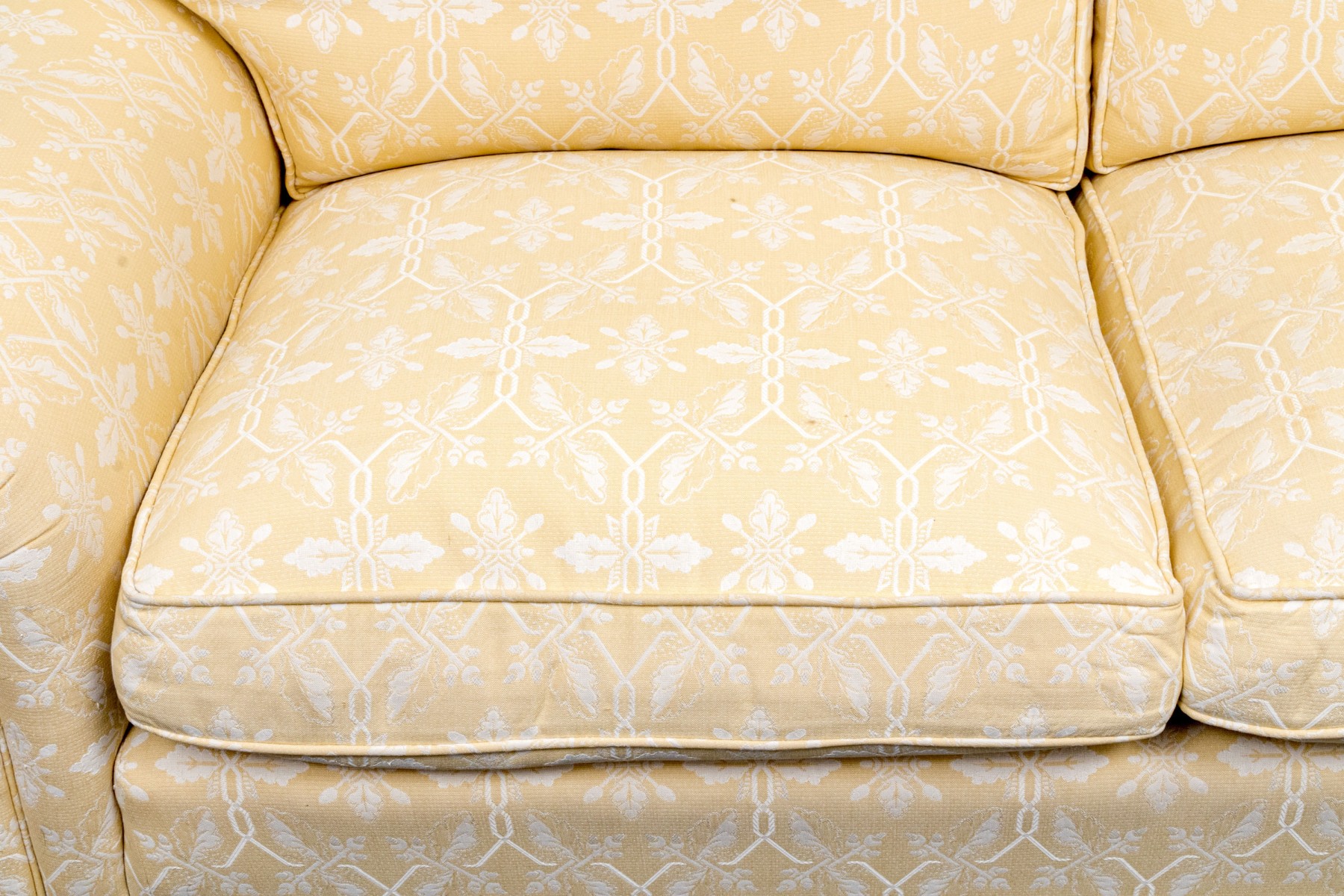 White decoration on yellow ground. With rolled arms and a skirt to conceal the underneath. Two upholstered seat cushions and seat back cushions.