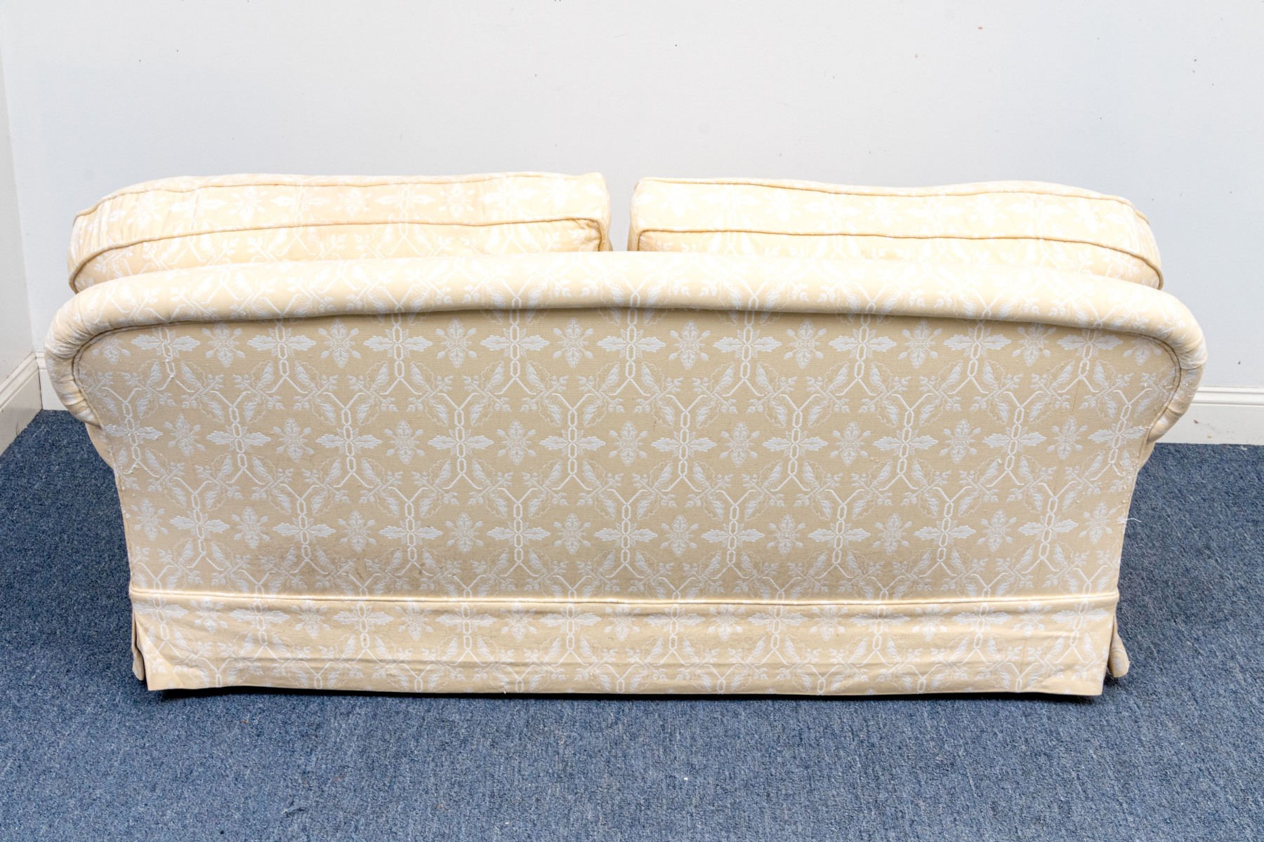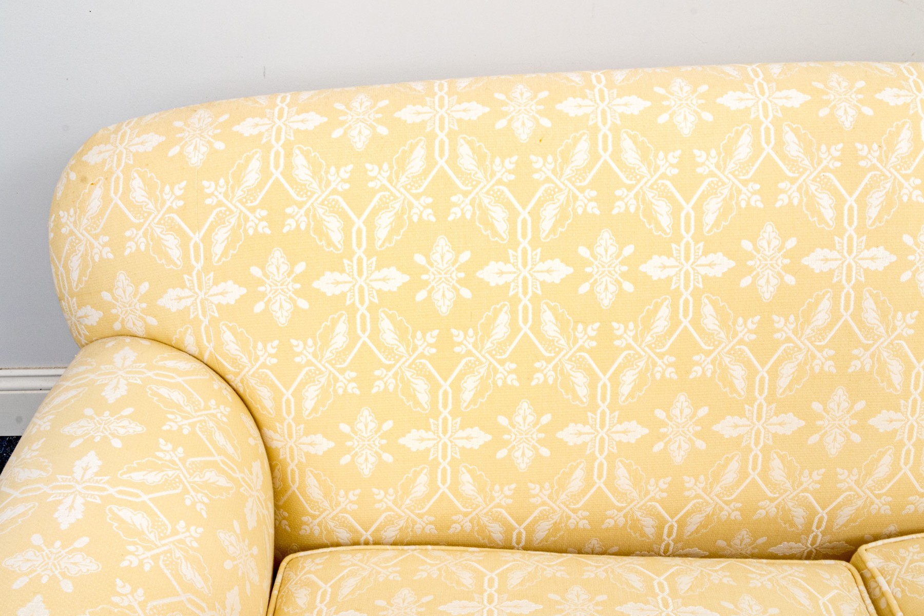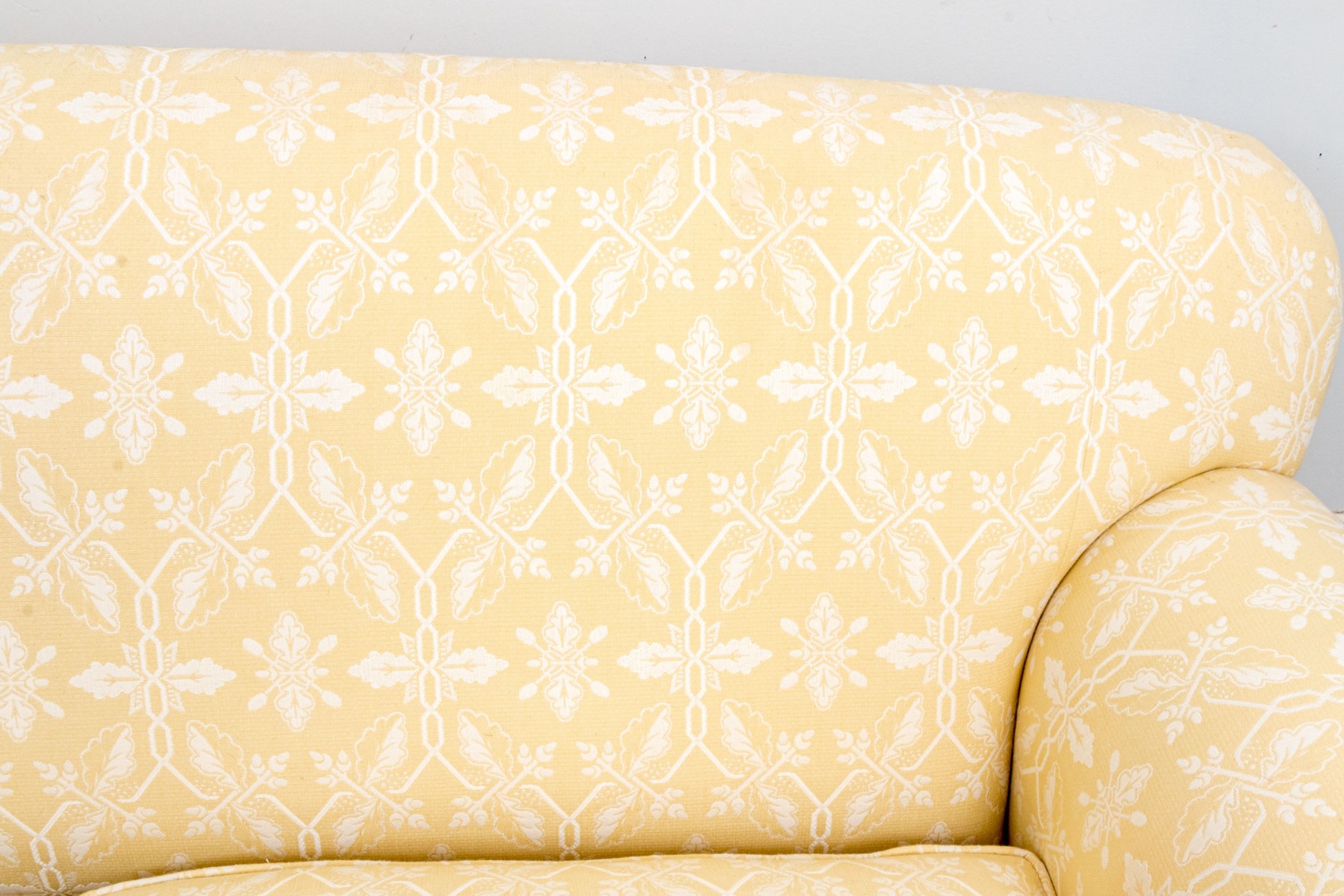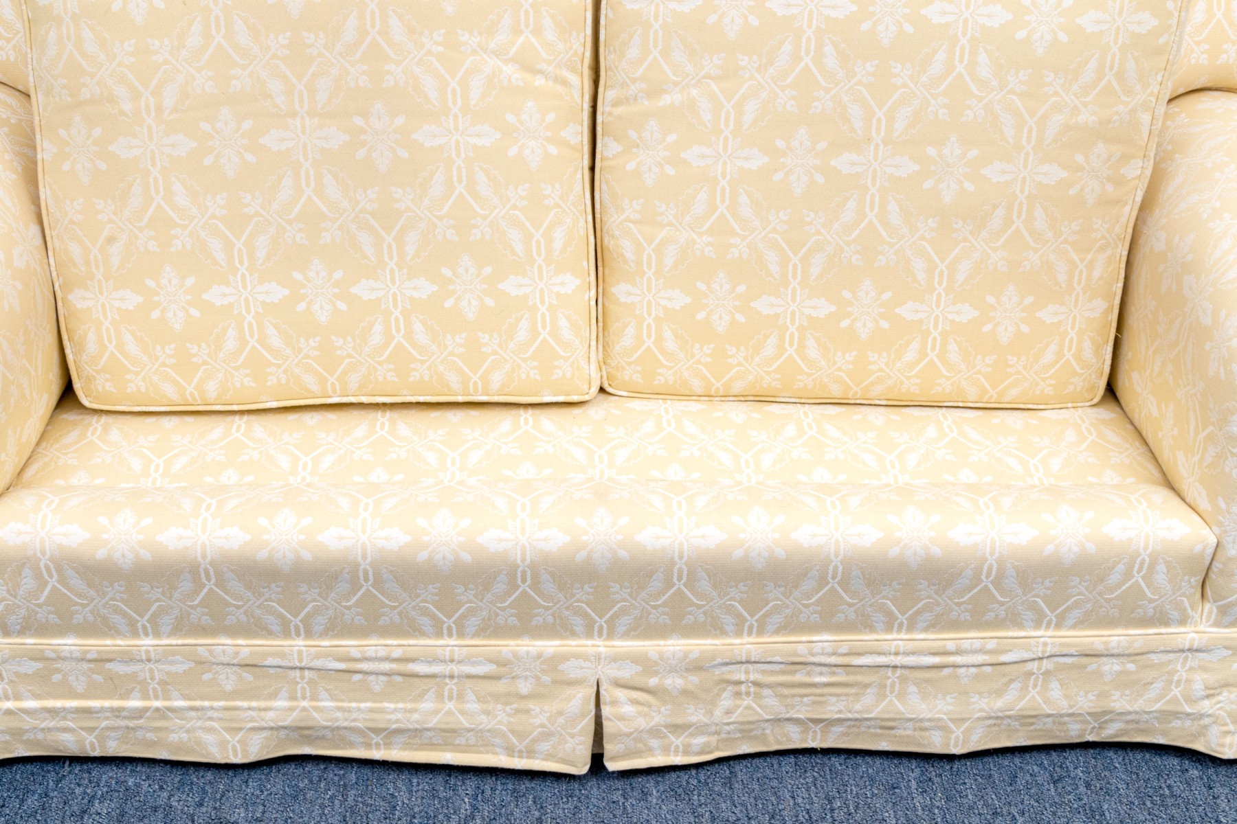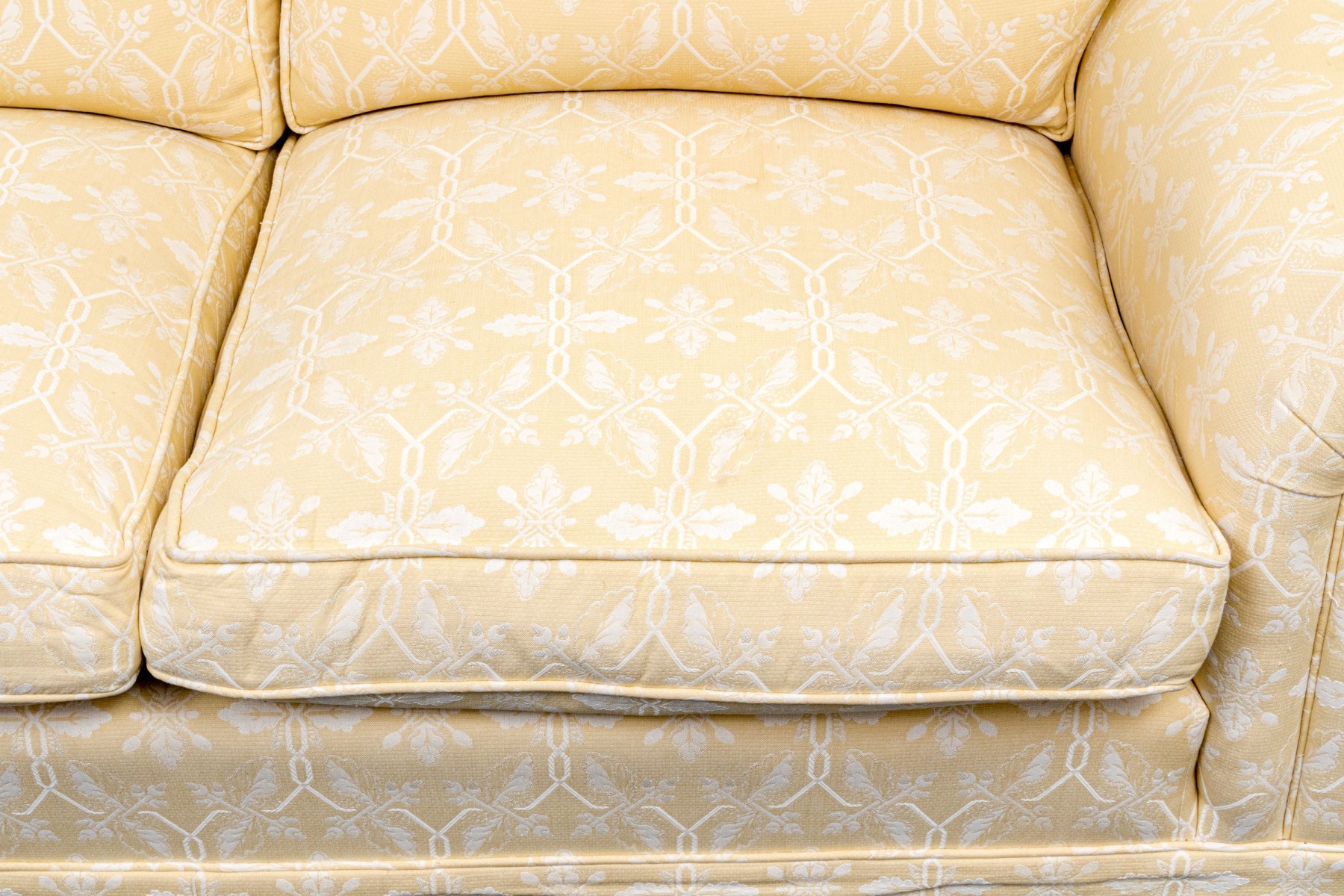 White decoration on yellow ground. With rolled arms and a skirt to conceal the underneath. Two upholstered seat cushions and seat back cushions.