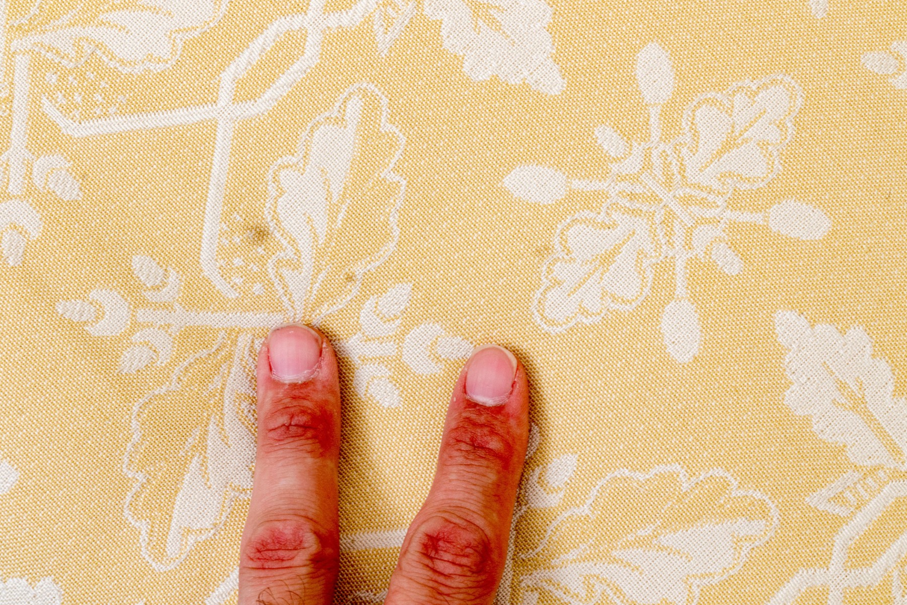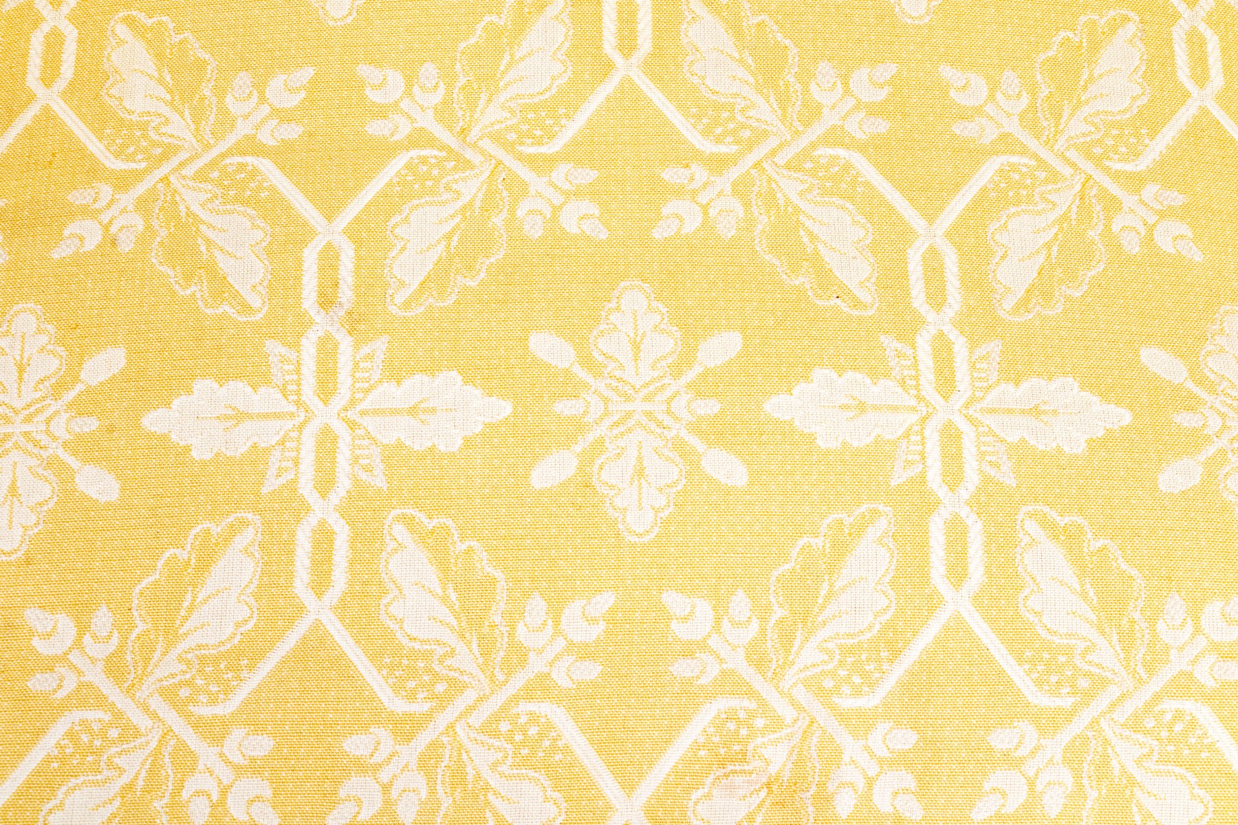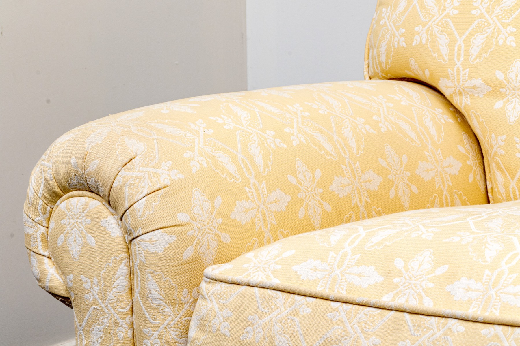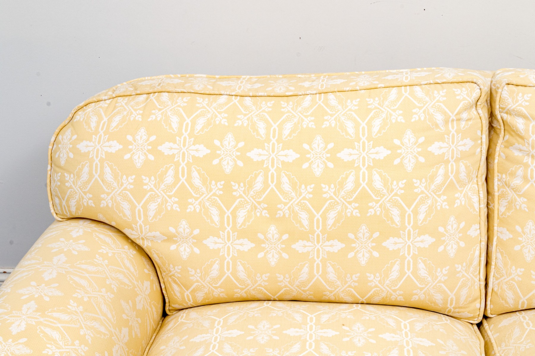 White decoration on yellow ground. With rolled arms and a skirt to conceal the underneath. Two upholstered seat cushions and seat back cushions.