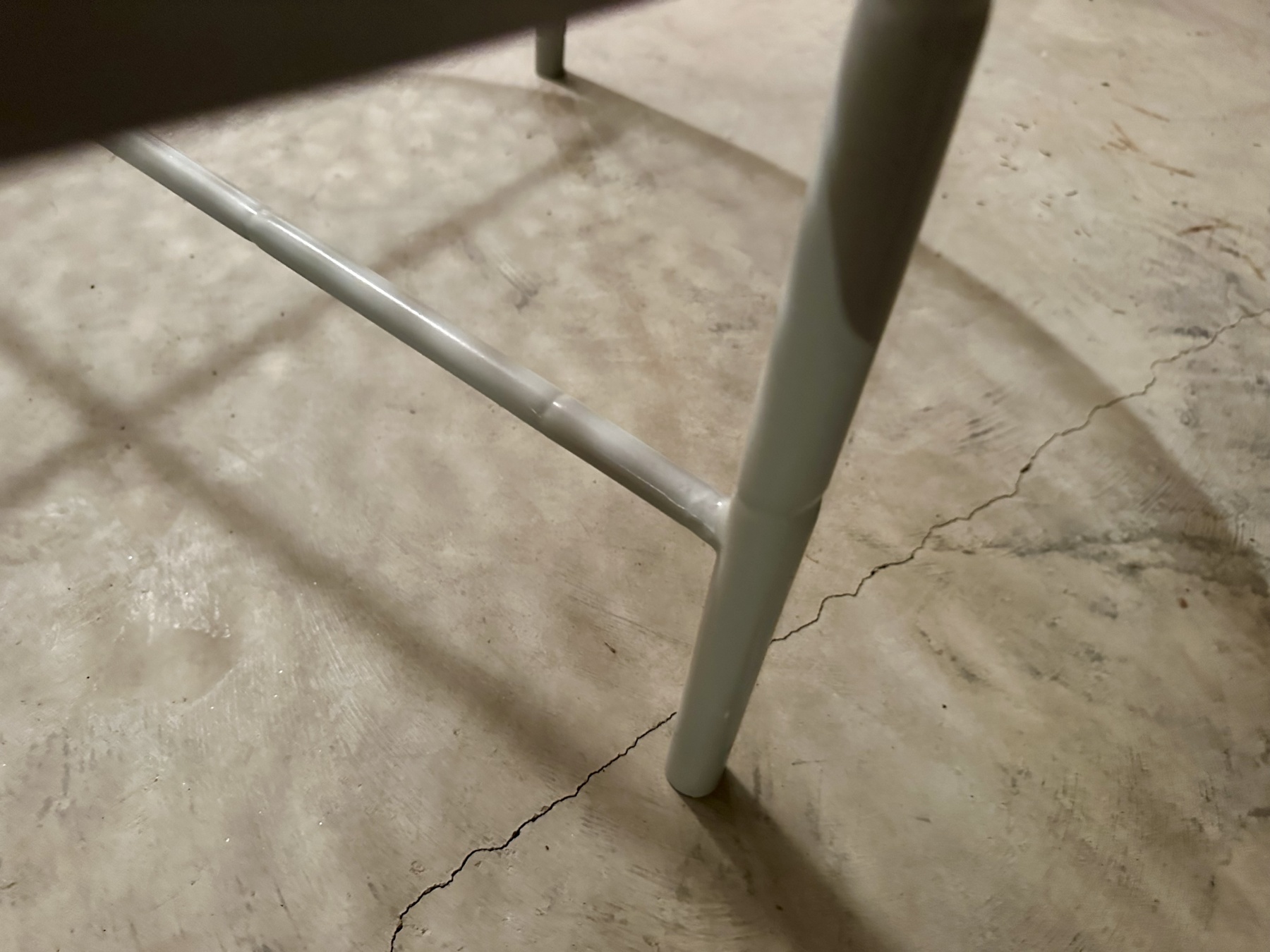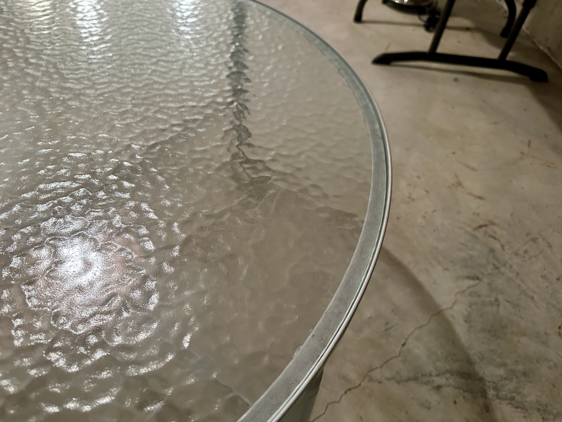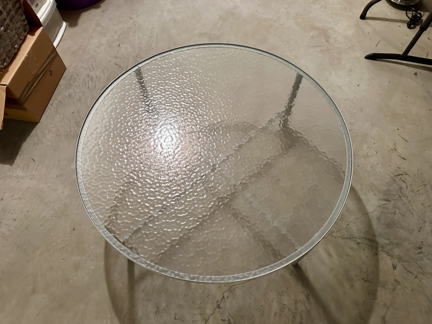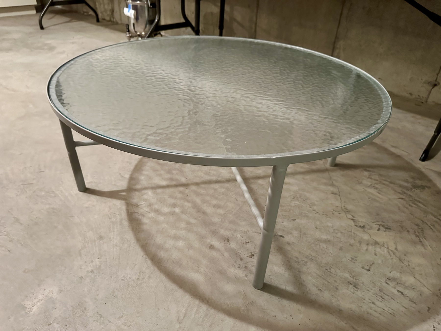 A stylish low coffee table suitable for indoor and outdoor use, designed with a circular rippled glass top on a gray-white finished frame with cylindrical legs and an X-stretcher for support.