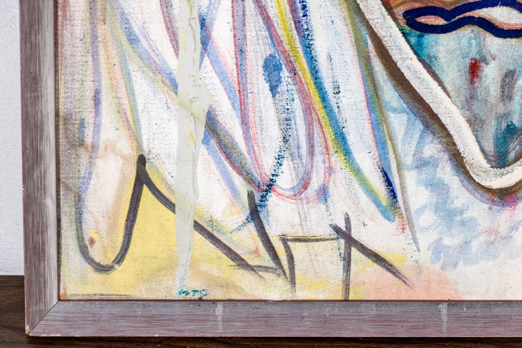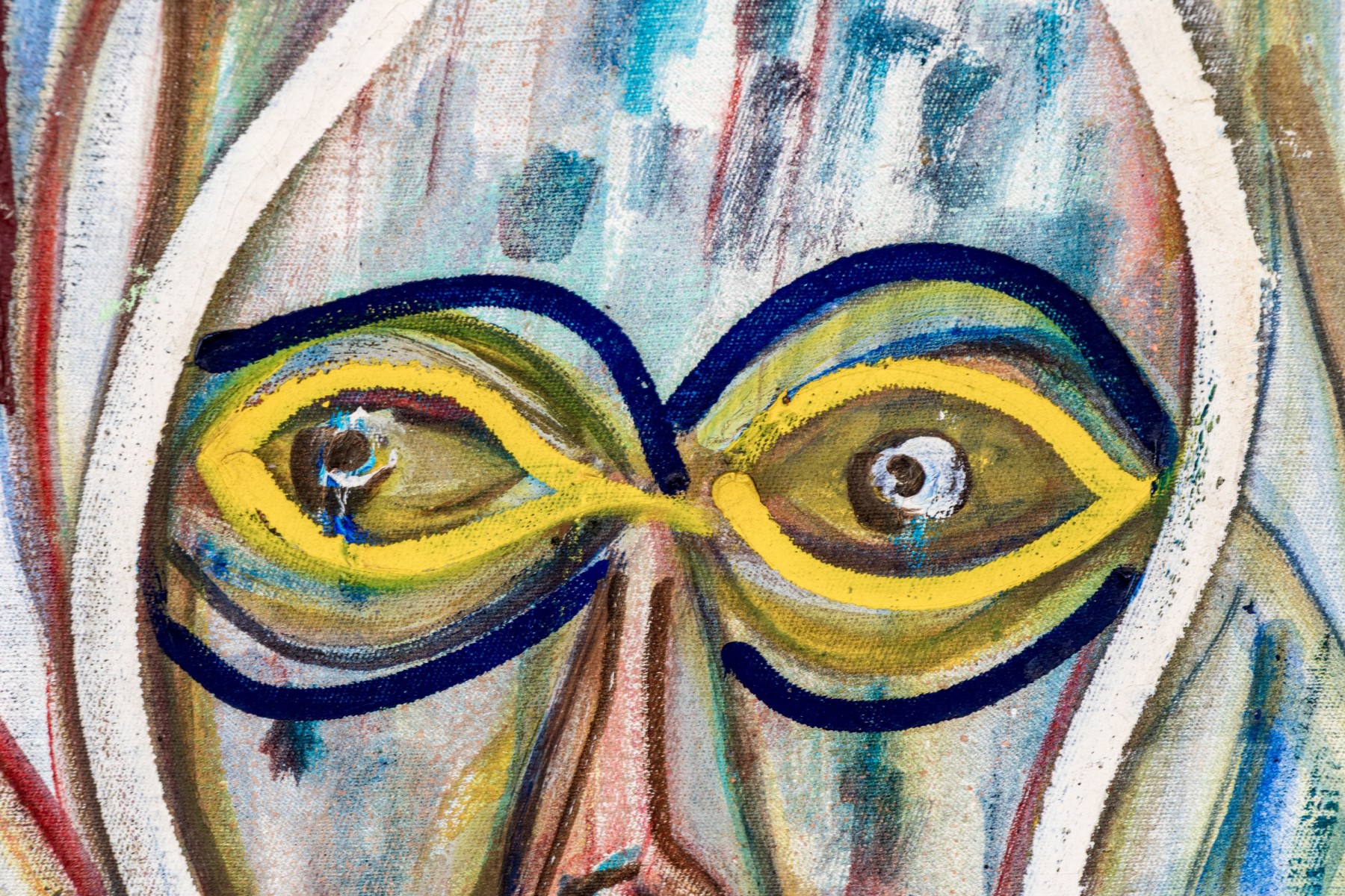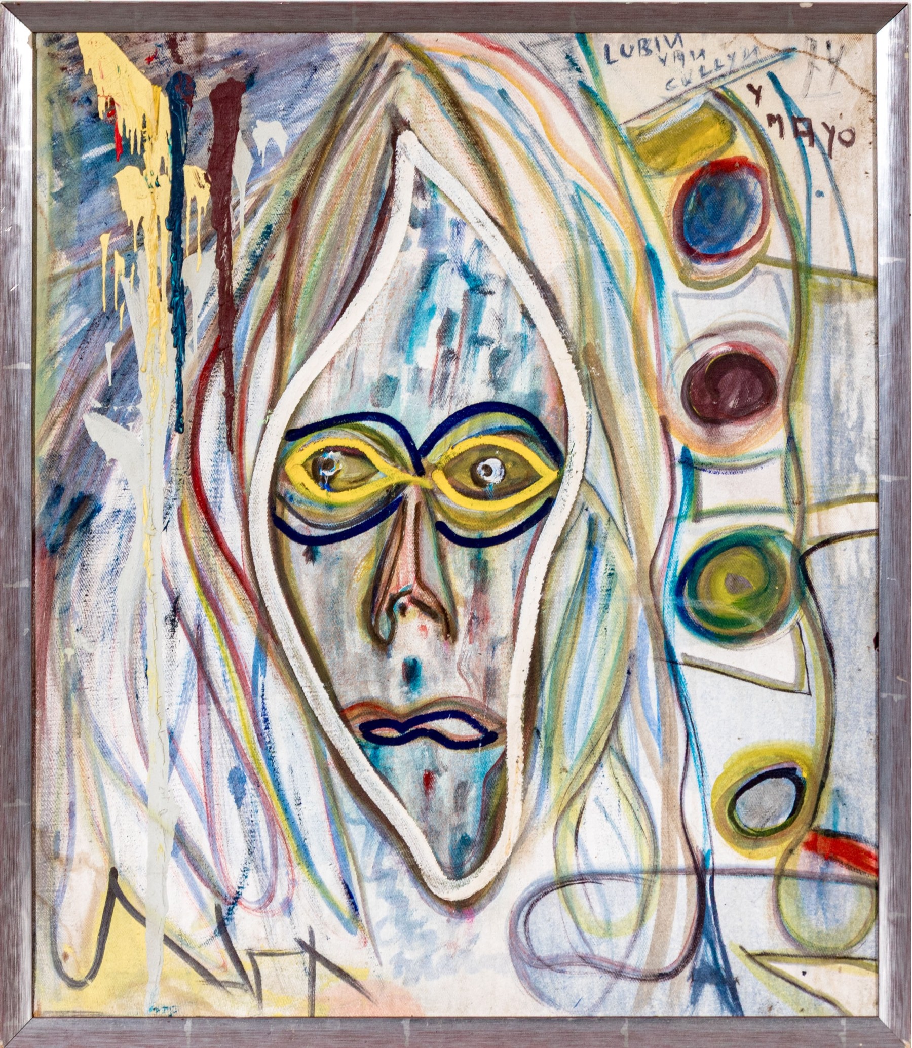 An expressionist image of a oblong face with vibrant polychromatic strands of hair and yellow eyes with blue lips. Signed upper right and on verso with title.