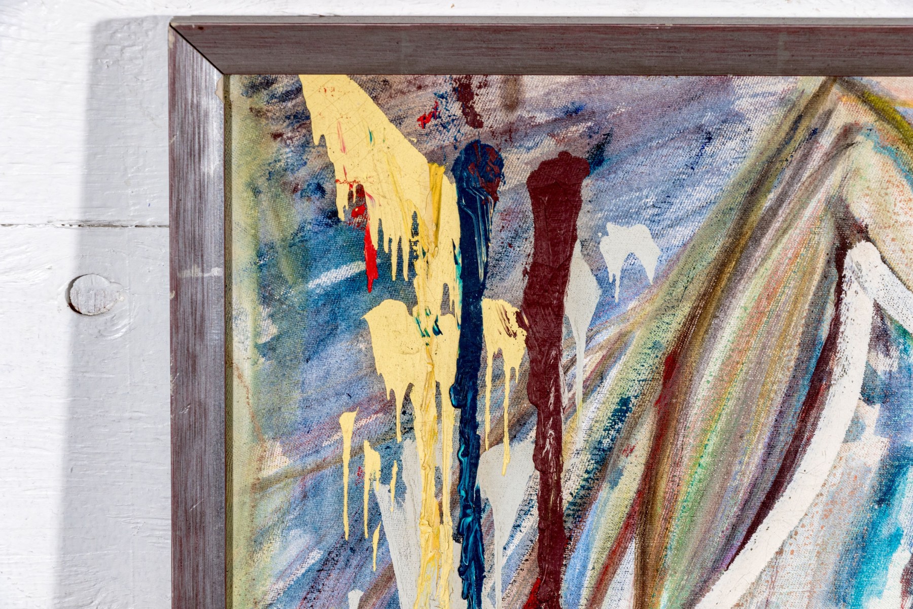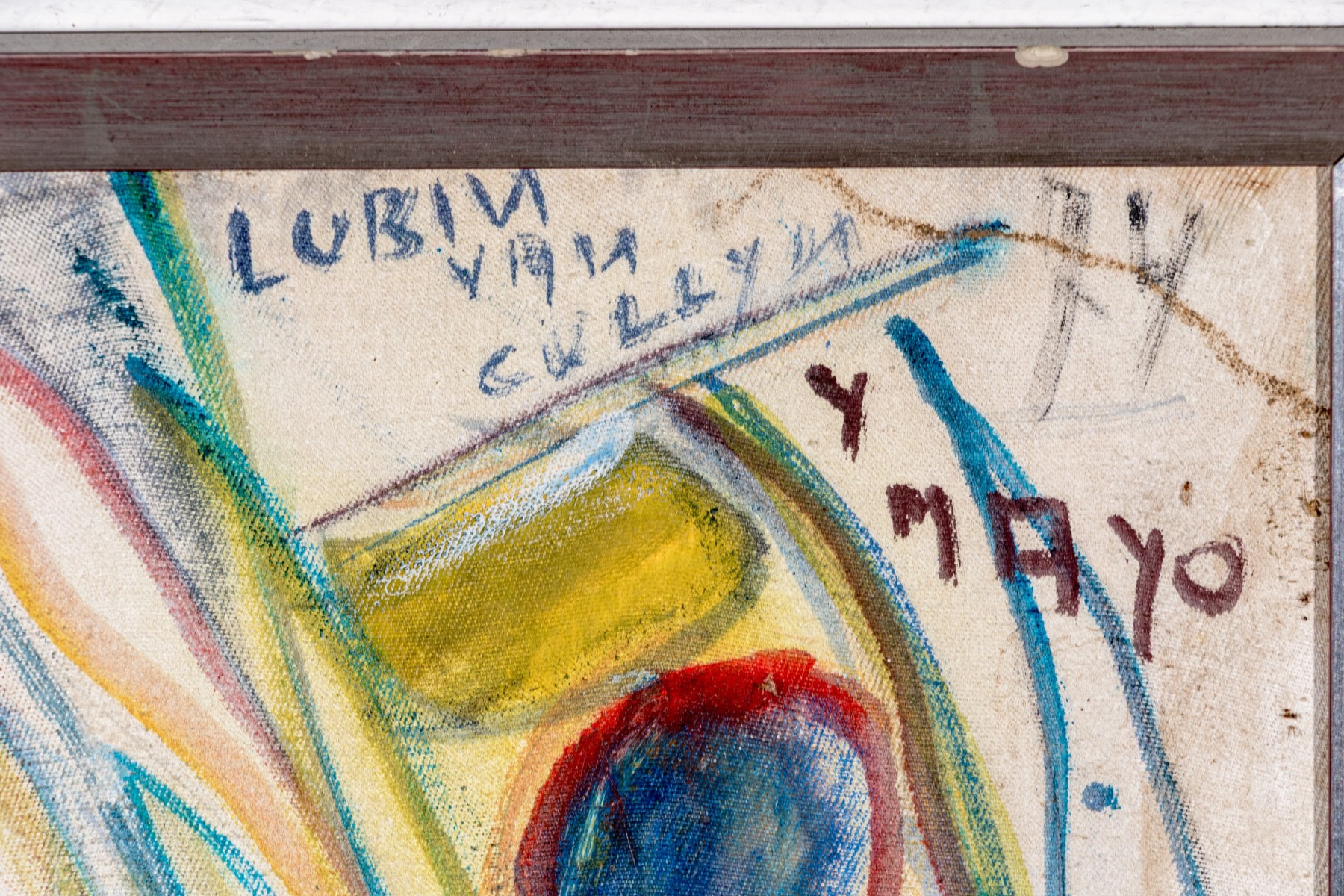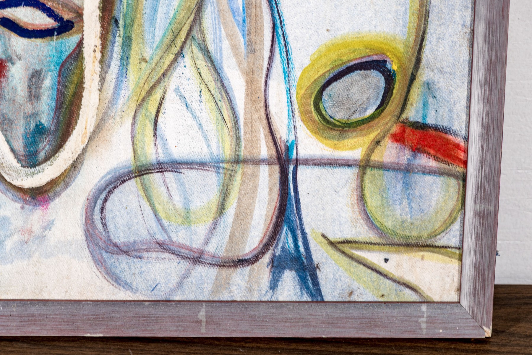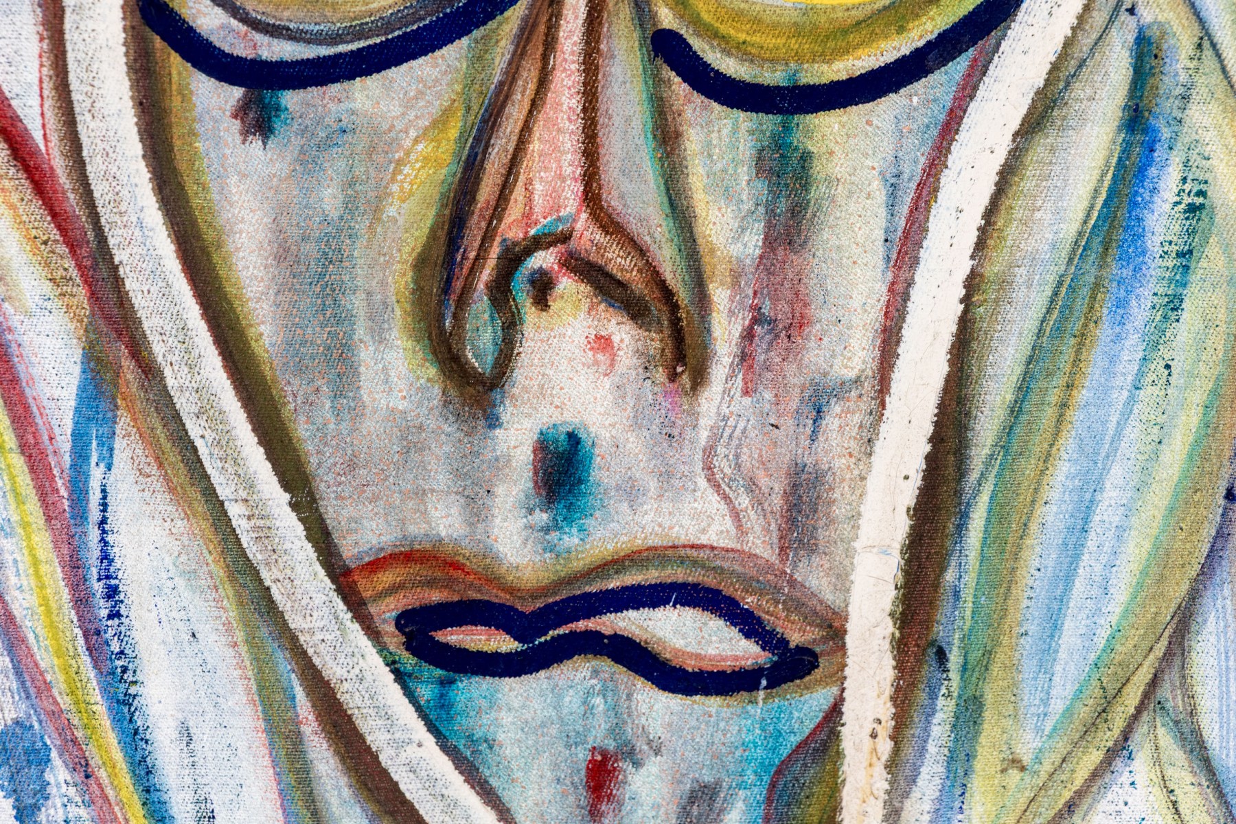 An expressionist image of a oblong face with vibrant polychromatic strands of hair and yellow eyes with blue lips. Signed upper right and on verso with title.