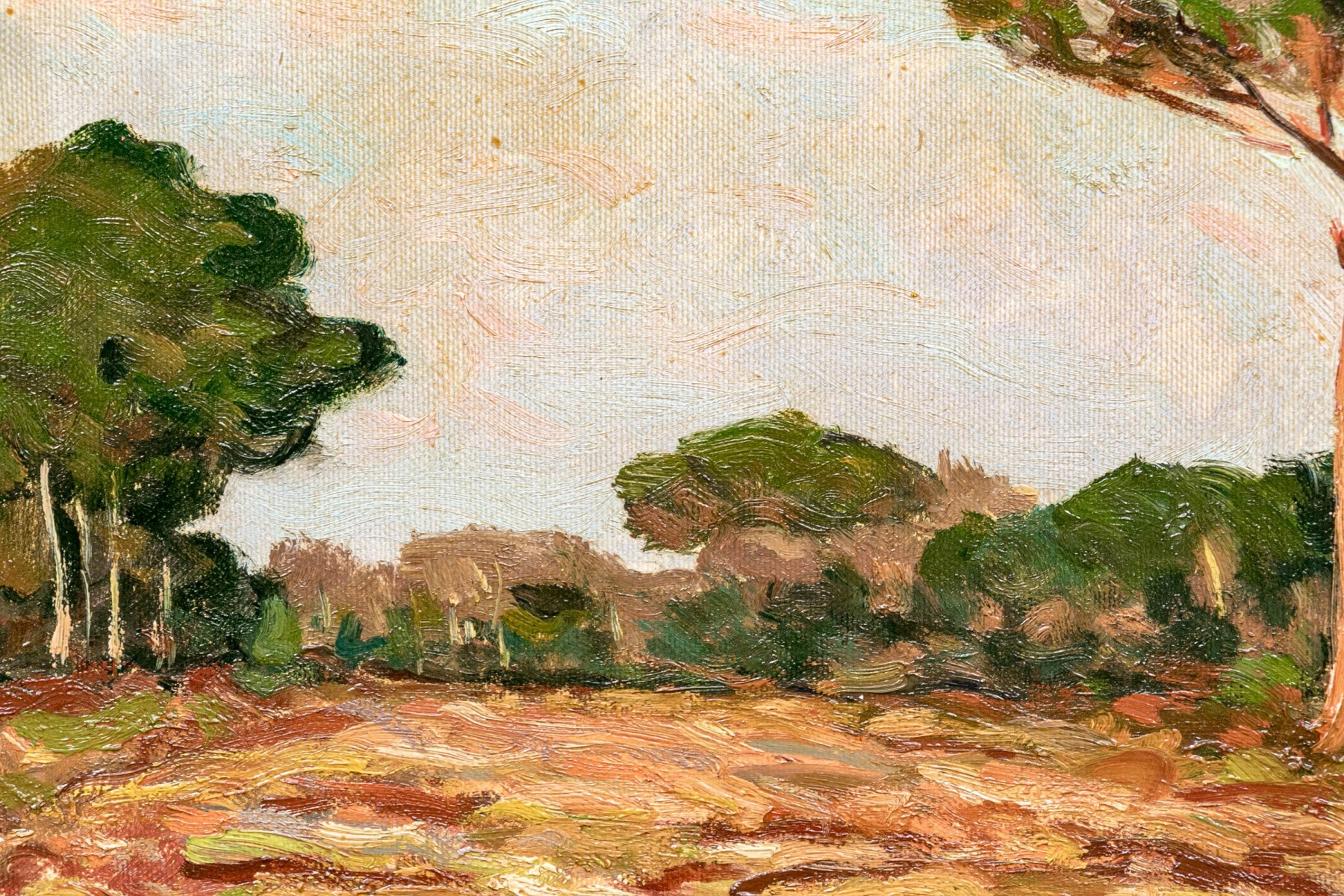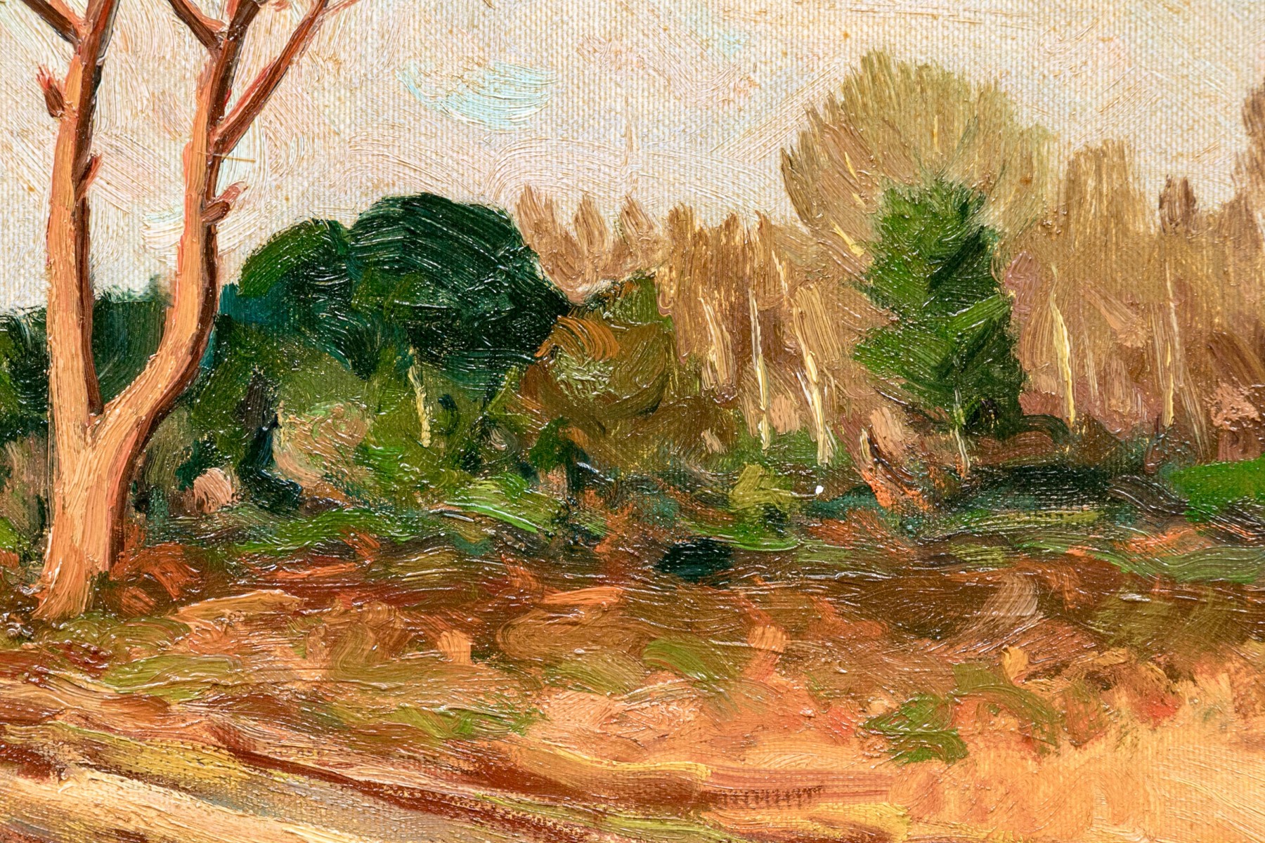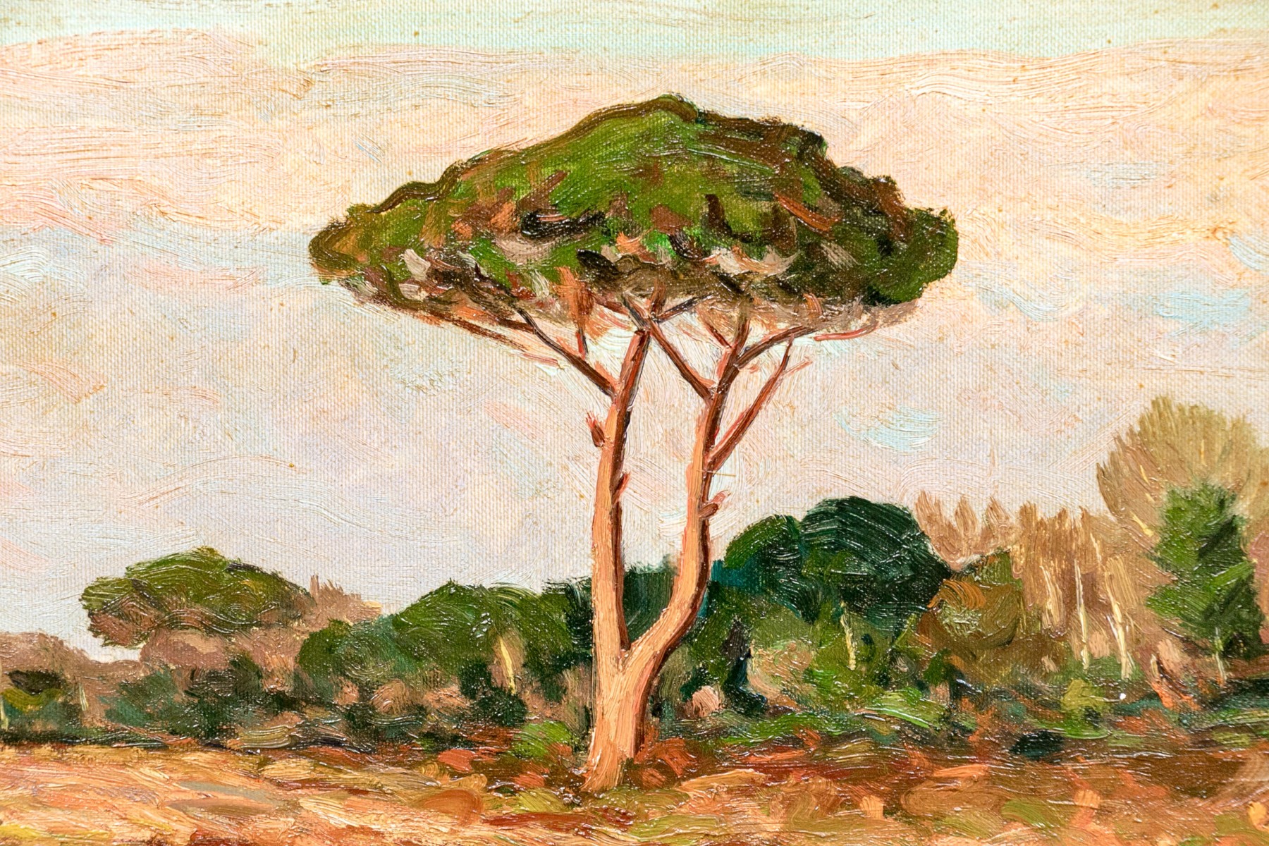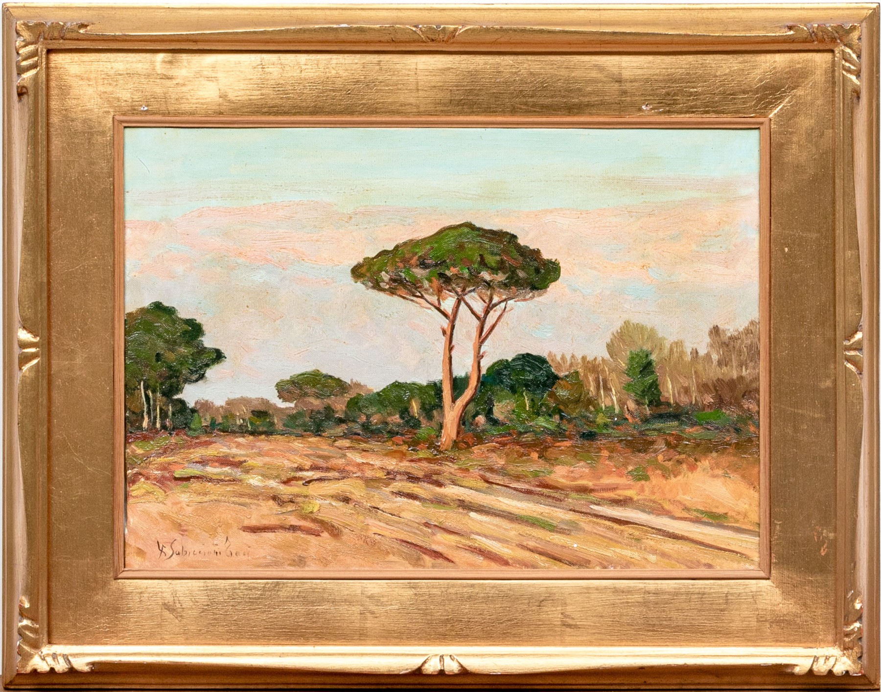 Signed lower left and on verso. A textured Italian landscape featuring a lone tree along a road and a forest in back under a pink tinged sky. Presented in a fine gilt frame.