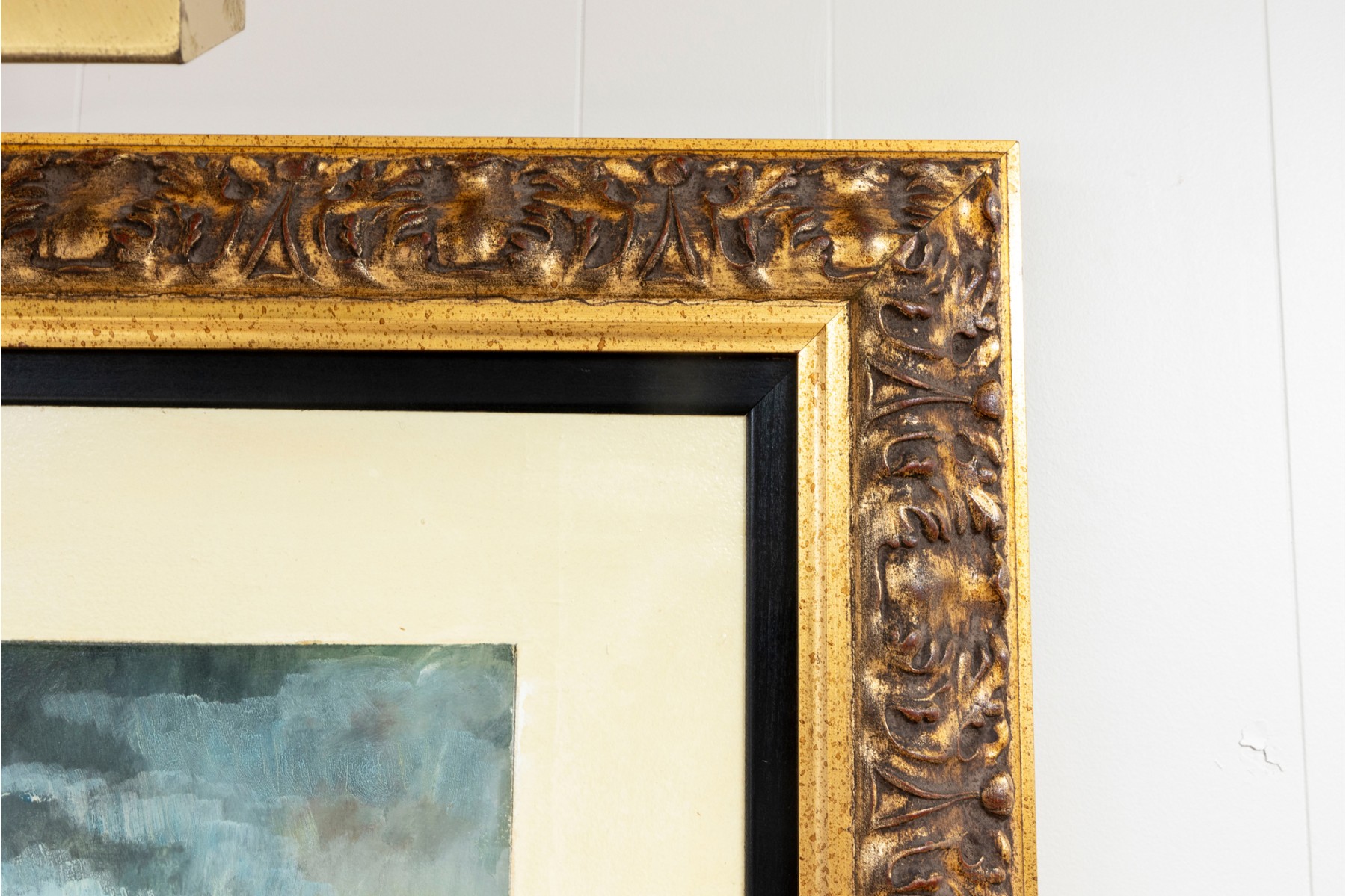 A large original oil painting by Italian painter Luigi Ullio presented in a grand and ornate wood frame adorned with an overhead light.