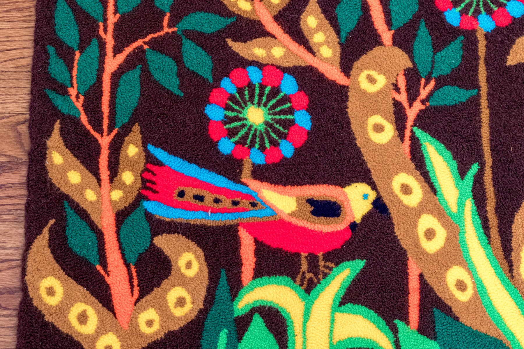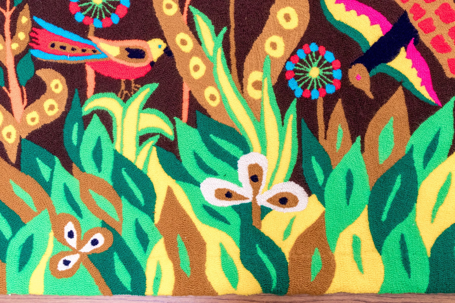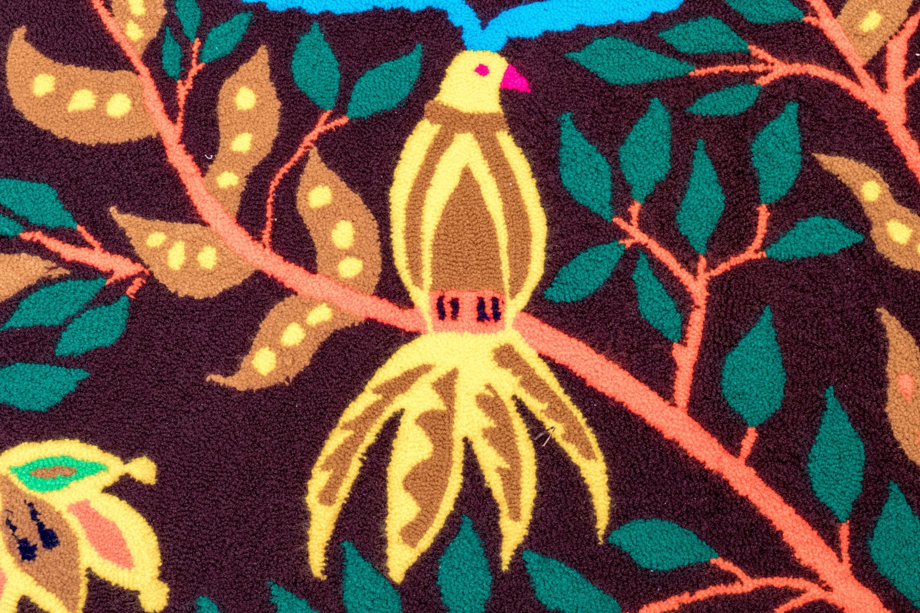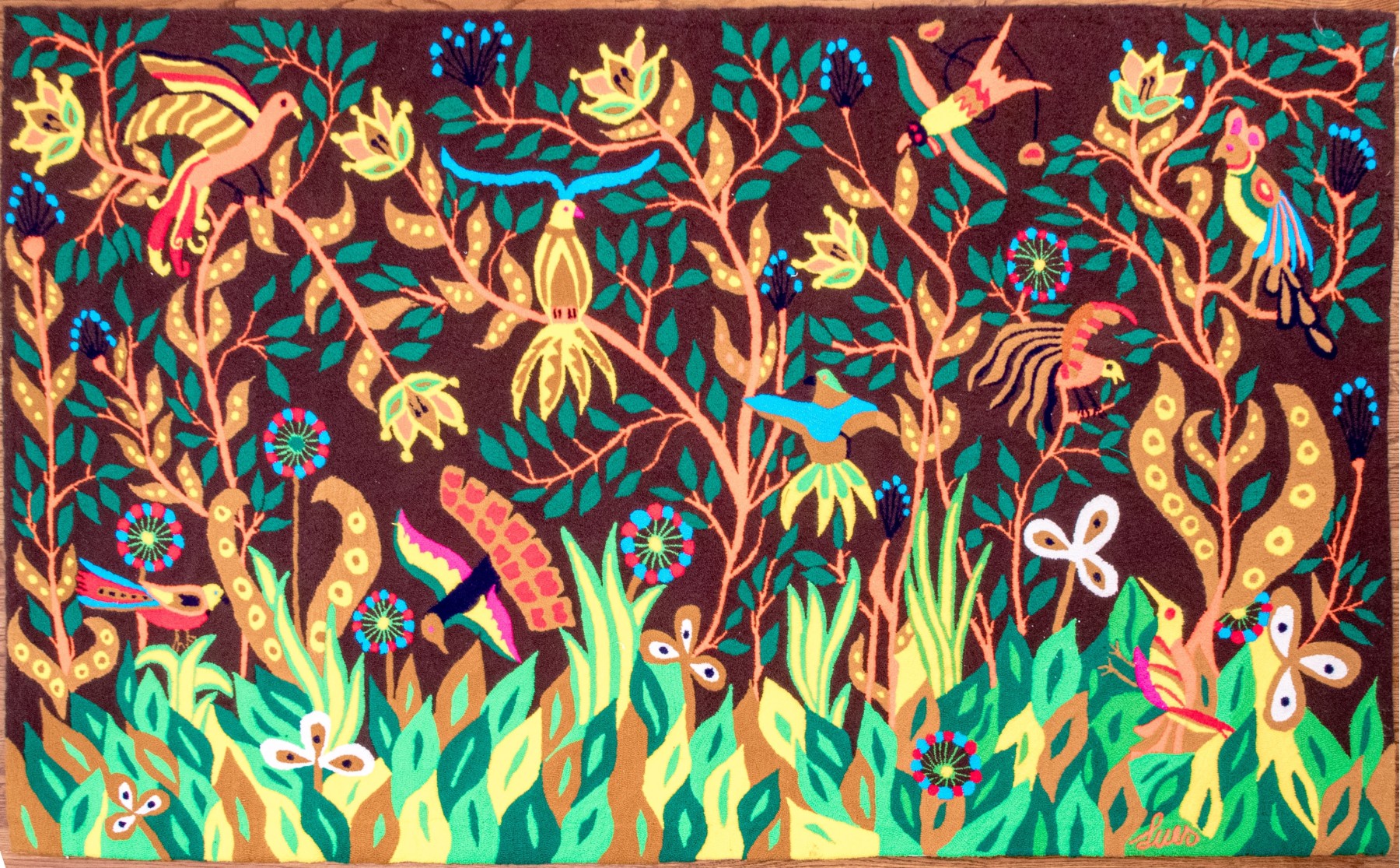 Luis Montiel, (Venezuelan, 1914-1998) wool tapestry depicting a lush jungle scene of birds perched on flowering foliage in teal green, yellow, orange, red, and blue, leading down to flowers and grass in captivating green, teal, brown, and yellow. Signed integrated into the tapestry lower right.