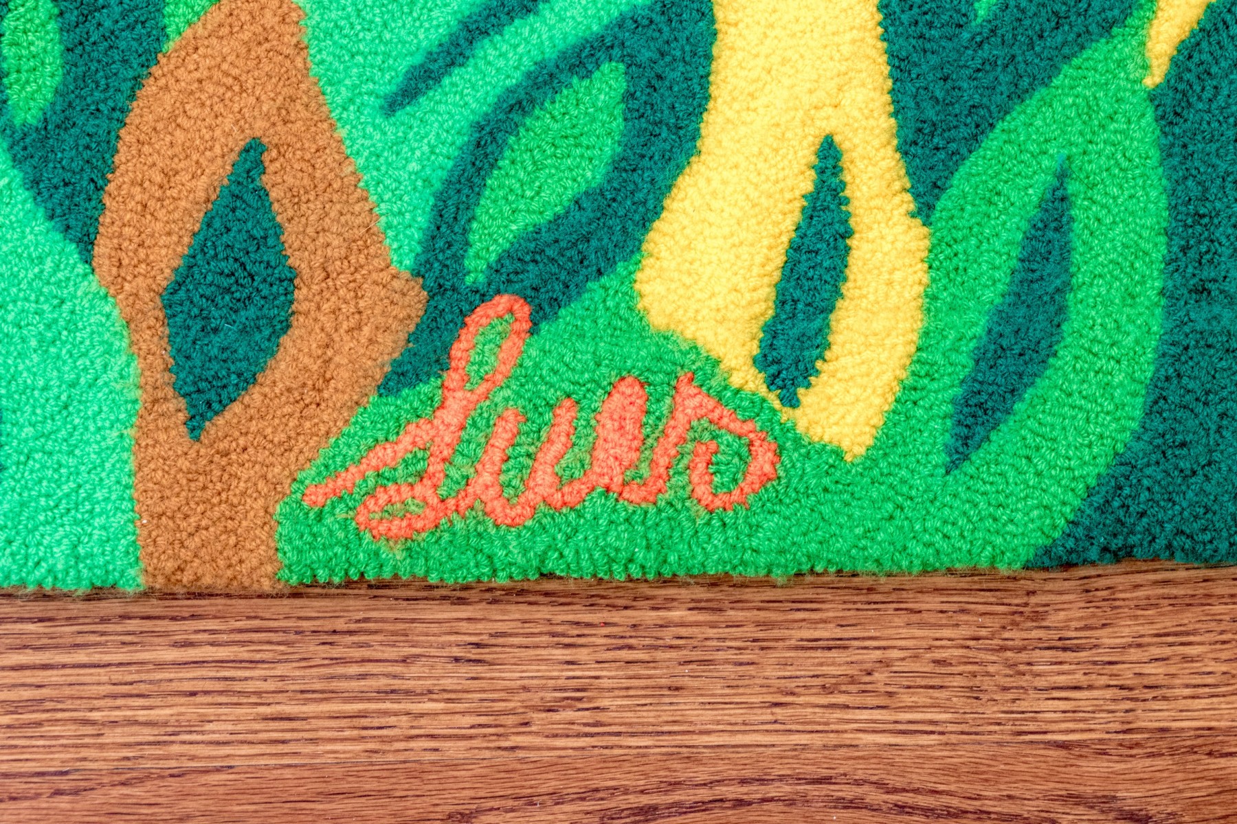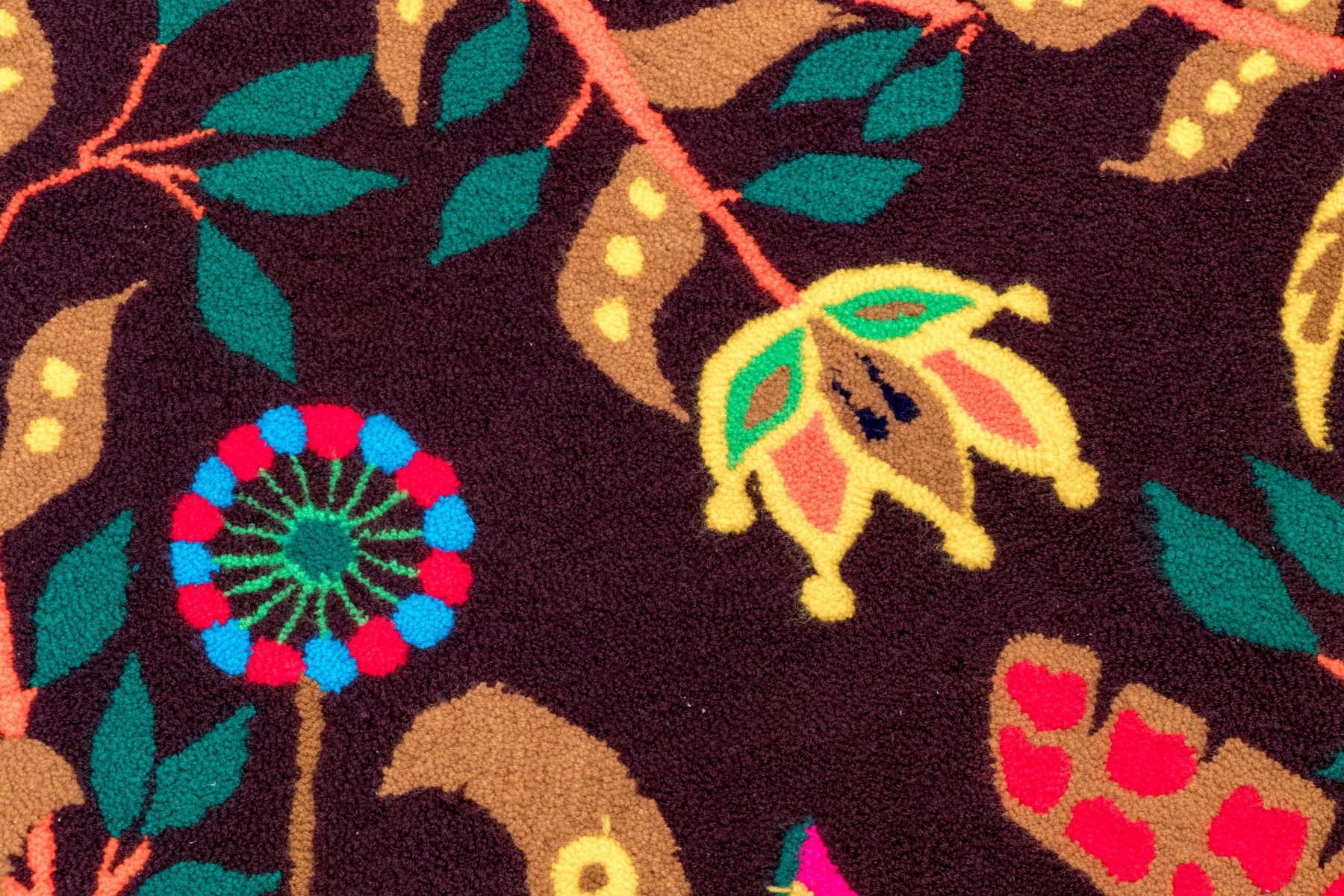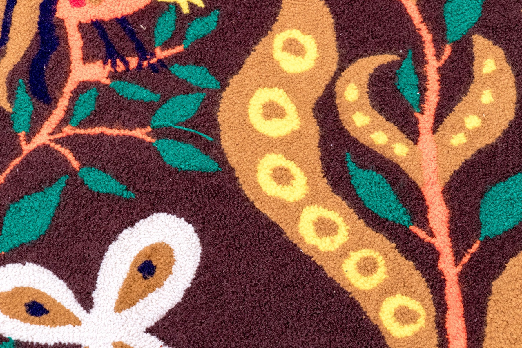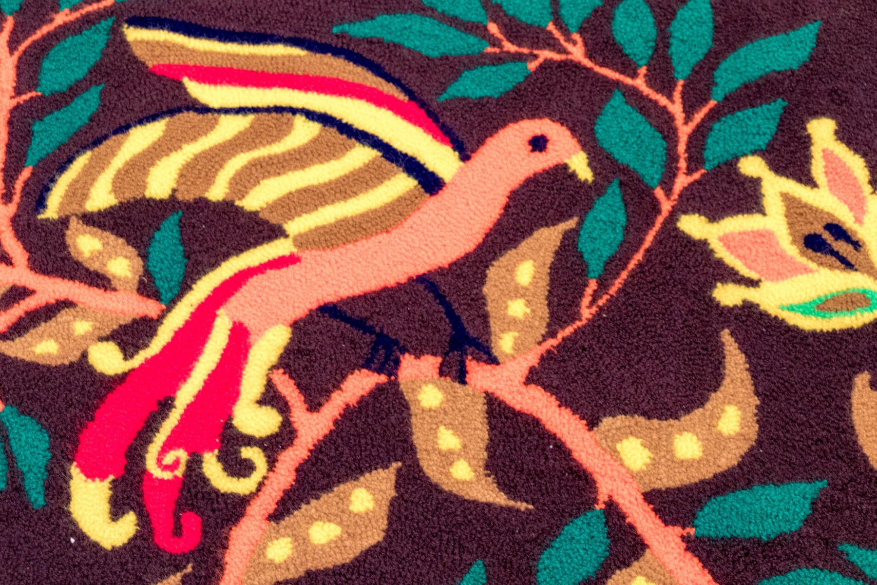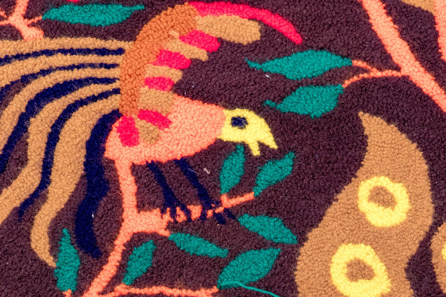 Luis Montiel, (Venezuelan, 1914-1998) wool tapestry depicting a lush jungle scene of birds perched on flowering foliage in teal green, yellow, orange, red, and blue, leading down to flowers and grass in captivating green, teal, brown, and yellow. Signed integrated into the tapestry lower right.