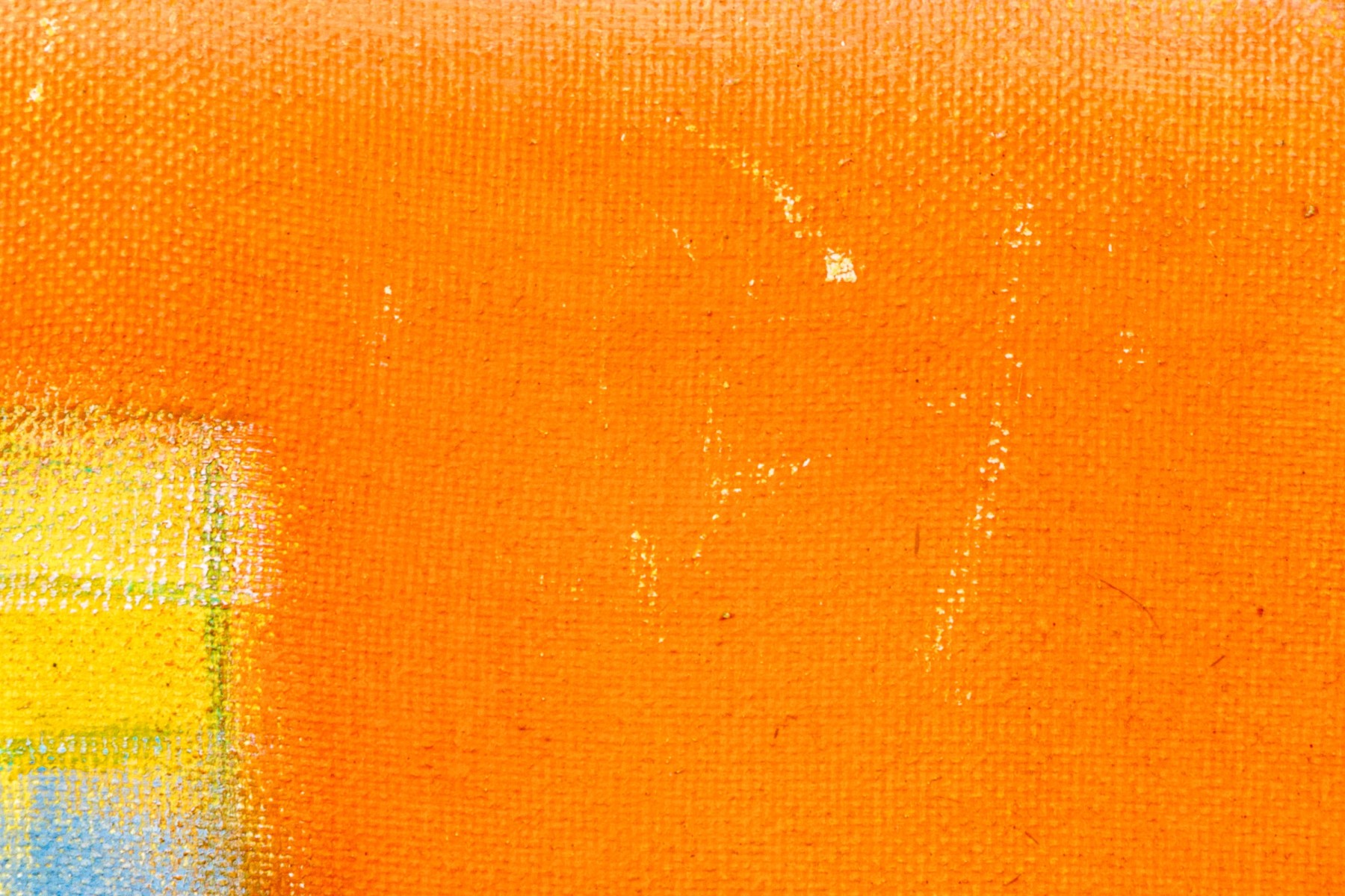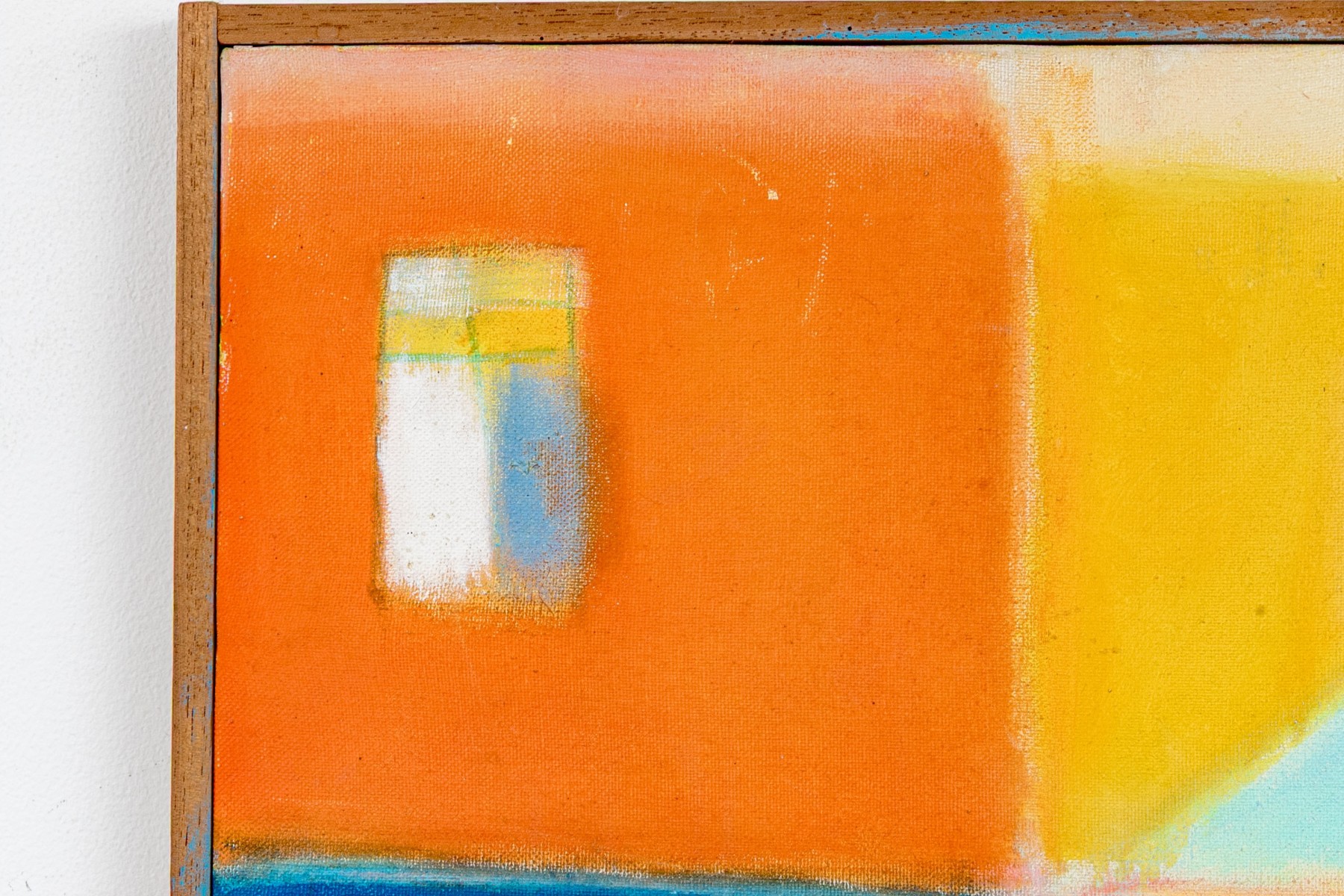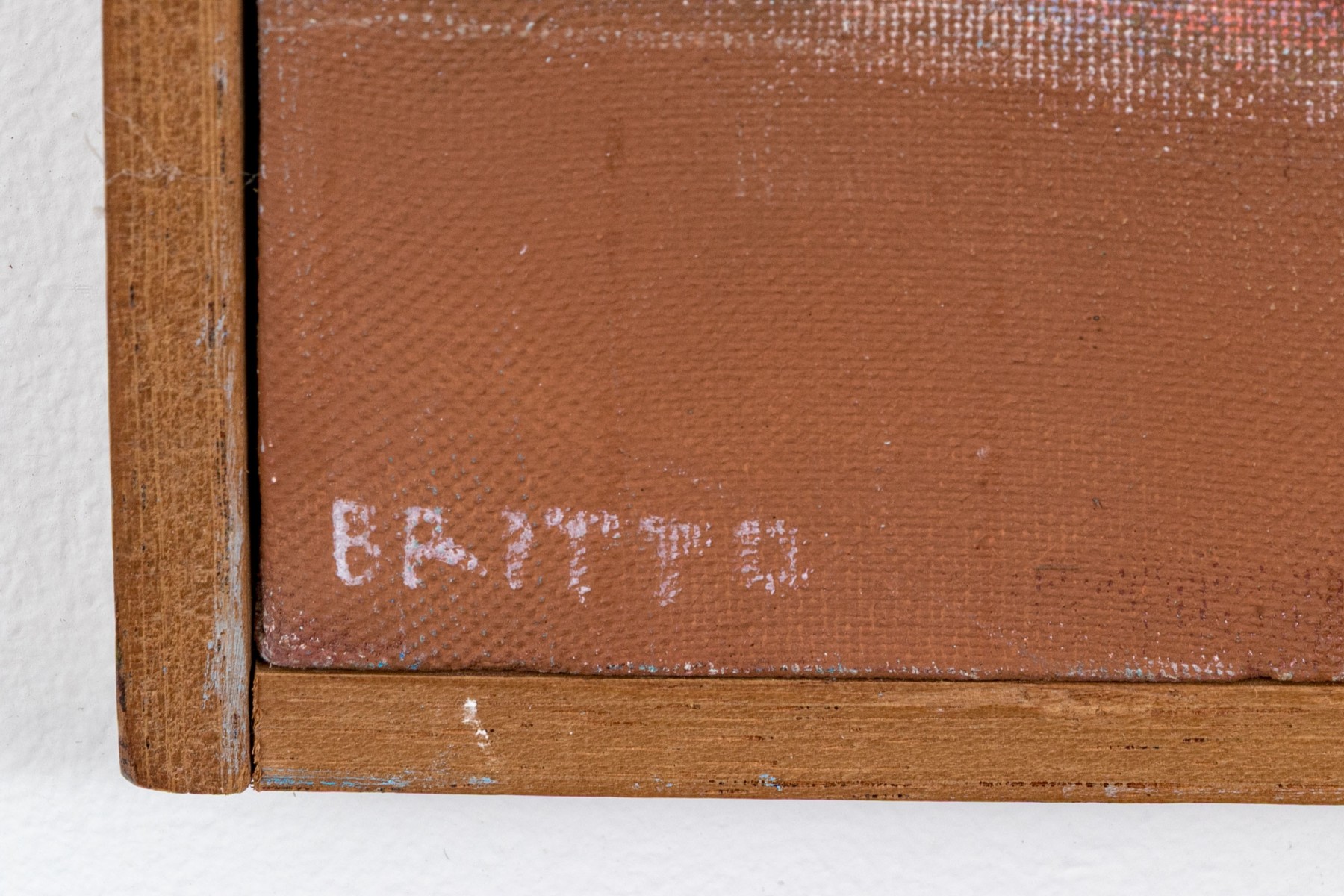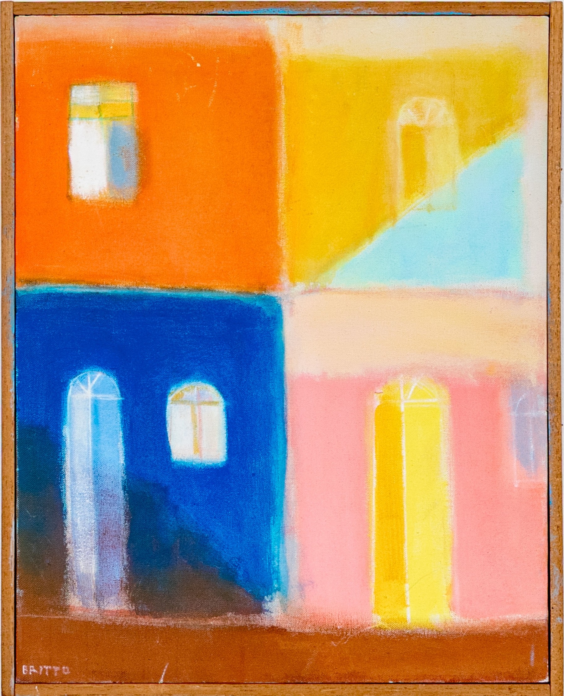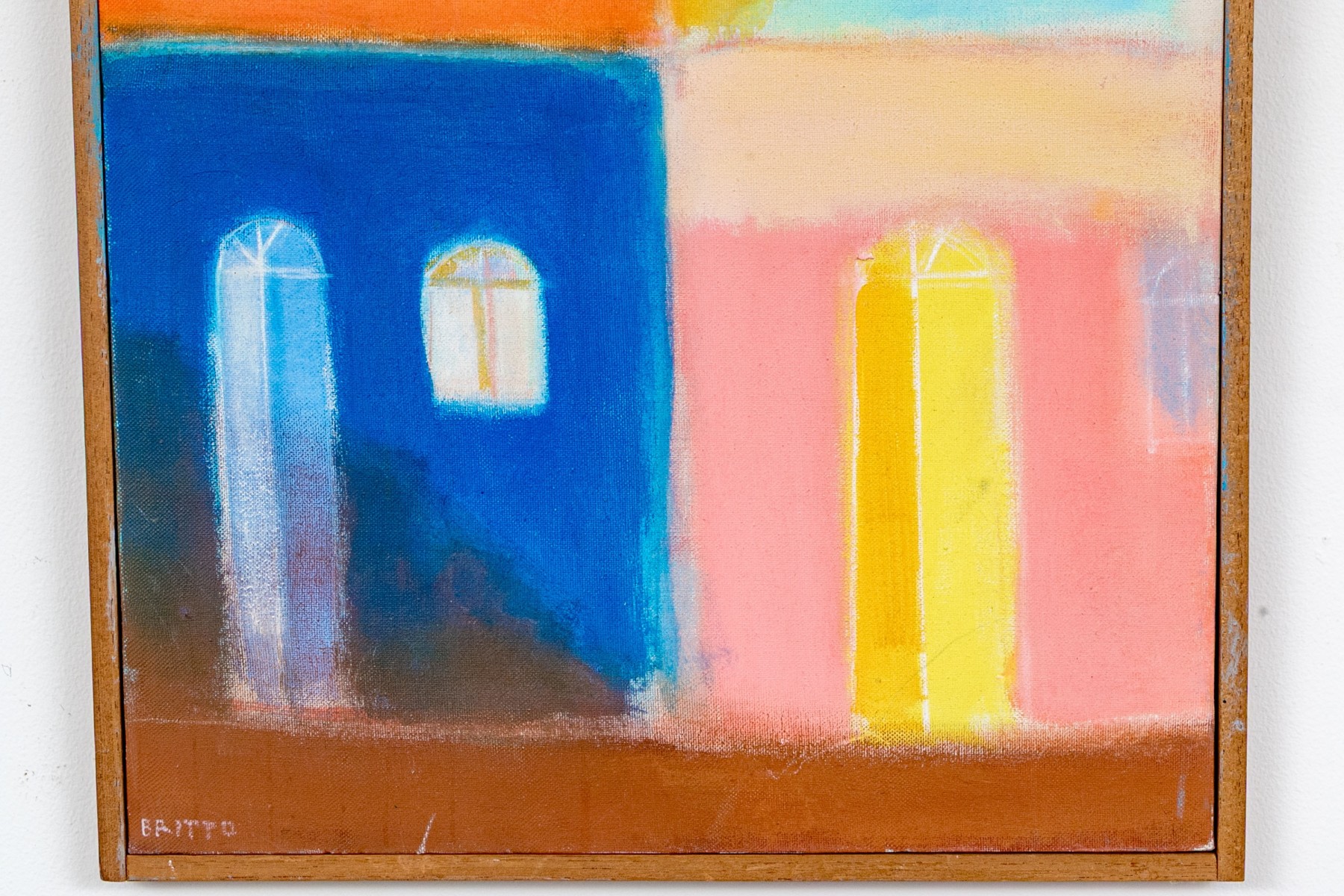 Luiz Britto (Brazilian, 20th C.) "Casas" oil painting on canvas depicting a vibrant expressionist building facade with quadrants in orange, yellow, blue, and pink featuring arched doors and windows along a brown ground. Signed lower left and on the verso with the title and date of 1987.