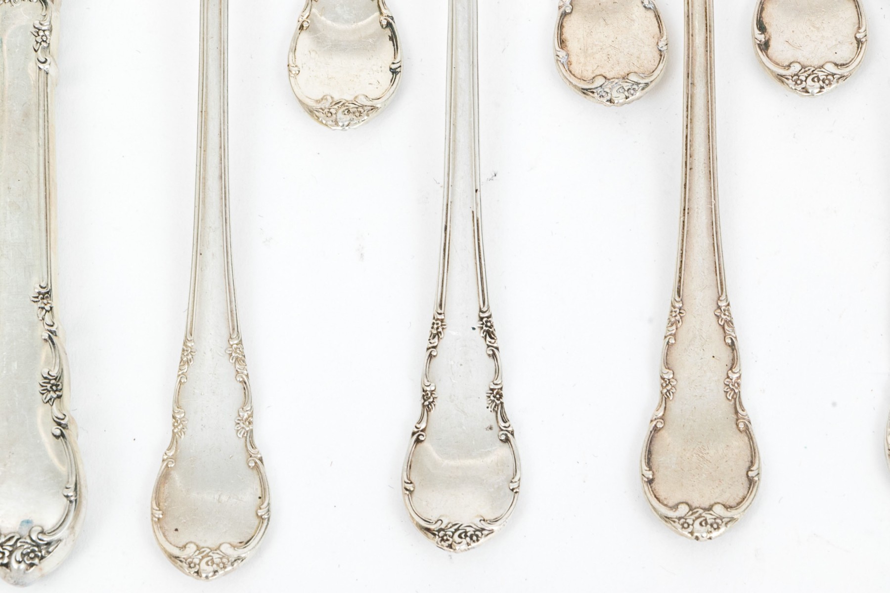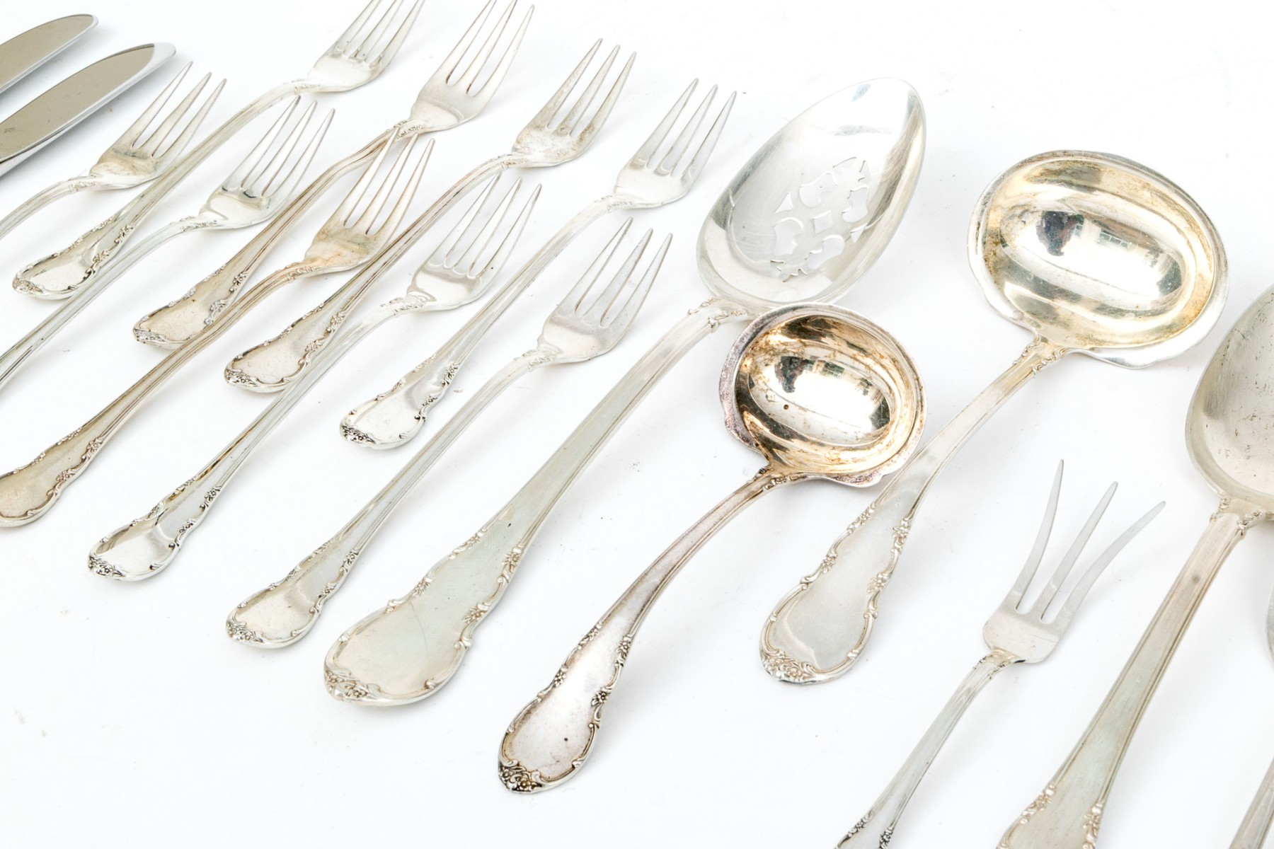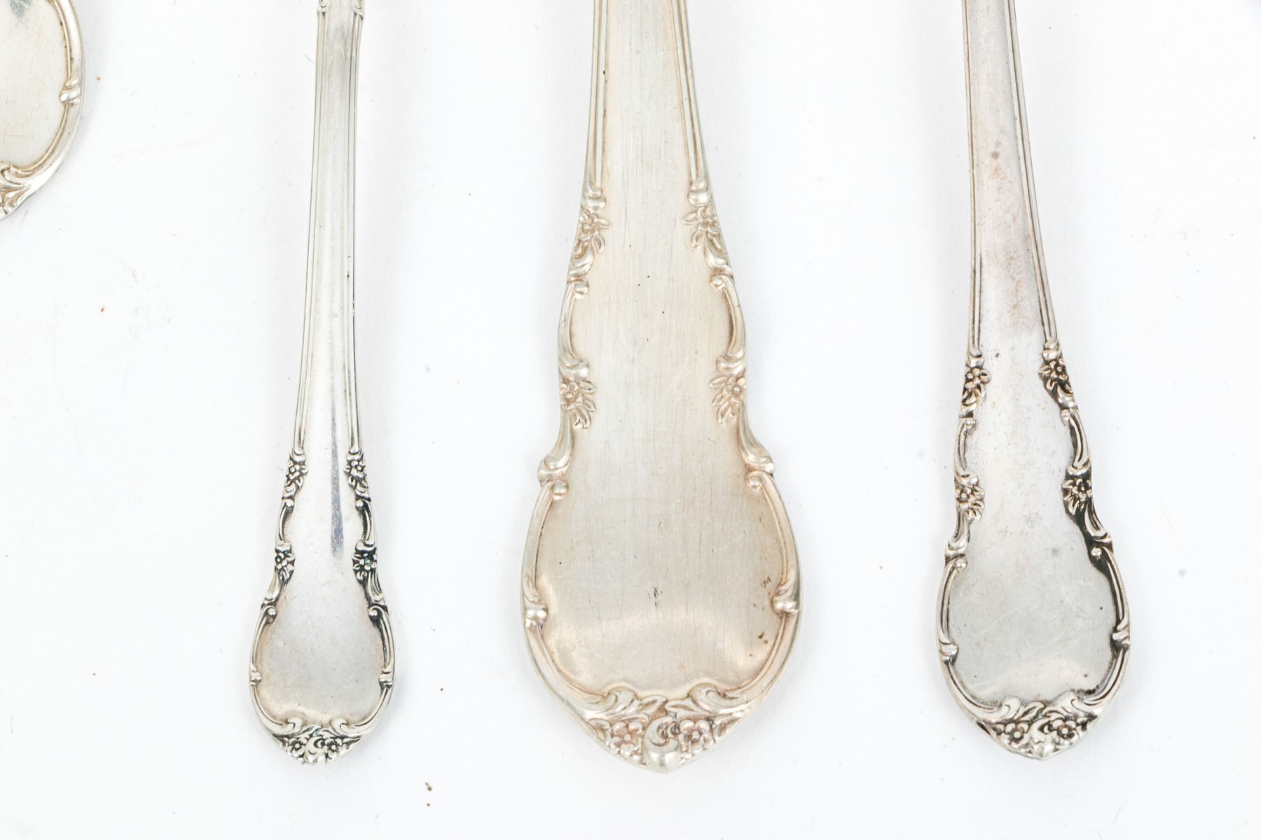 A collection of Lunt "Modern Victorian" sterling silver flatware featuring elegantly tapered necks and serpentine handles with dainty floral relief. The collection includes: