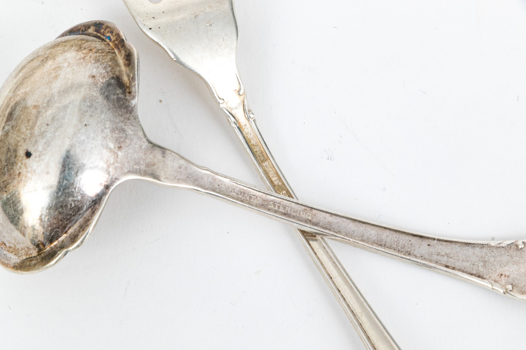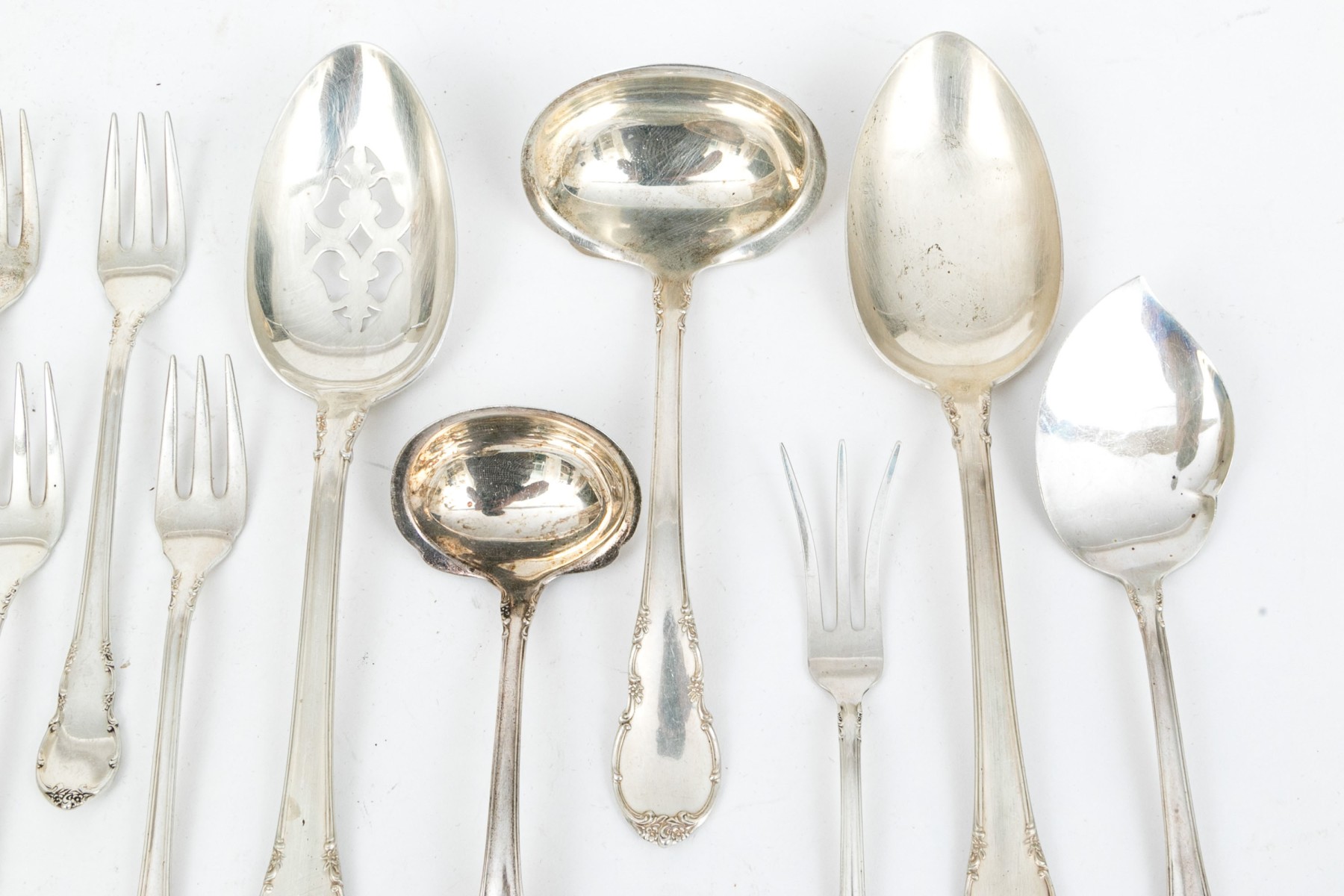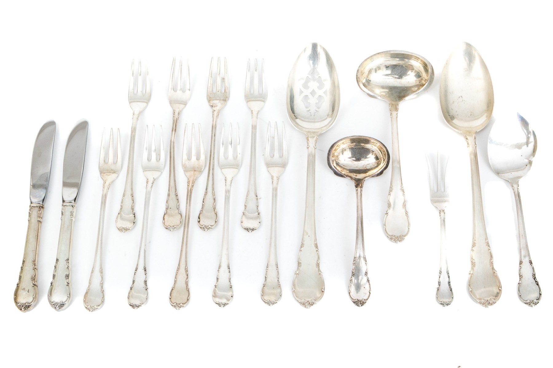 A collection of Lunt "Modern Victorian" sterling silver flatware featuring elegantly tapered necks and serpentine handles with dainty floral relief. The collection includes: