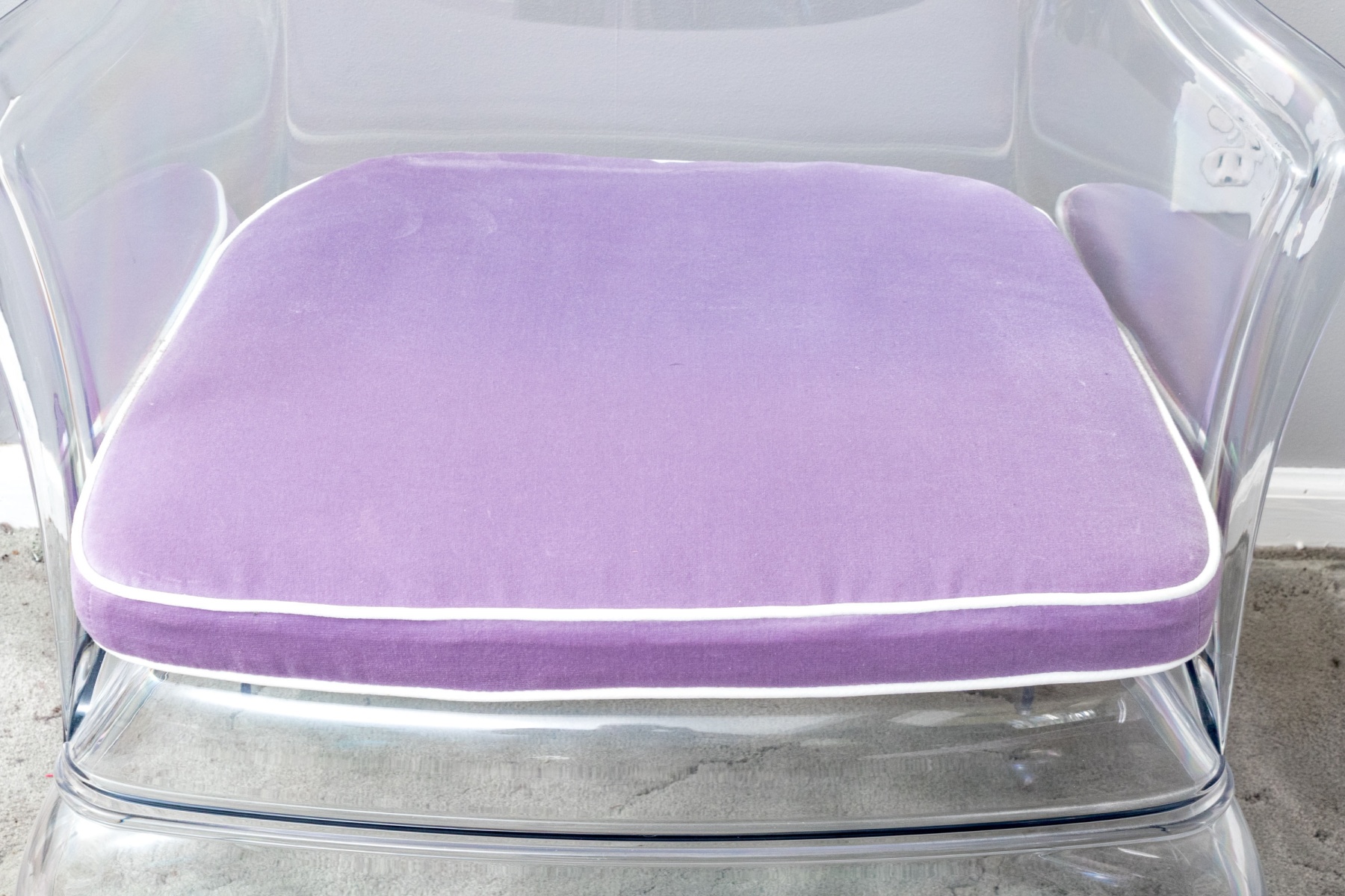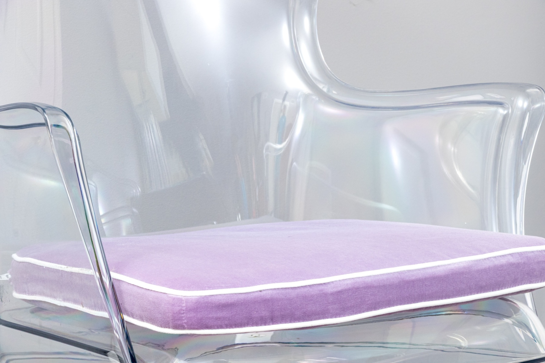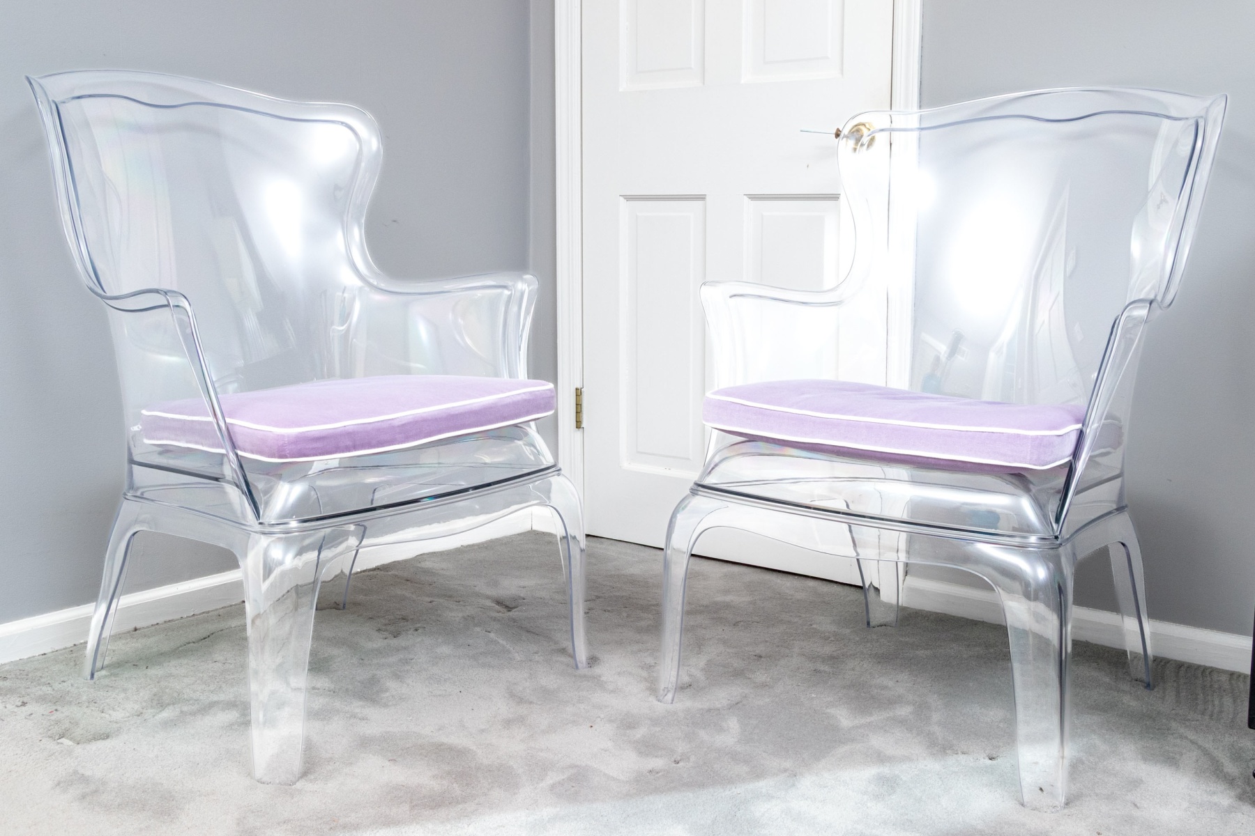 A chic pair of Pedrali "Pasha 660" clear polycarbonate armchairs blending contemporary style with elegant Louis XV tradition with camelbacks, wing sides, and sleek curved arms leading down to domed seats topped by custom light purple cushions finished with white piped trim. The chairs are detailed with serpentine aprons and completed with gently rounded legs. Marked on the aprons.