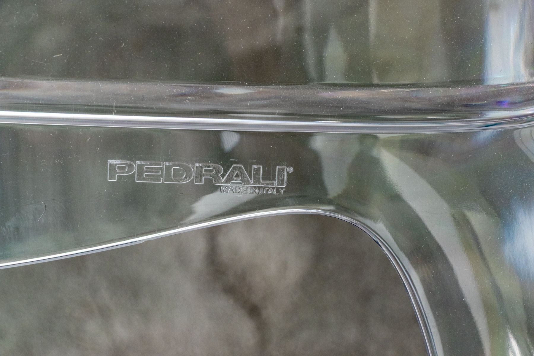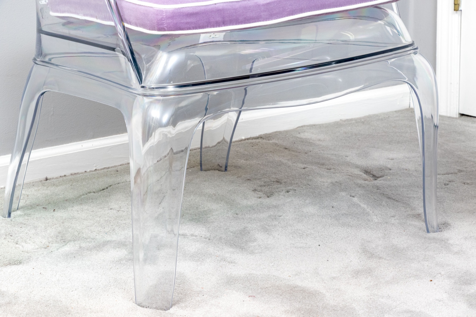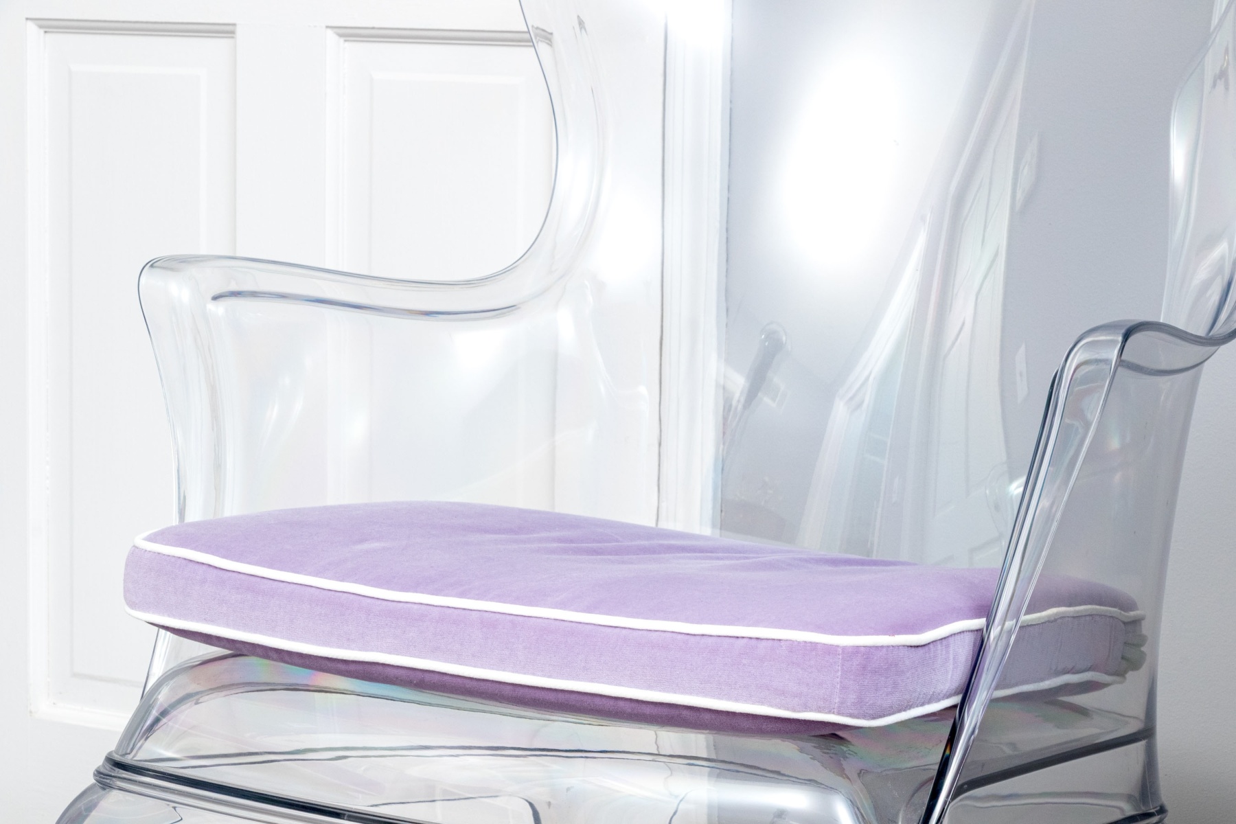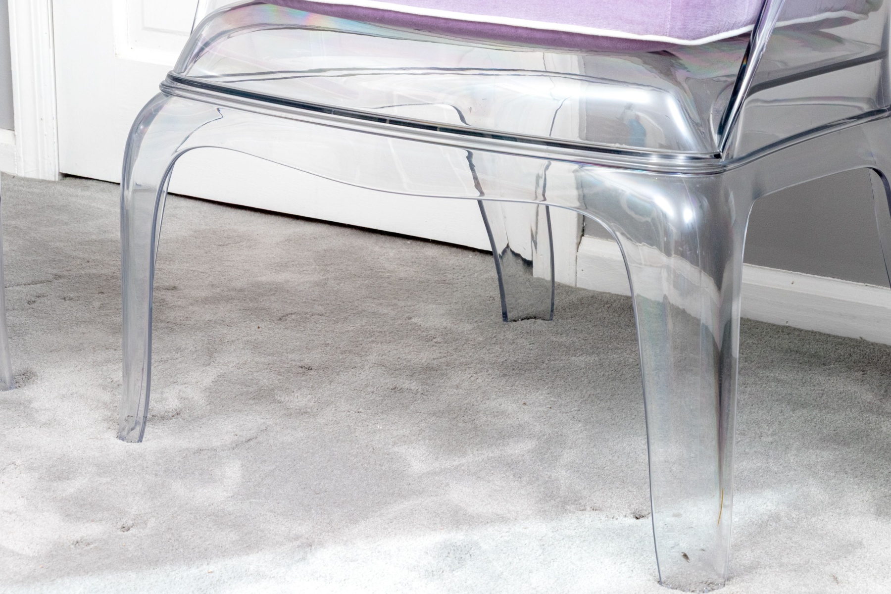 A chic pair of Pedrali "Pasha 660" clear polycarbonate armchairs blending contemporary style with elegant Louis XV tradition with camelbacks, wing sides, and sleek curved arms leading down to domed seats topped by custom light purple cushions finished with white piped trim. The chairs are detailed with serpentine aprons and completed with gently rounded legs. Marked on the aprons.