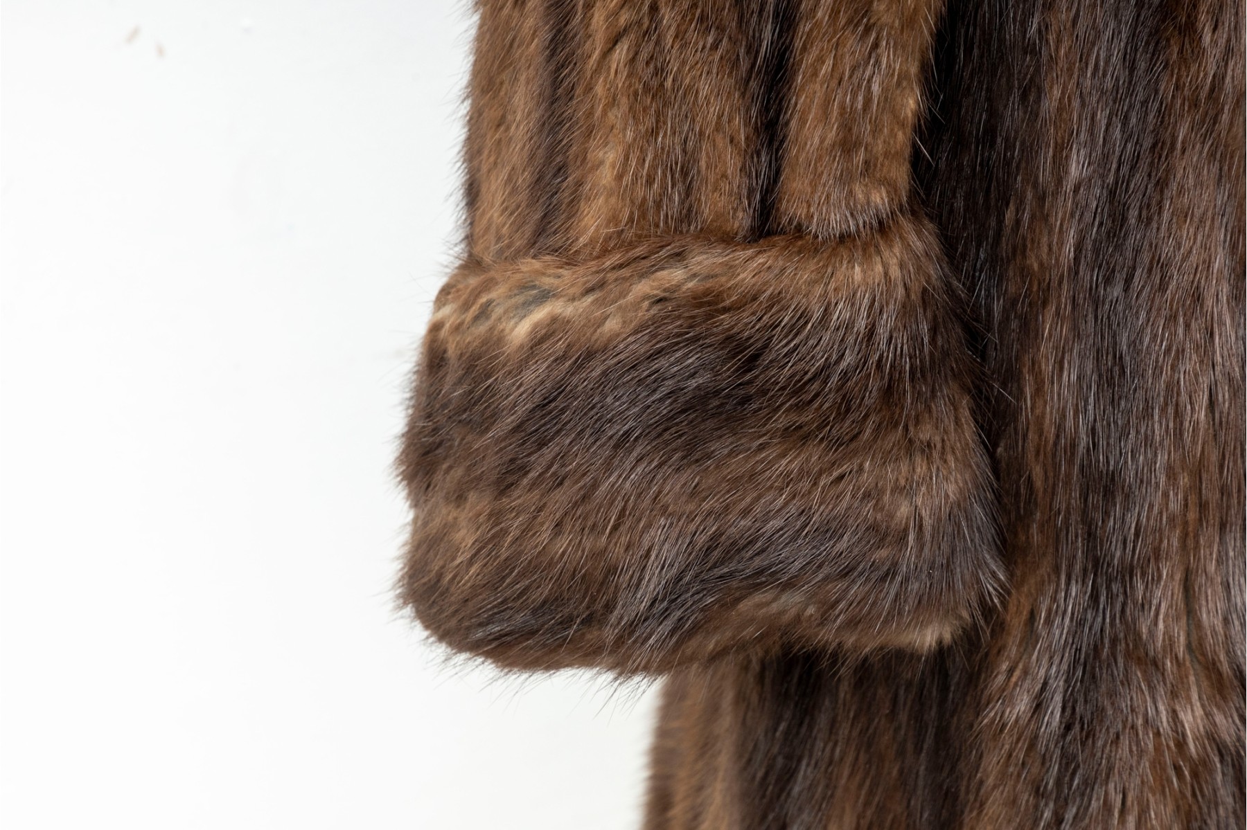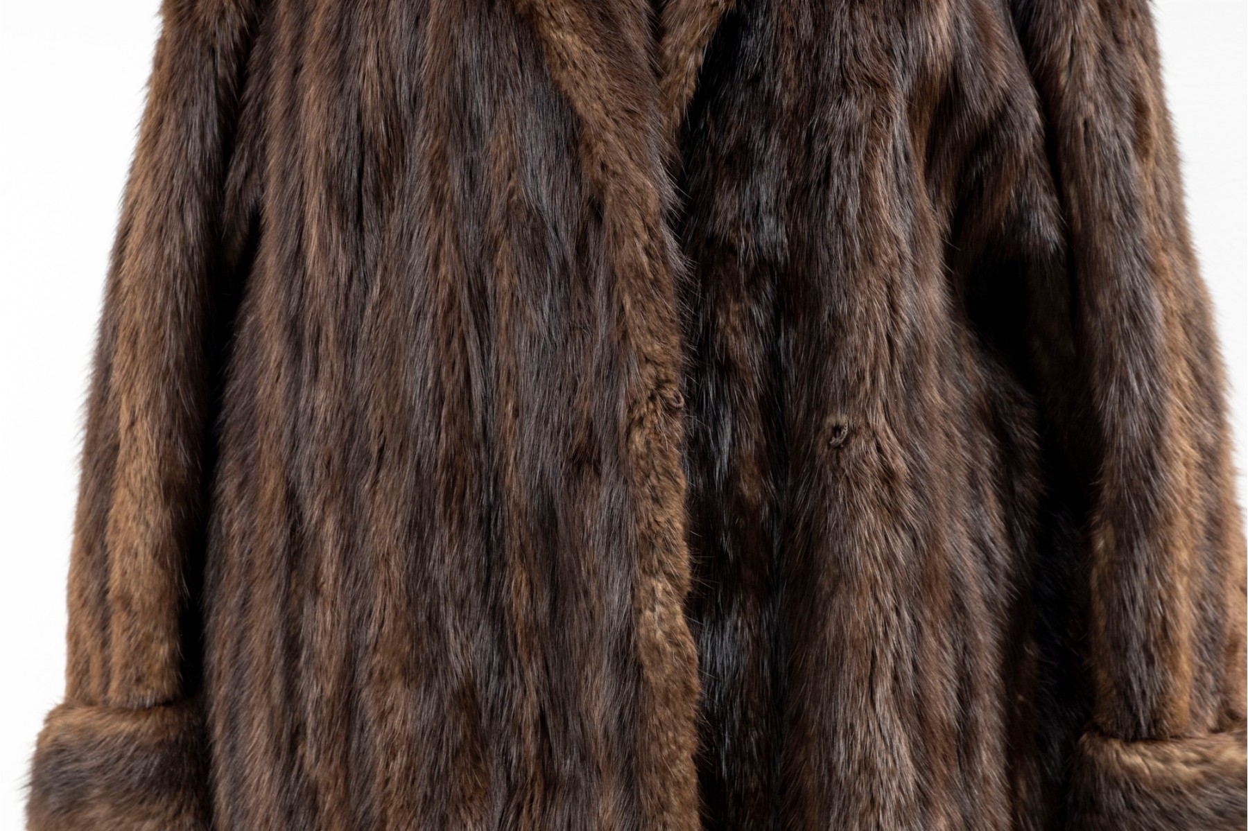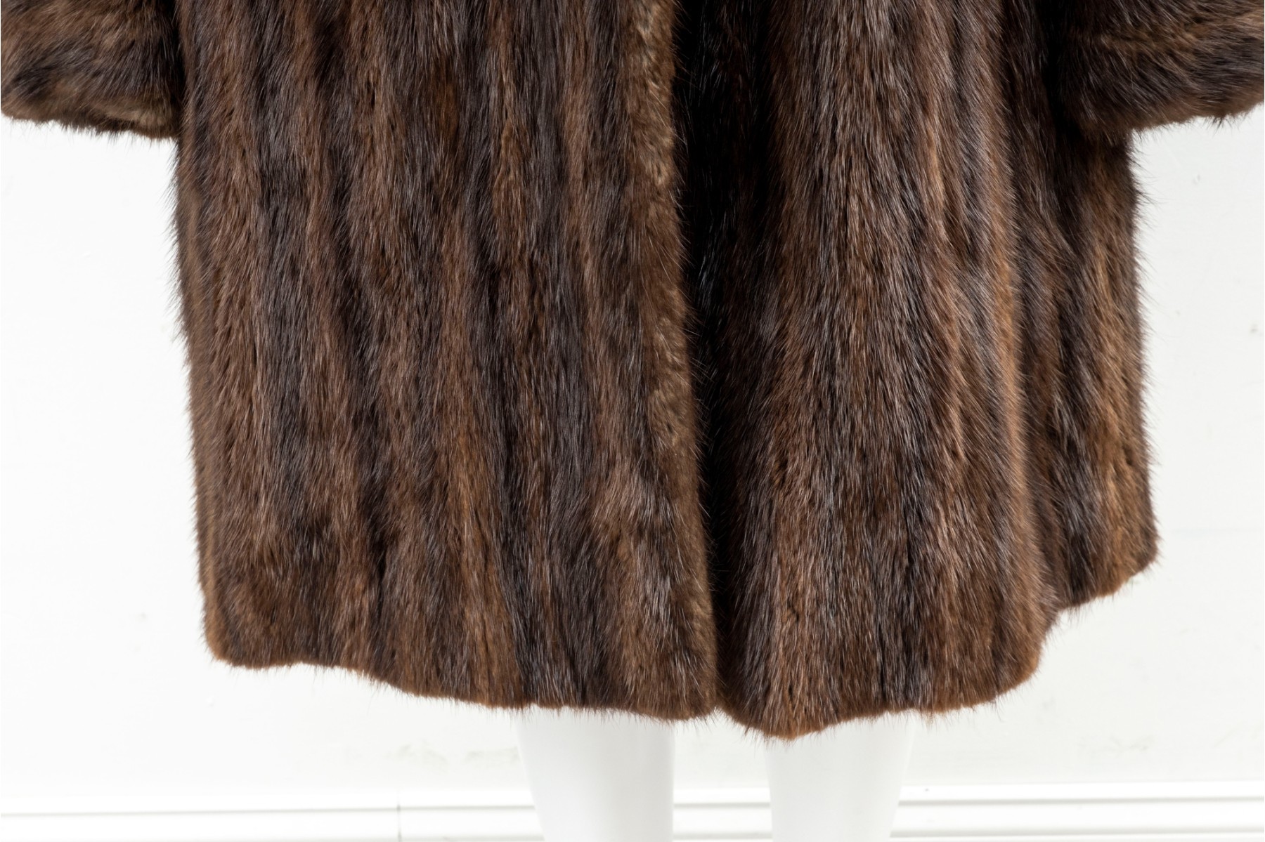 A luxurious, classic fur coat in rich chocolate brown, featuring a gently rolled collar and cuffs. The fur is soft and nicely vertically striated with light and dark brown shades, making for an elegant and visually striking appearance.