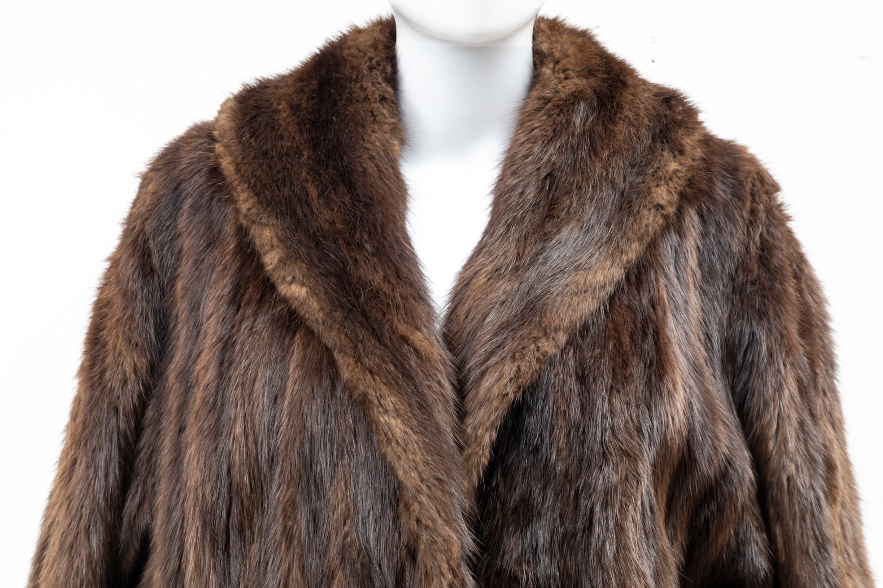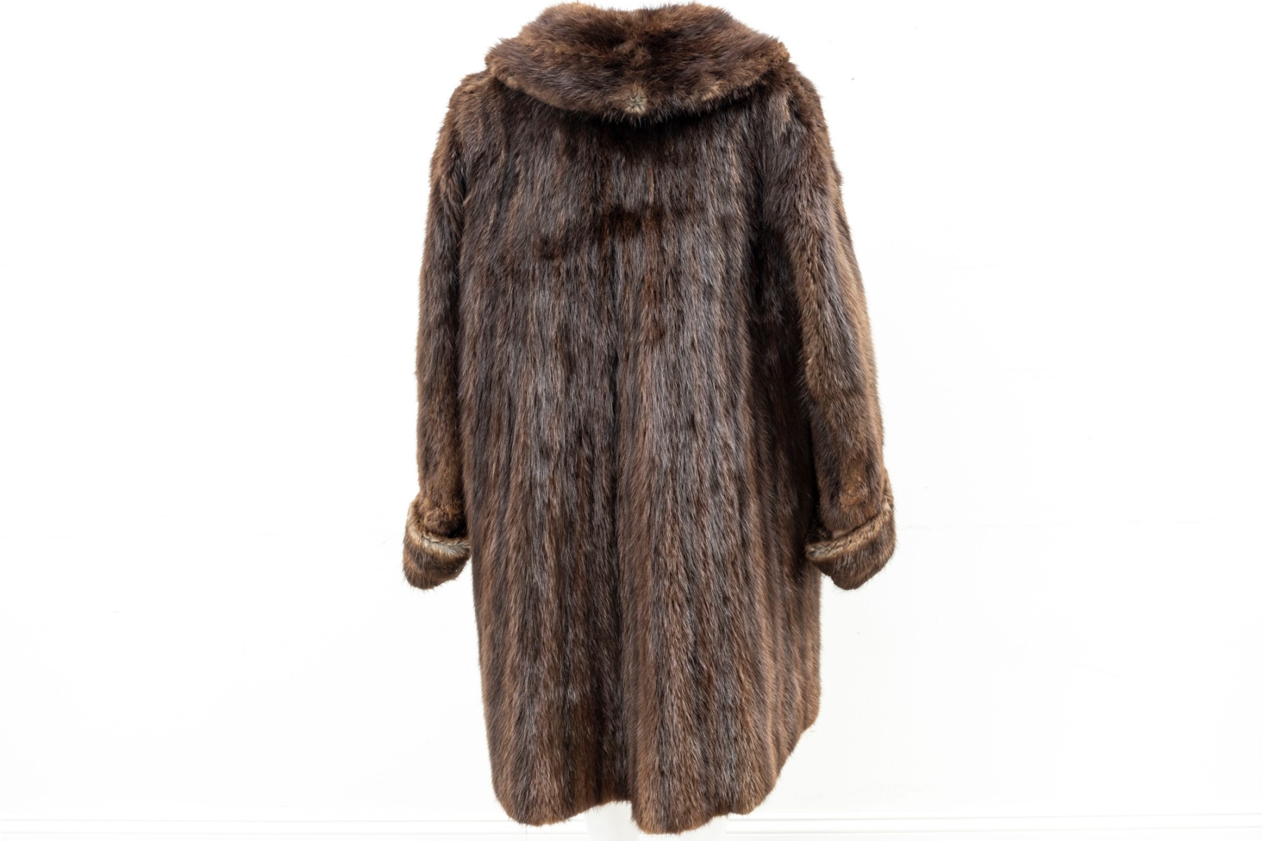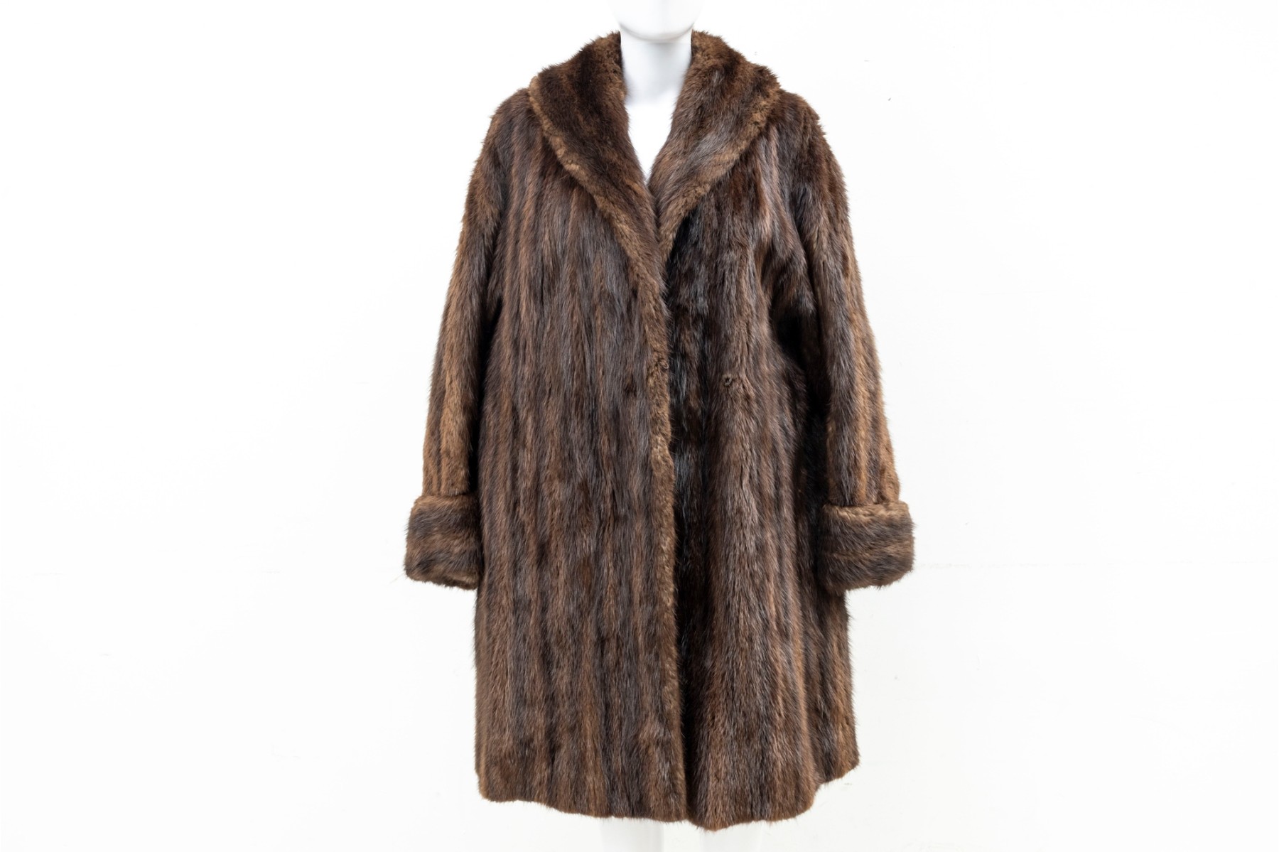 A luxurious, classic fur coat in rich chocolate brown, featuring a gently rolled collar and cuffs. The fur is soft and nicely vertically striated with light and dark brown shades, making for an elegant and visually striking appearance.