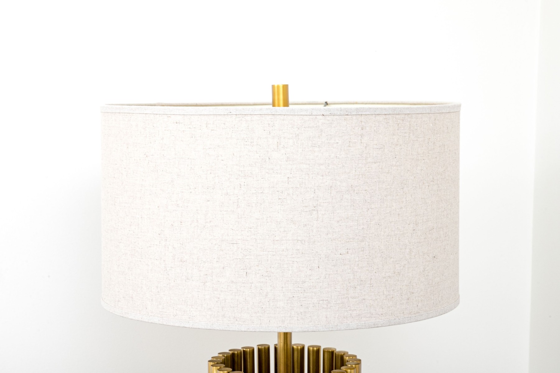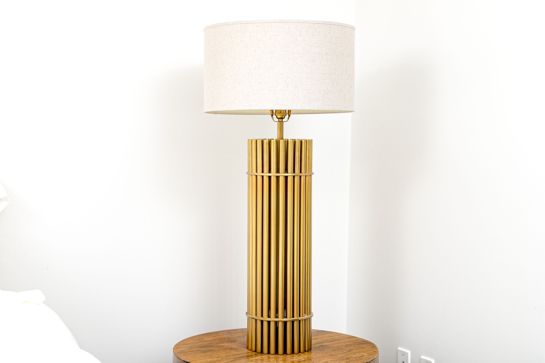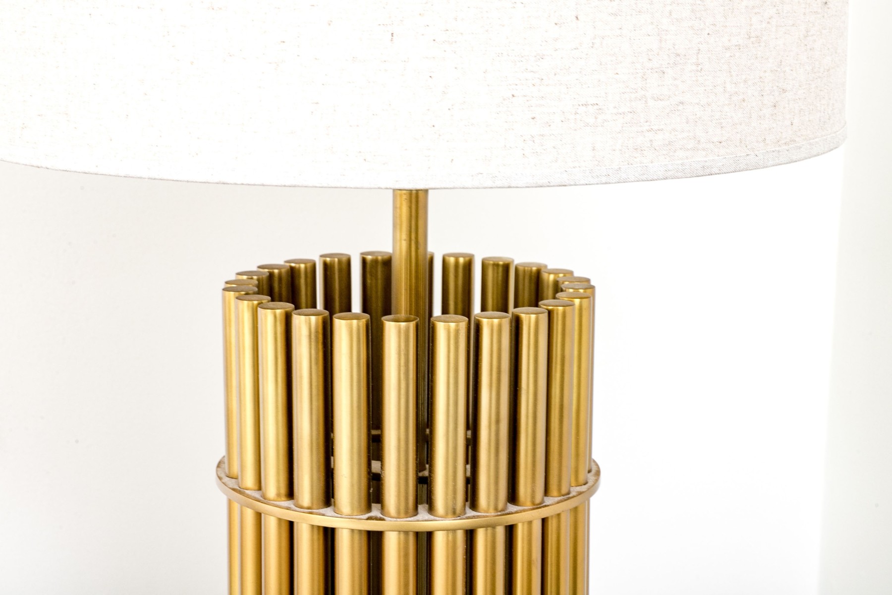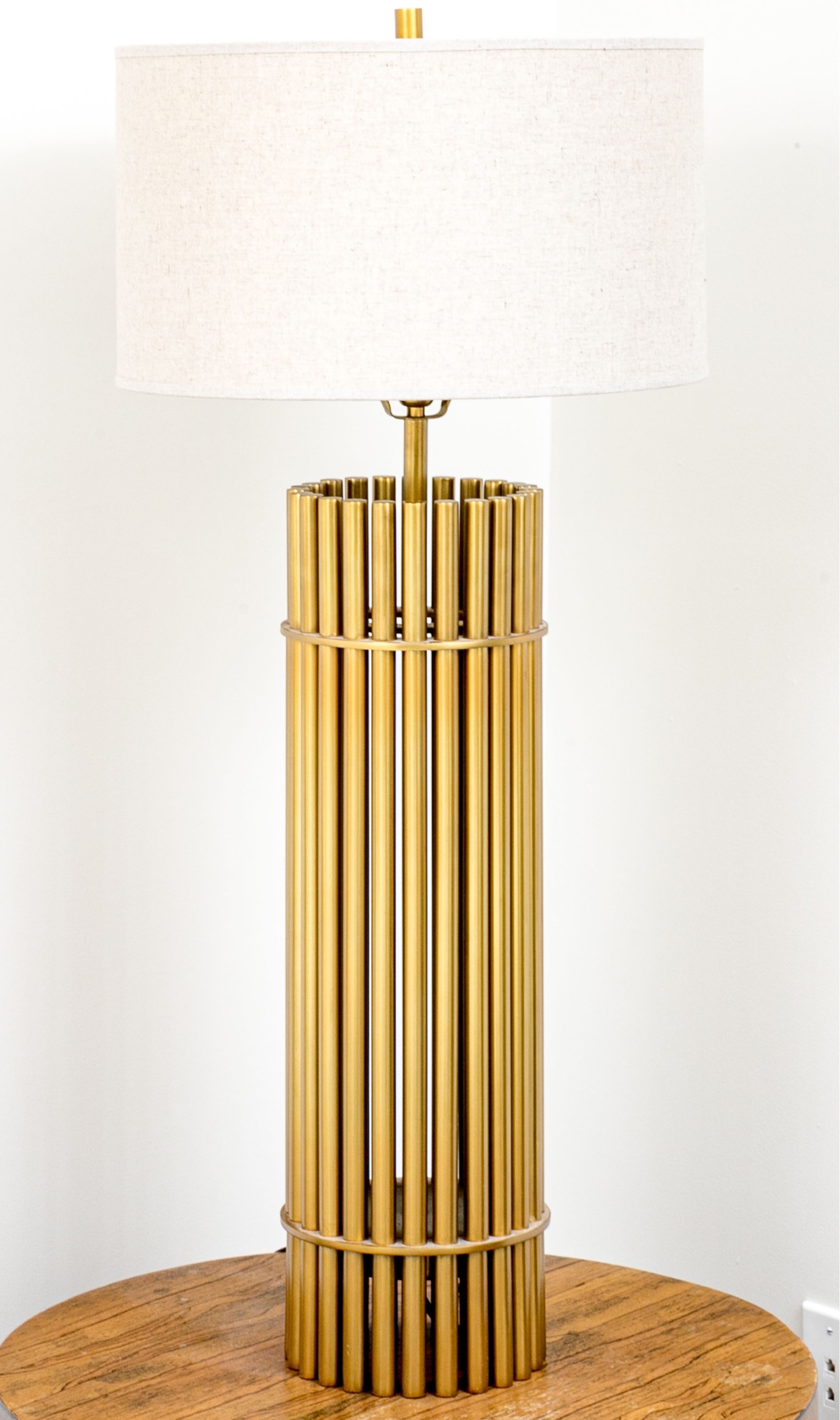 A luxuriously modern table lamp with a touch of Hollywood Regency glam, featuring a cylindrical body composed of brass dowels wrapped with two horizontal bands. Surmounted with a cylindrical lamp shade.