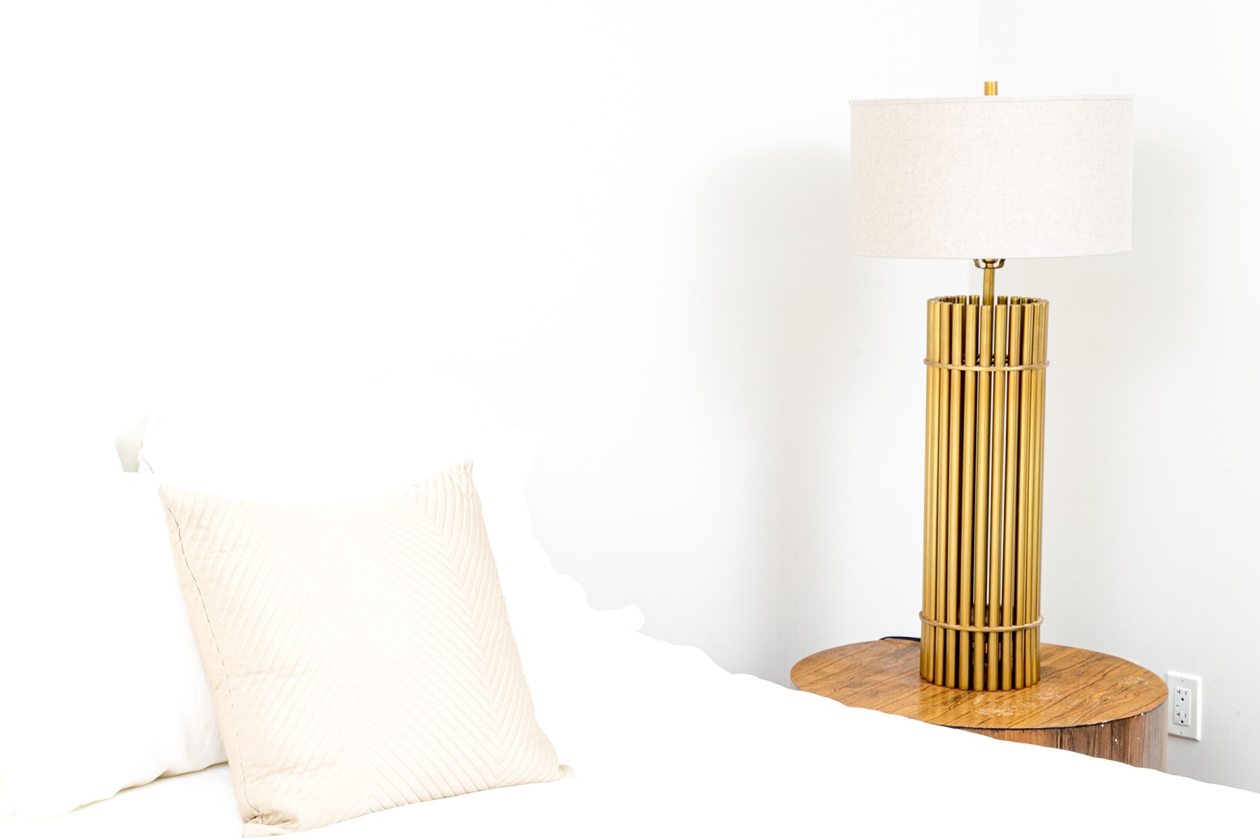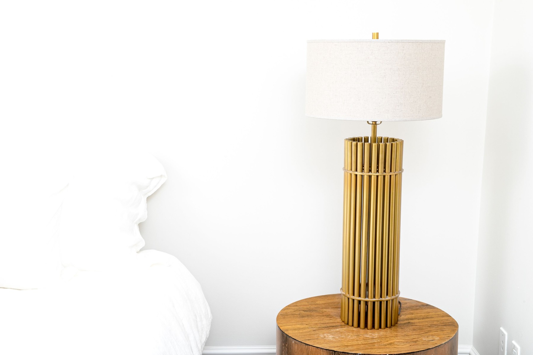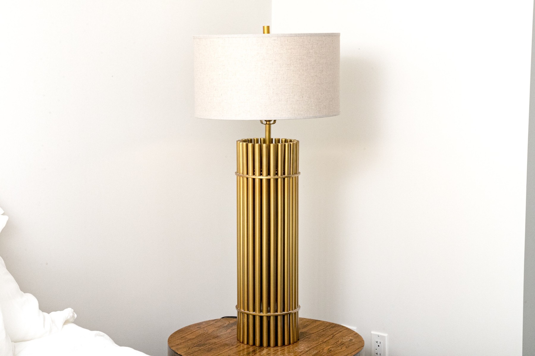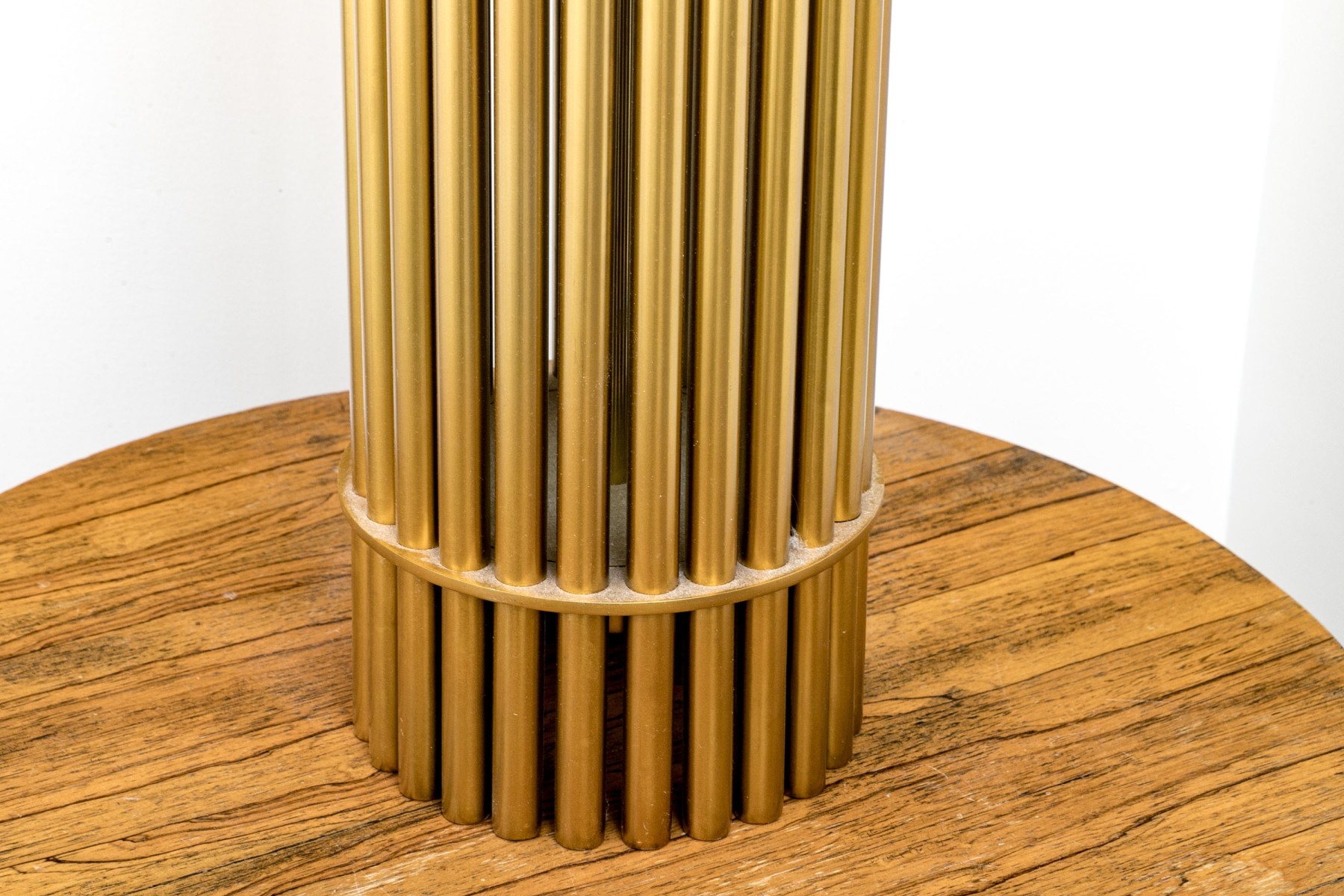 A luxuriously modern table lamp with a touch of Hollywood Regency glam, featuring a cylindrical body composed of brass dowels wrapped with two horizontal bands. Surmounted with a cylindrical lamp shade.